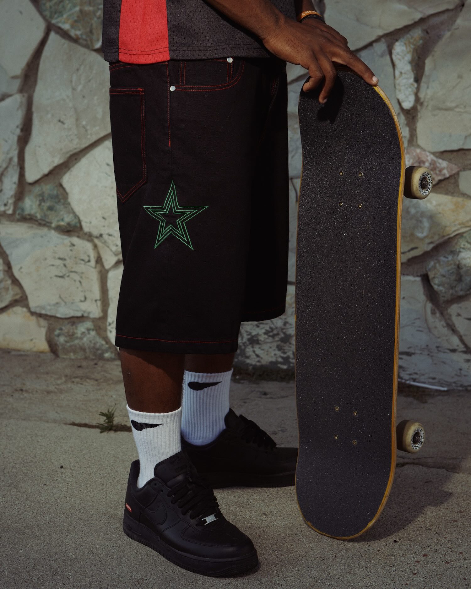 The stand-out pieces, however, are the RGB Mesh Jersey and RGB Contrast Jean Shorts, dressed in the colors of the Pan-African flag, symbolizing Black unity and solidarity. The jersey is a reimagination of a traditional NFL jersey, symbolizing the unique blend of athleticism and creative freedom that defines skateboarding. The jean shorts continue the Black unity theme with an embroidered star motif, symbolizing the Black Star of Africa, while also featuring embroidery of the CSC logo and an outline of a skater.