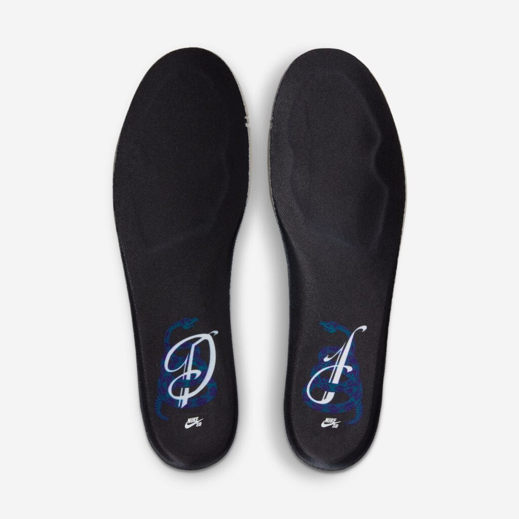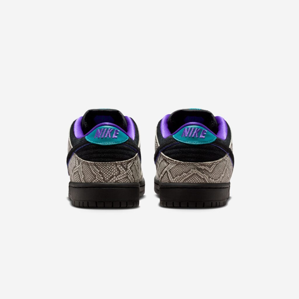 The shoe itself immediately stands out with a faux snakeskin overlay, a burst of rich purple lining the interior, and teal heel tabs. The black suede panels keep the Swoosh understated, and branding on the tongue is stitched in teal alongside Jordan’s name stitched below it. What keeps the design minimal is the black midsole and outsole. A fun detail on the shoe is the small bronzed copperhead with its fangs clinging to the black laces. Jordan knows how to make a stylish shoe, one that’s perfect not just in the eyes of skaters and sneakerheads, but that you might get compliments from outside the community, as Jordan did when he talked about wearing them during an interview with Sneaker News.
