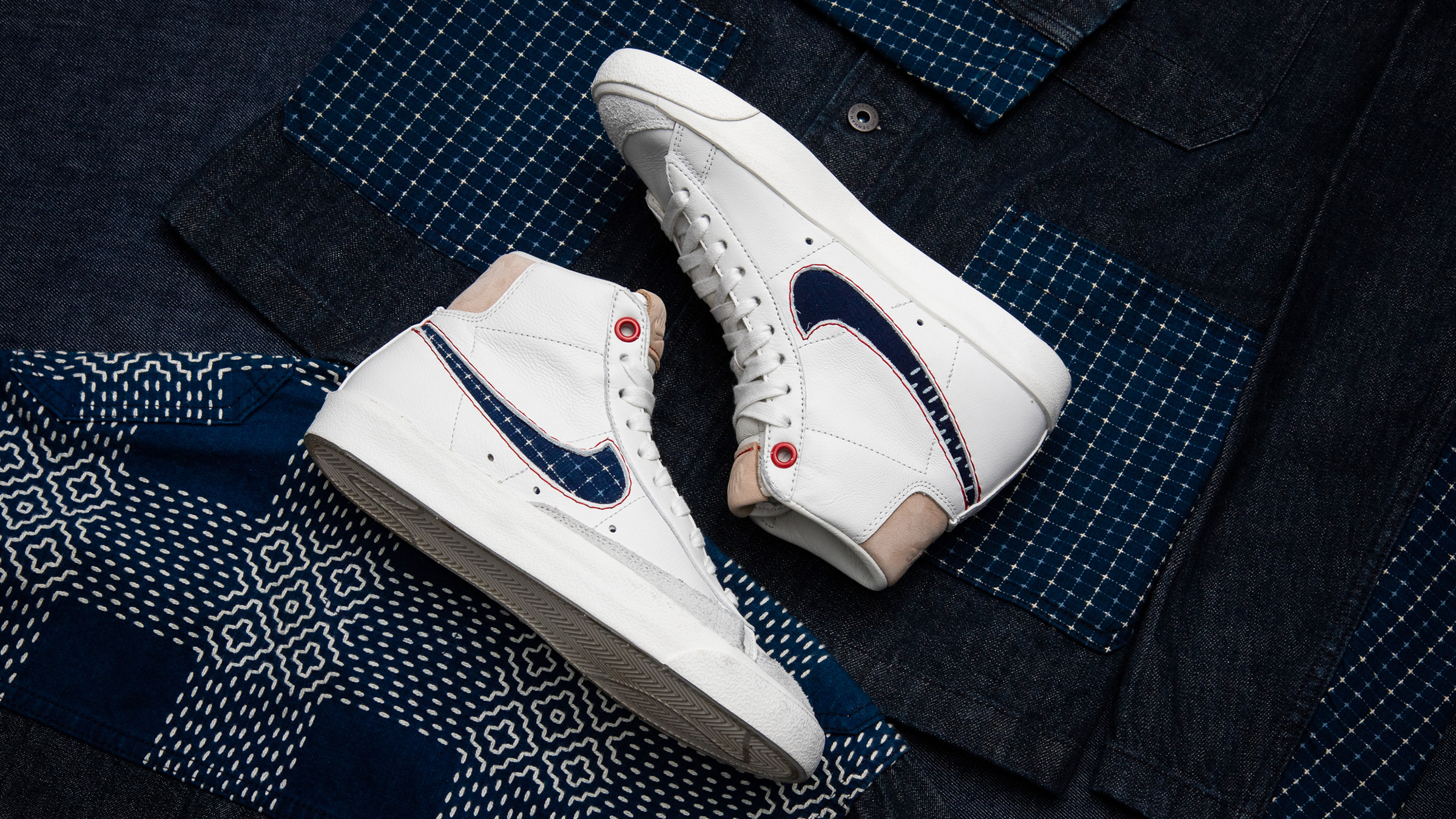 This Blazer Mid takes on some of the same design cues as the Denham Air Max 1, most notable with the Swooshes, which are carved out from the shoe’s white leather upper to reveal the sashiko stitches, indigo checkered denim and indigo fishbone patterns seen previously on the Air Max 1. Other returning design cues include the red stitching around the Swooshes and on the tongue tag, the tan nubuck used for the tongue tag and heel plate, and the red leather insoles adorned in scissor logos.