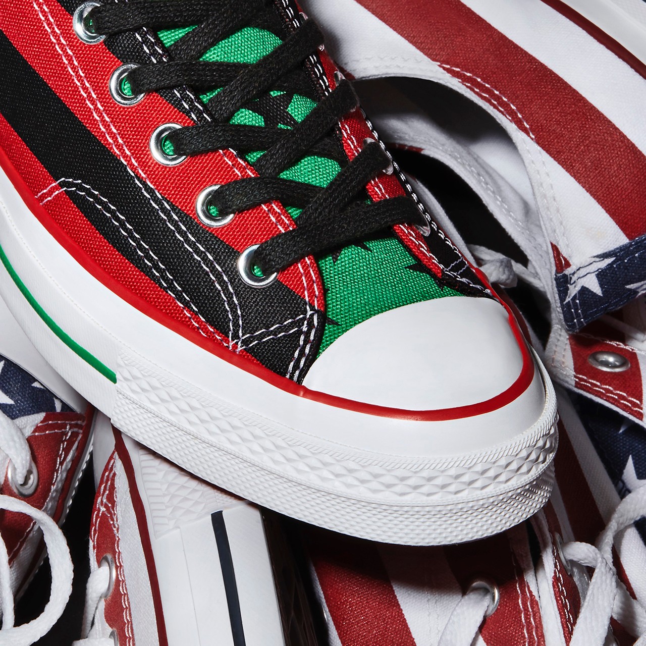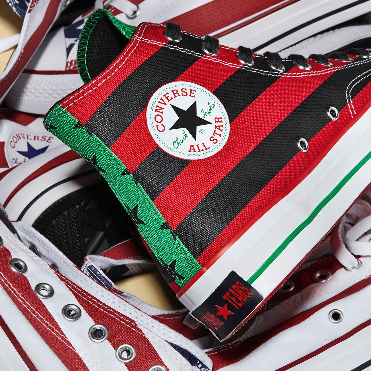 The models use the African-American flag, which transforms the traditional stars and bars using the colors of Marcus Garvey’s Pan-African flag. Denim Tears’ All Stars use this flag’s green and black stars on the shoe’s tongues and heel piping, while the bigger panels on the upper are made up of red and black stripes. A green midsole stripe and red outsole complement the patterns, and a DENIM TEARS heel badge cements the model as Emory’s own.