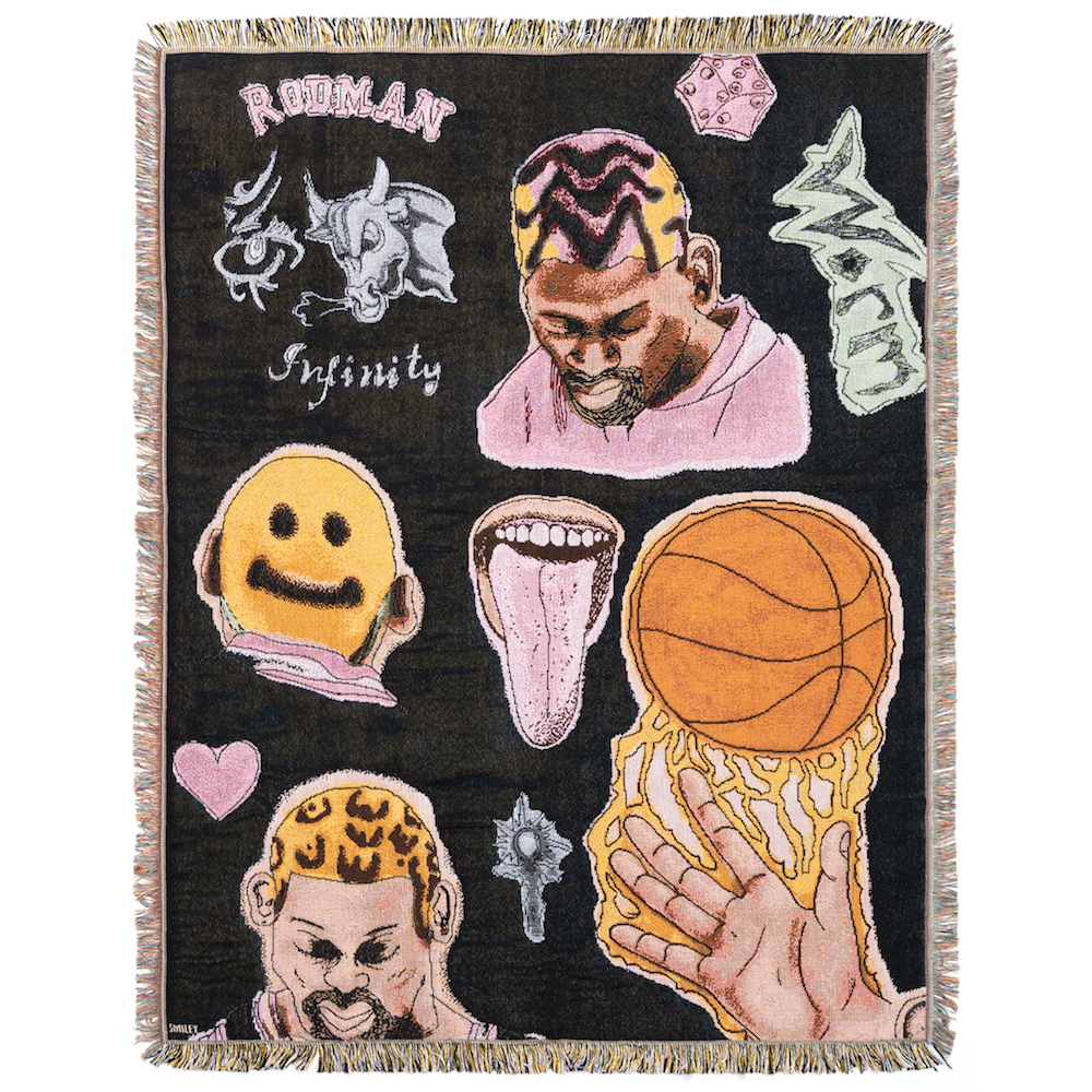 From using his head as a canvas to literally marrying himself, moments from Rodman’s colorful career are highlighted in this 23-piece capsule of apparel and home goods. The apparel ranges from t-shirts, jerseys, shorts, hoodies, joggers, bucket hats, blankets, and pillows. Moments in the designs include the wedding dress moment, various hairstyles, and ’90s Bulls nostalgia. Labels feature a Champion-like logo with a “It takes a little Rodman to make it Market” message. The MARKET team also enlisted Chicago-native and Los Angeles-based artist Stefan Meier to assist with the collection. Meier spent over six hours hand airbrushing 15 unique motifs by hand that make up the all-over print on a few of the pieces.