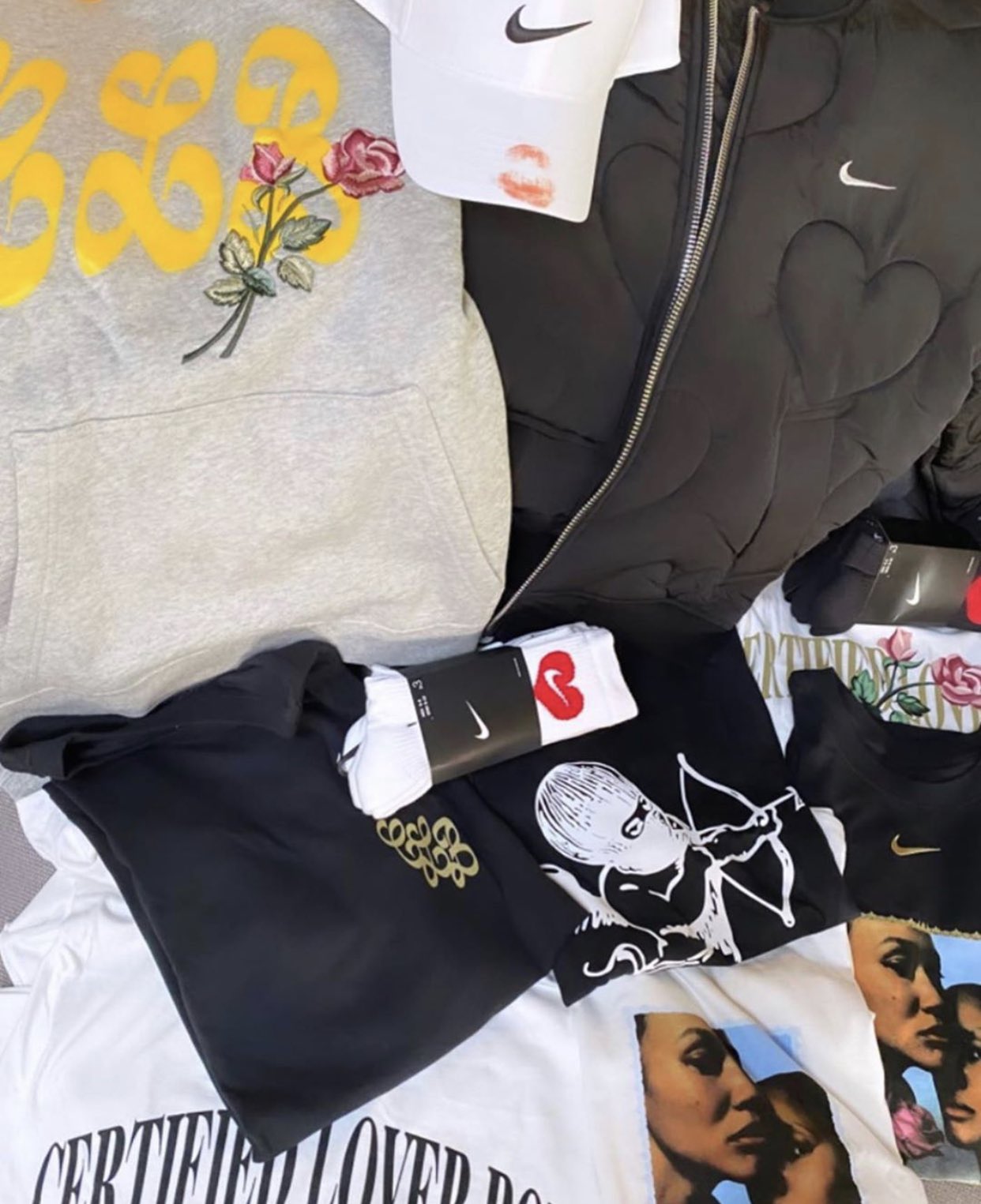 In the music video for “Laugh Now Cry Later,” the album’s first single, we caught a glimpse at an unidentified shoe, most likely a new Drake x Nike model. Drake was also seen wearing a quilted pink Nike bomber jacket with heart embroidery, a motif that goes along with the “Lover Boy” theme. Social media posts came soon after that revealed more CLB Nike merch, such as a white cap with a red lipstick kiss on the brim and socks with Swooshes encapsulated in red hearts. A black version of Drake’s bomber jacket has also surfaced, along with various CLB hoodies and tees.