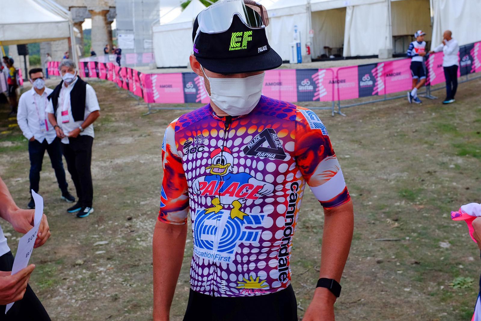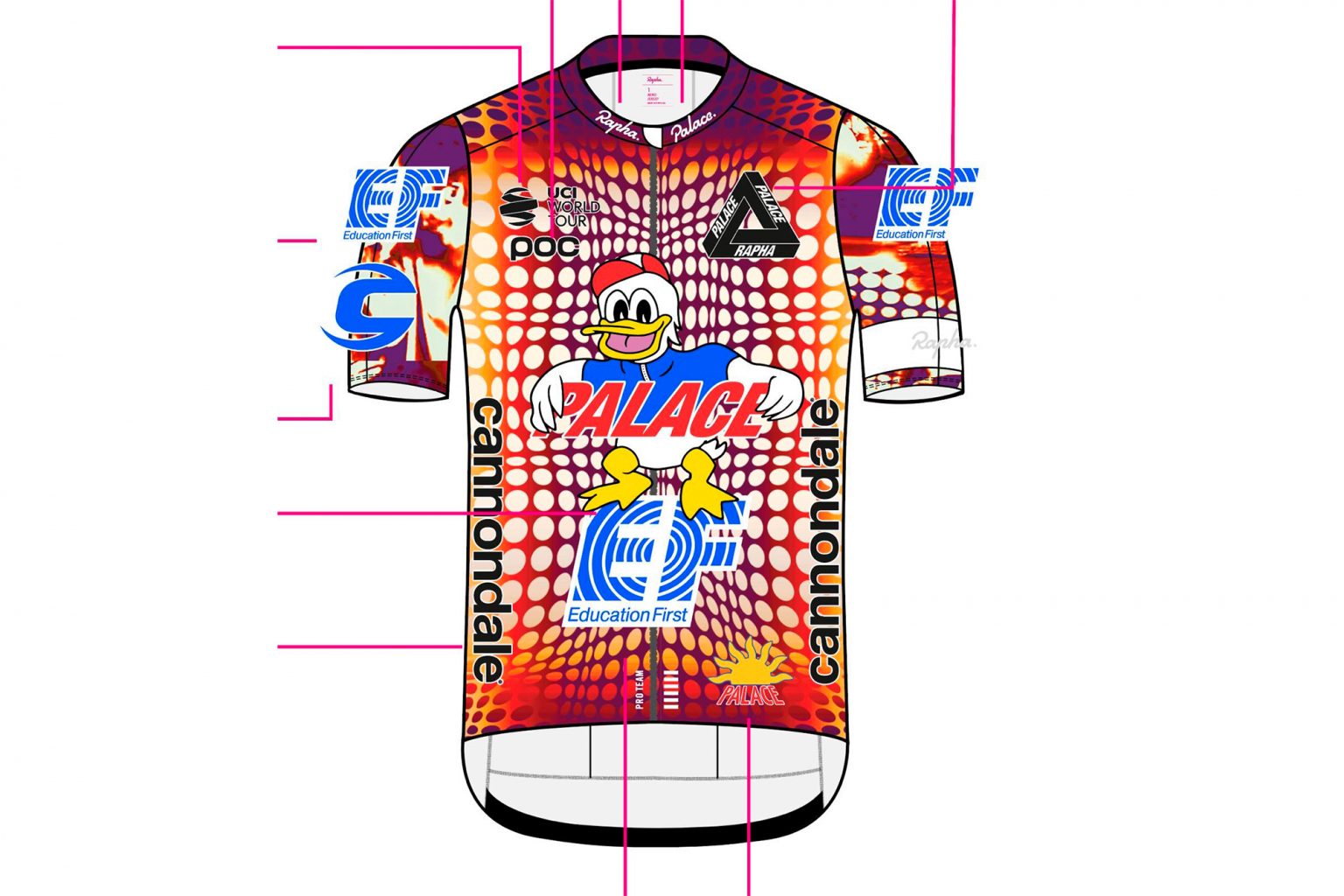 Instead of their usual pink kits, which would clash with the race’s maglia rosa, the team will be wearing a completely new design by Rapha and Palace Skateboarding. It’s loud. it’s chaotic. There’s ducks on them. It’s purposely disruptive, which is a breath of fresh air for a sport like cycling that takes pride in tradition. Rapha themselves say they picked Palace as a collaborator because they are “alien to [cycling’s] aesthetic, oblivious to its origins, and untrained in its traditions.”
