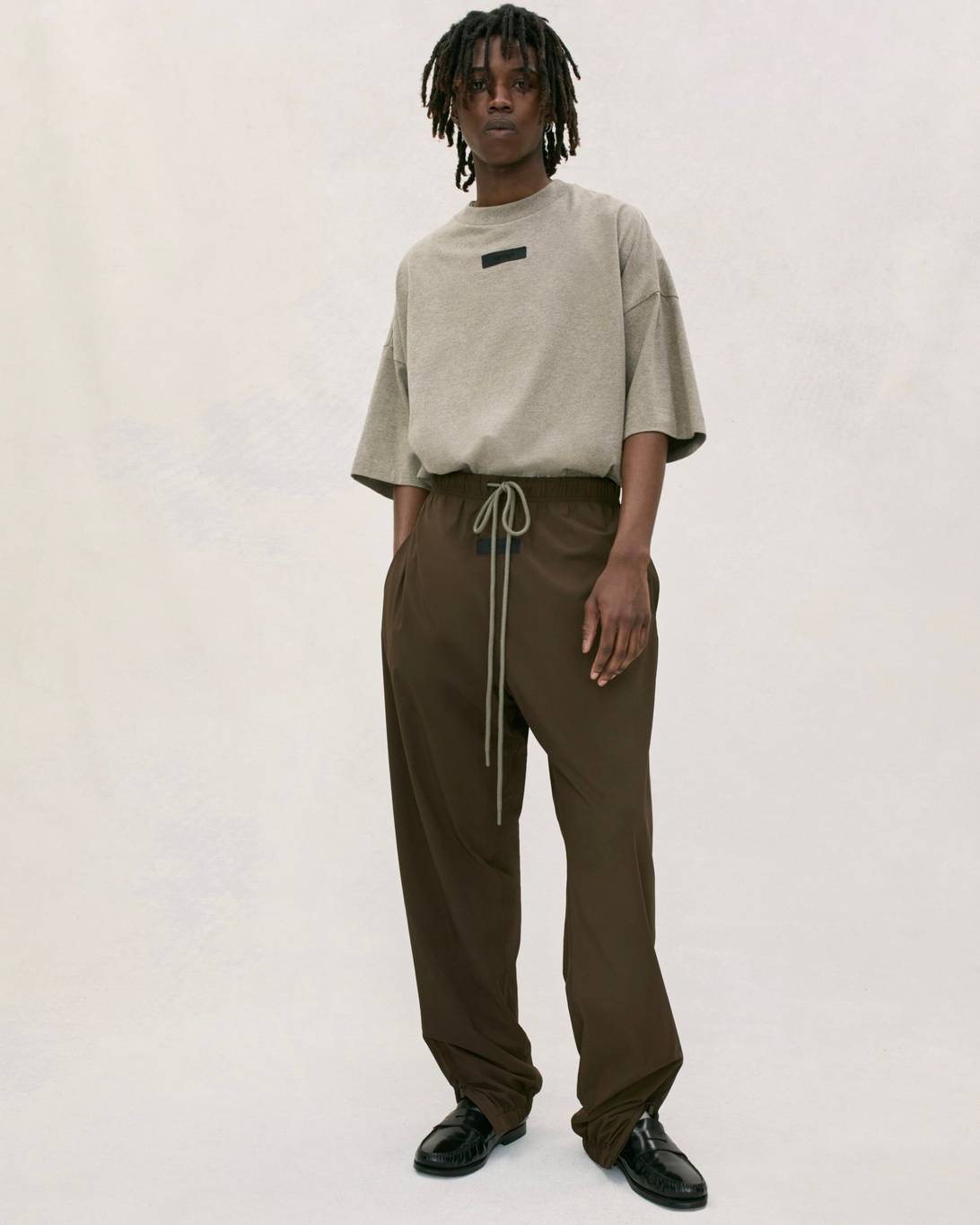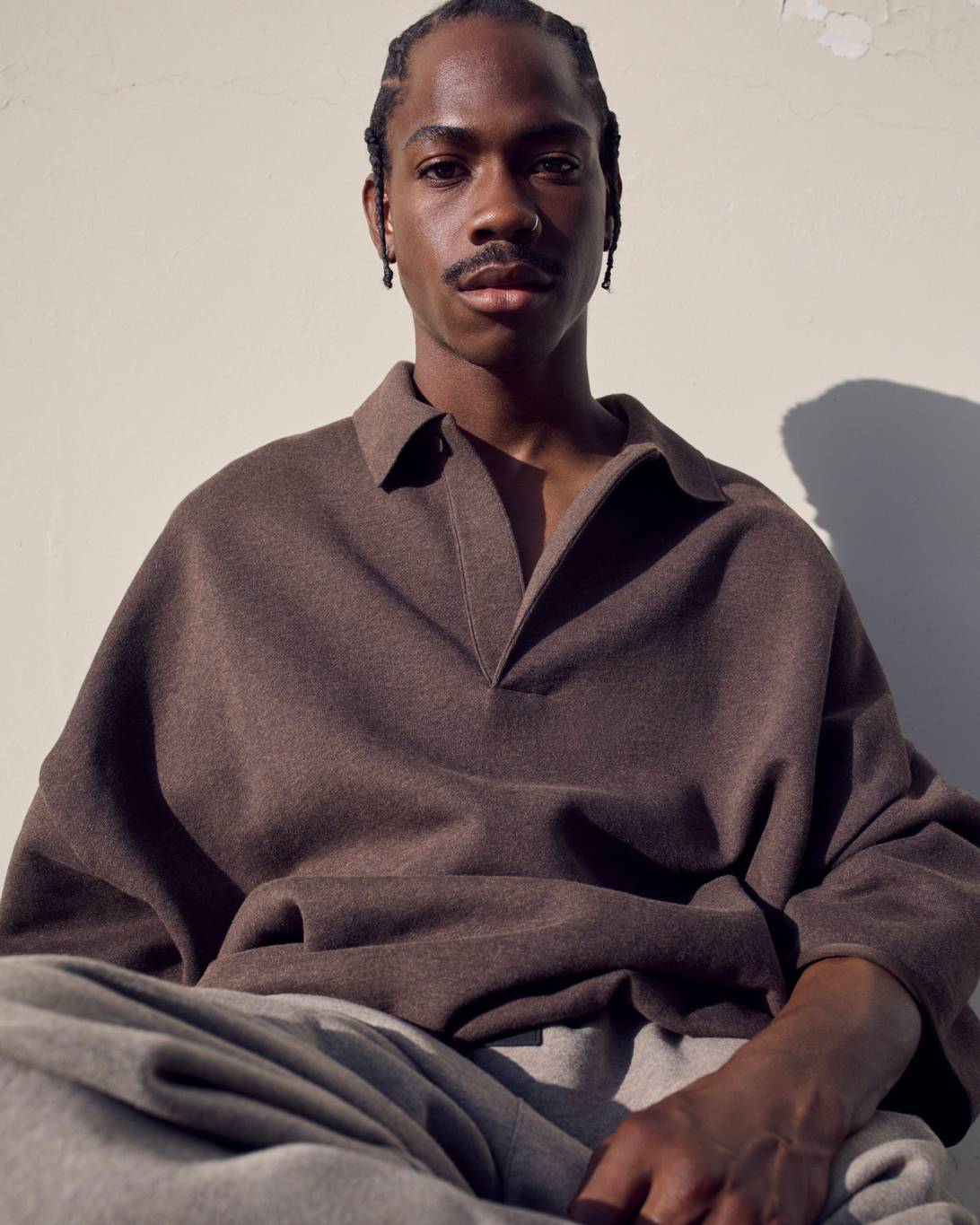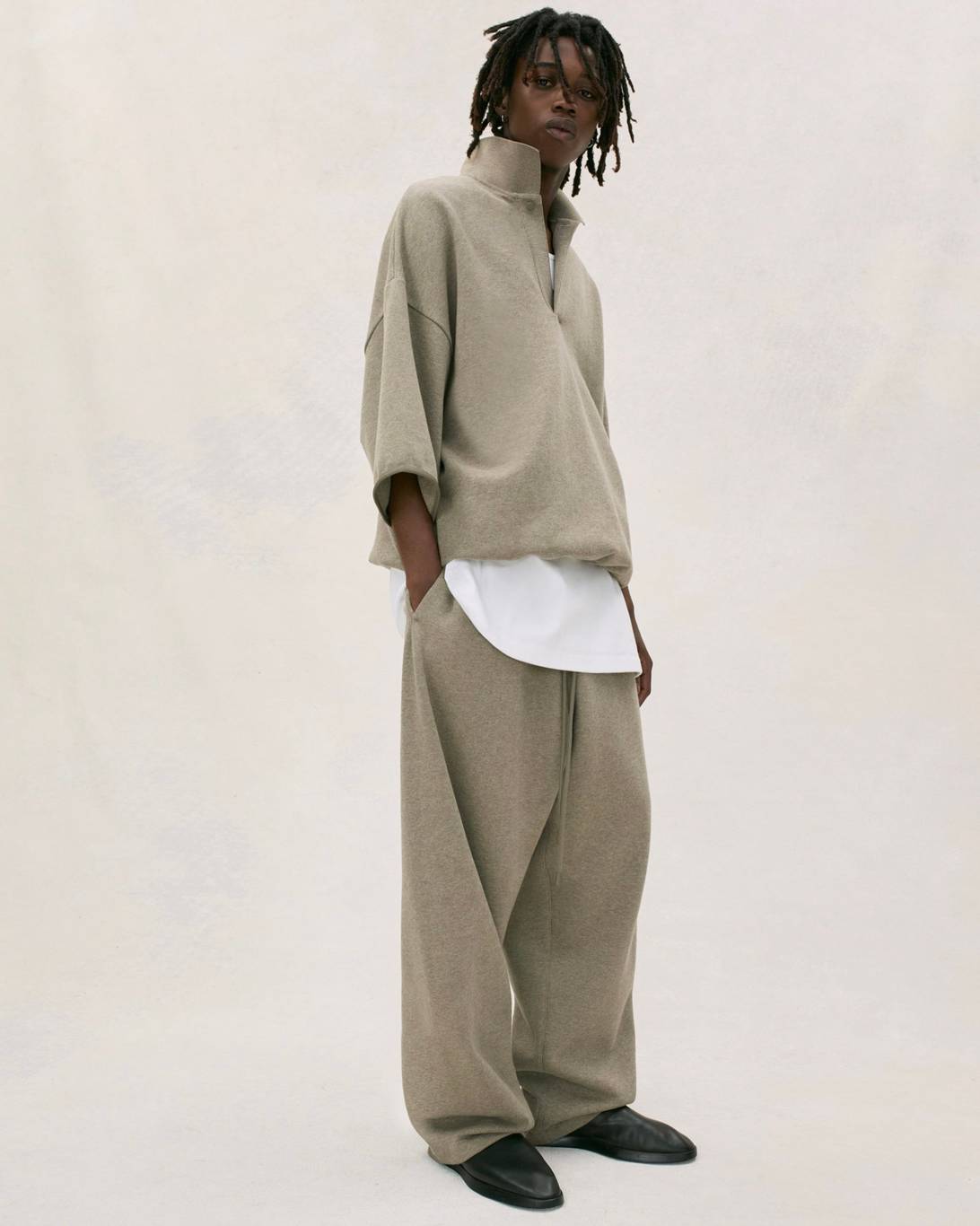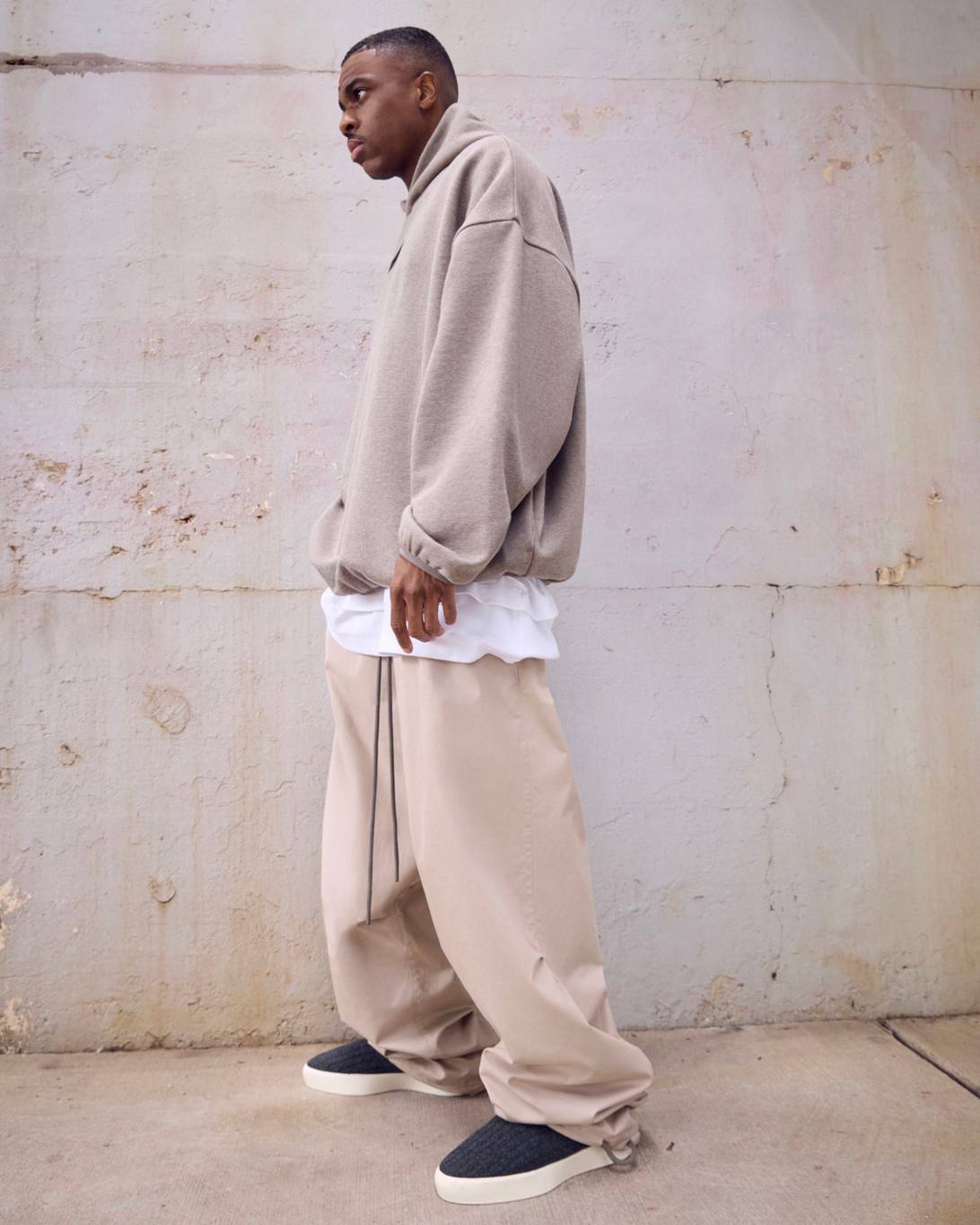 Vince Staples makes a guest appearance in the lookbook, rocking this season’s hoodie in Heather Grey, layered atop white tank top and tee. He’s also wearing the cotton twill lounge pant in Mink and a pair of Fear of God Moc Knit Lows.