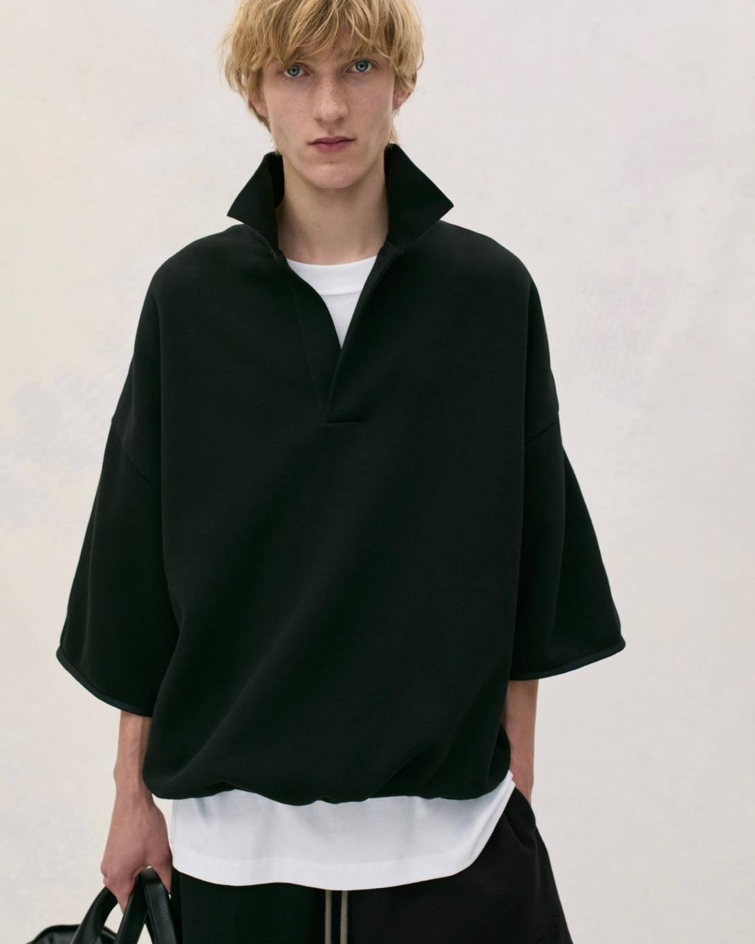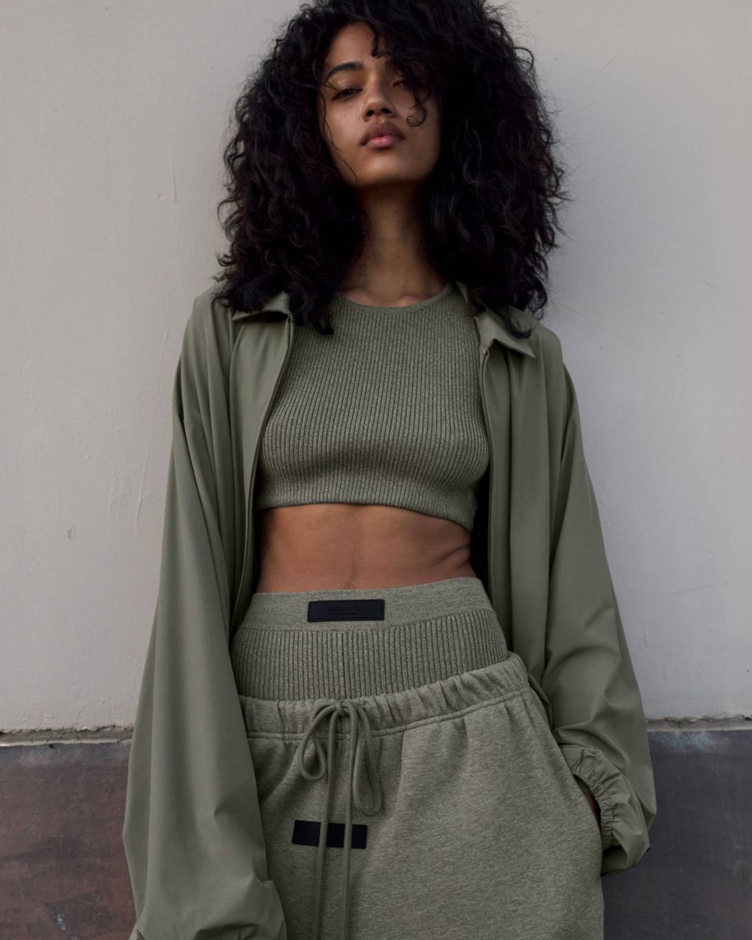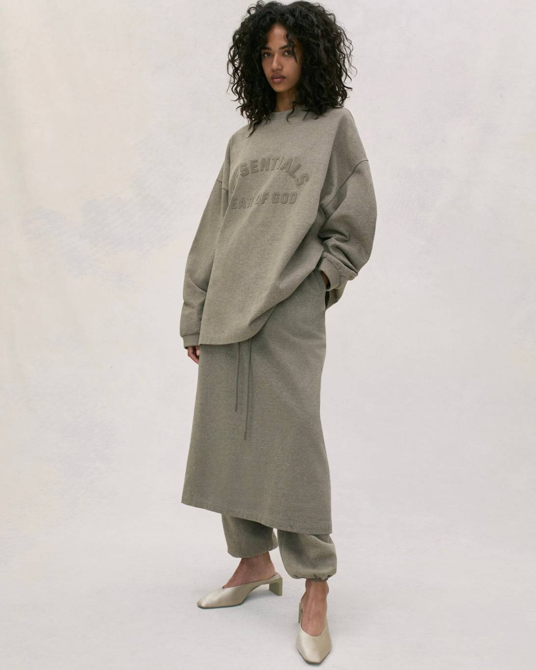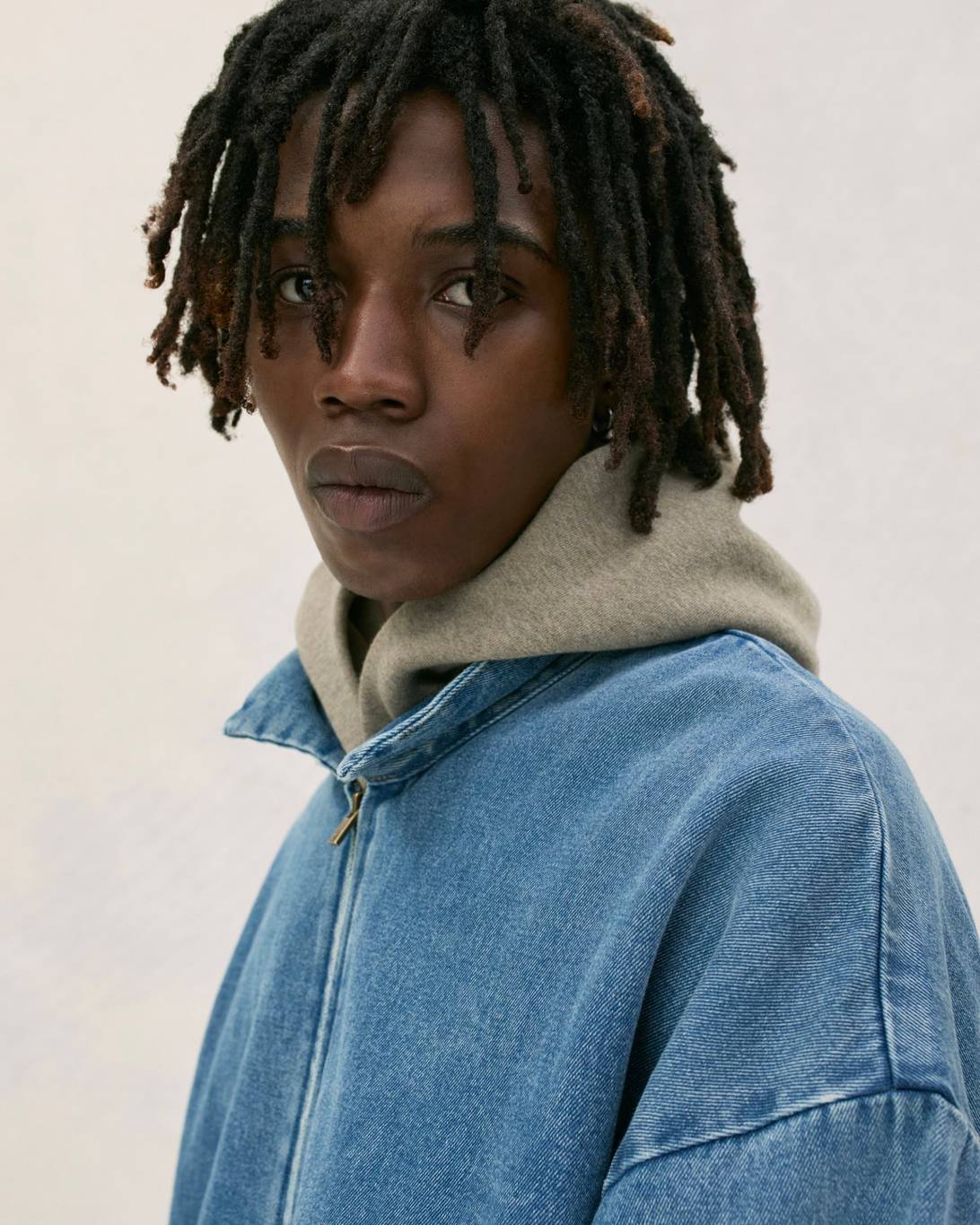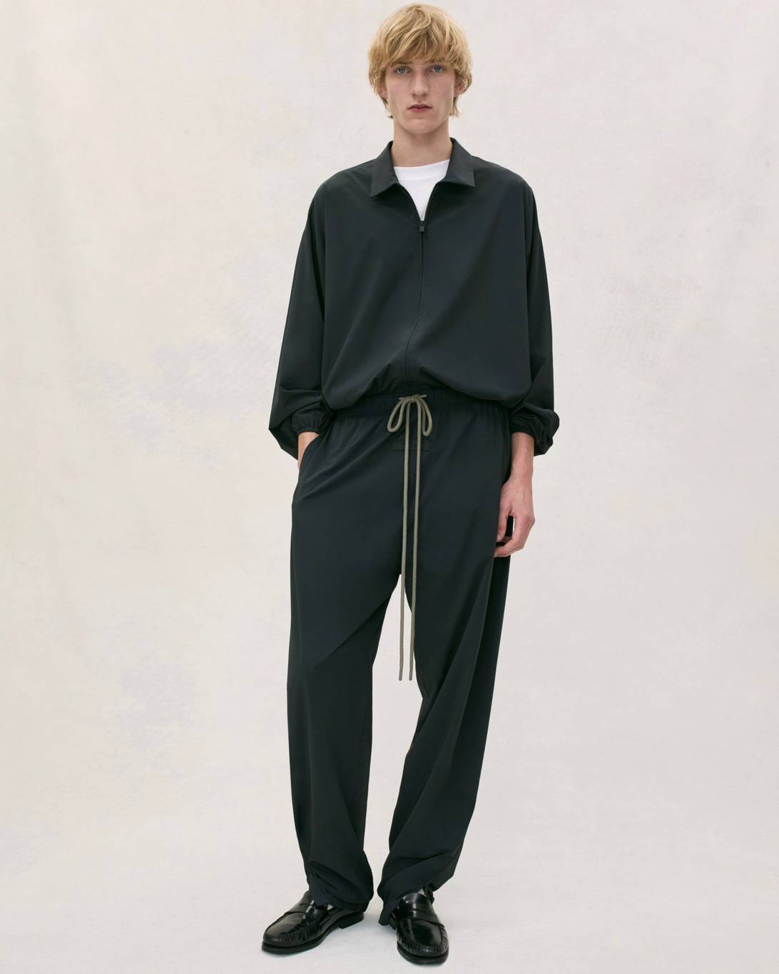 Vince Staples makes a guest appearance in the lookbook, rocking this season’s hoodie in Heather Grey, layered atop white tank top and tee. He’s also wearing the cotton twill lounge pant in Mink and a pair of Fear of God Moc Knit Lows.