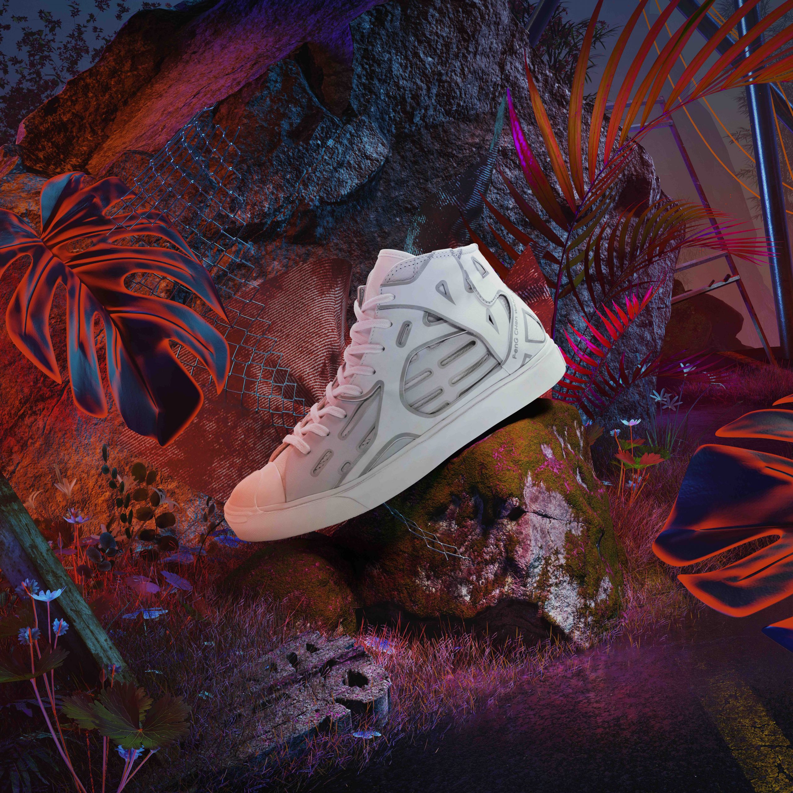 The Jack Purcell is recognized by its “smile” toe cap and hit badminton courts in 1935. Feng Chen personalizes the shoe with panels cut in the shape of the Mandarin characters that form her name (王逢陈), resulting in a dynamic system of layering all over the upper.