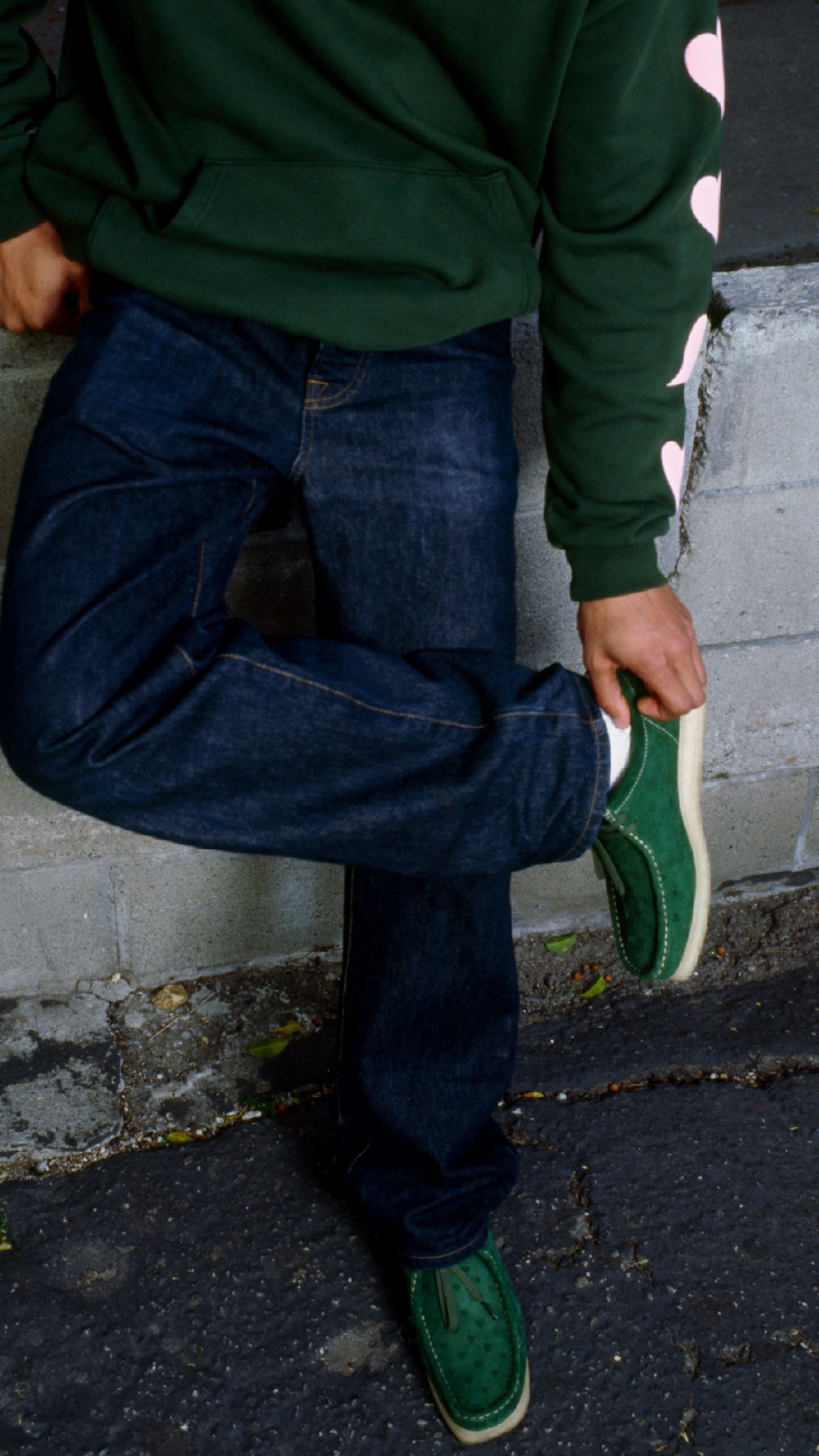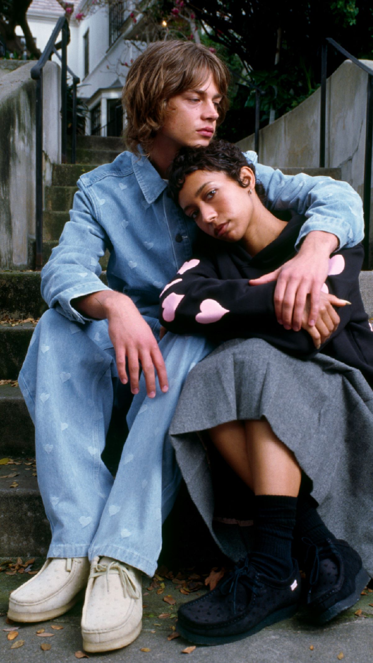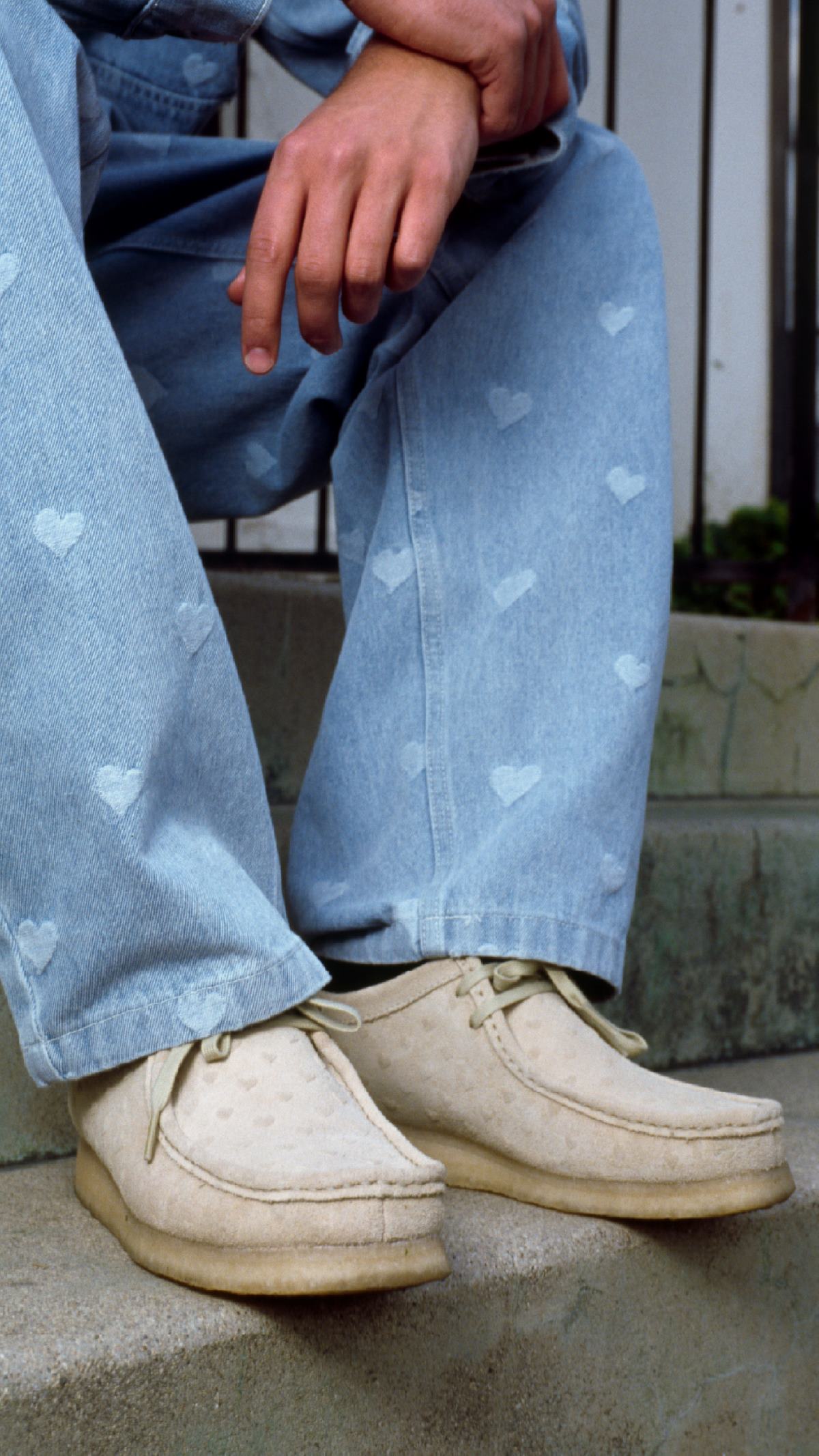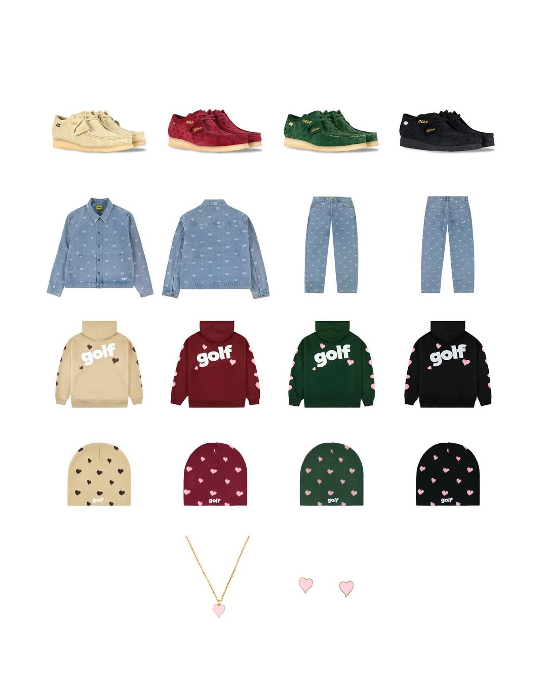 To accompany the footwear, GOLF WANG is also dropping apparel and accessories that continue the heart theme. The offering includes denim pieces such as jeans and a button-up jacket, hoodies and beanies in colorways that perfectly pair with the Wallabees, and a matching set of gold jewelry with pink heart motifs.