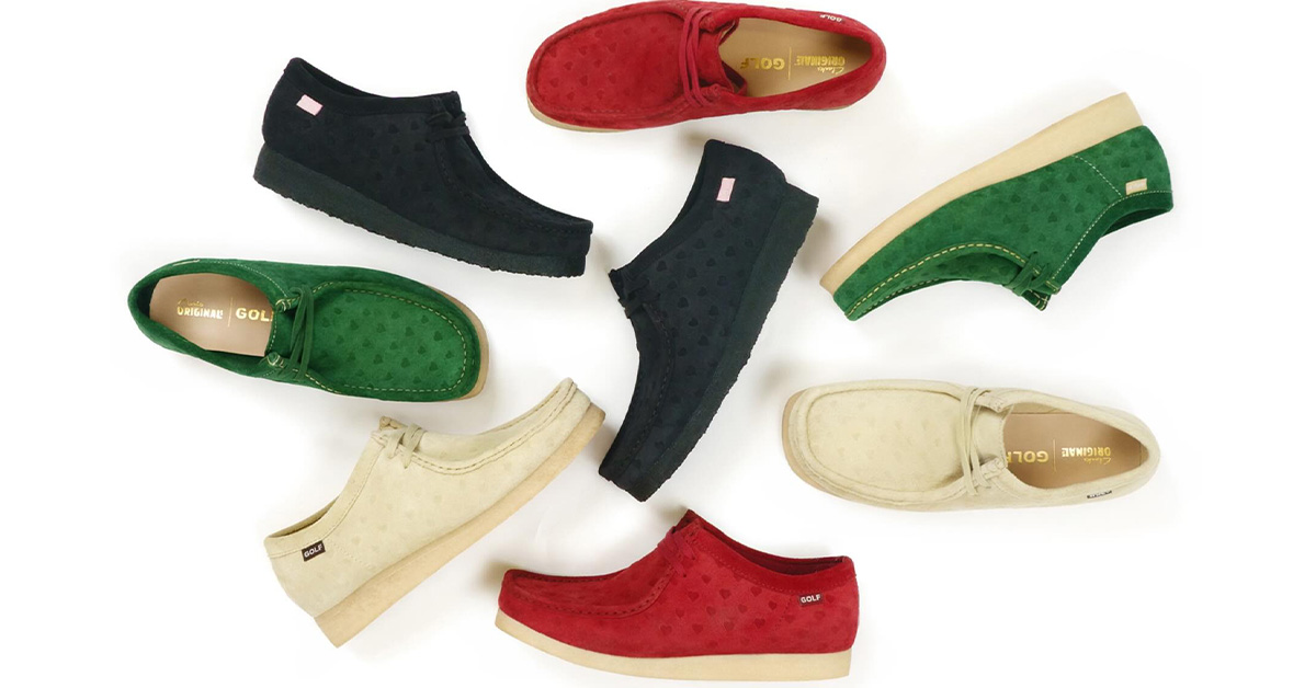 The GOLF WANG “Crush” collection featuring the Clarks Wallabee drops February 14th via the GOLF WANG website and GOLF WANG stores, with early access now available on the GOLF WANG app. The black Wallabee colorway will also be stocked at Clarks Originals stores and on clarks.com. Check out the lineup below.