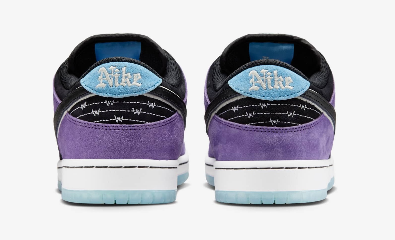 The construction of Hayley’s Dunk includes Court Purple suede overlays, black suede on the quarters panels and ankle collar, perforated white leather on the toe box, and a double-layered Swoosh with black leather and white embroidery trim. Pops of Lagoon Pulse blue are applied to the suede heel tabs, the translucent outsoles, and the custom-branded tongue tags. Various tattoo graphics can be found on the insoles and outsoles, including a scorpion, spider, and theater masks.