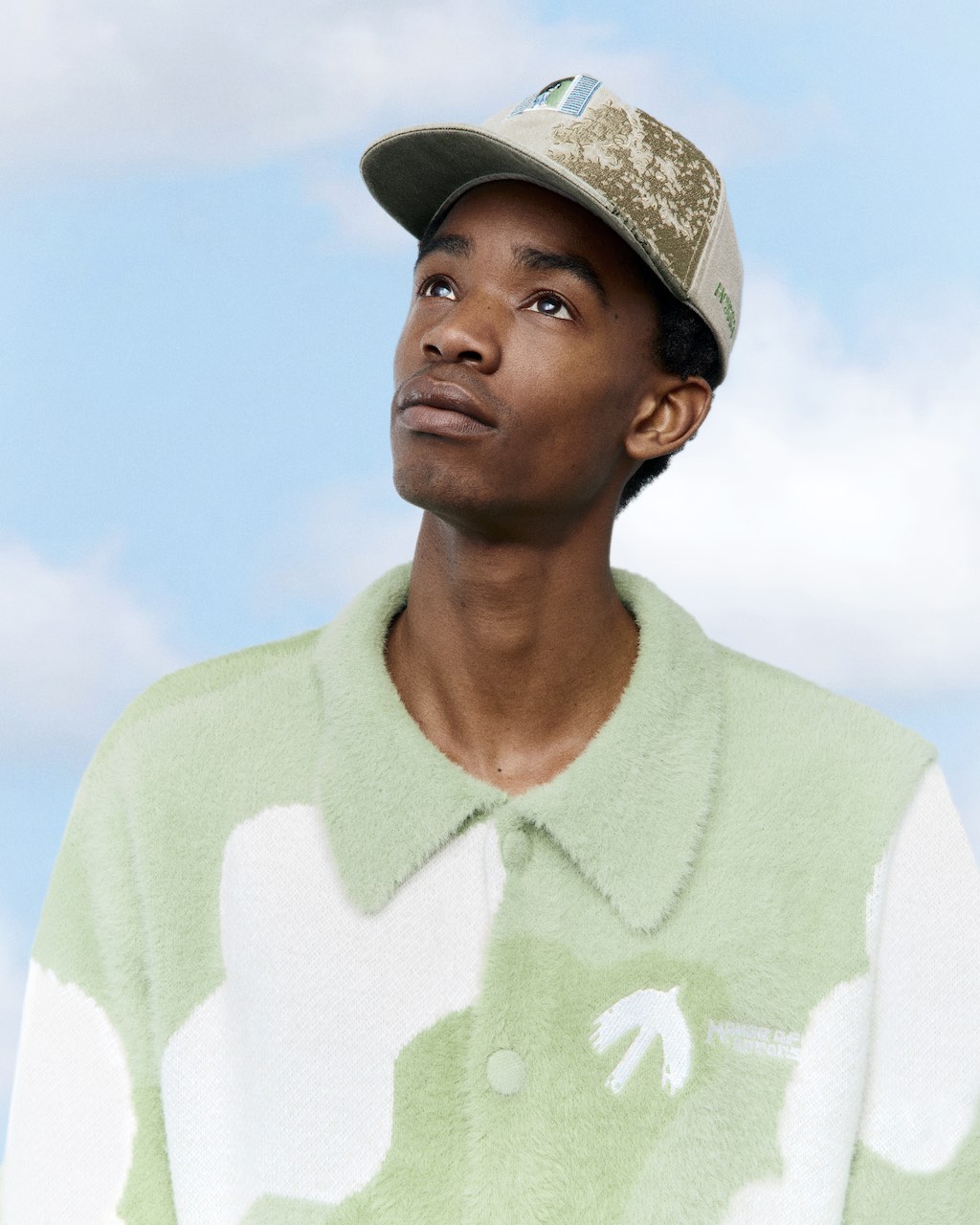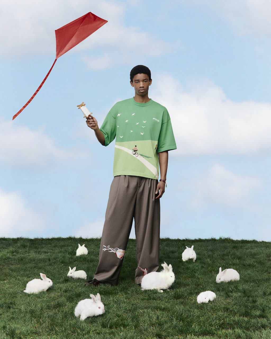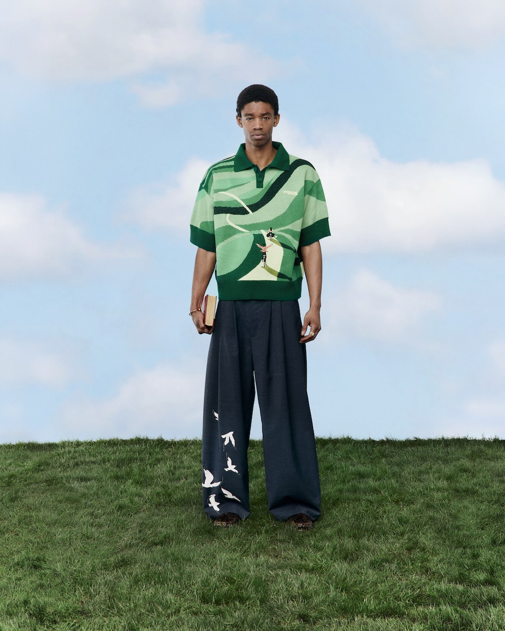 The “Lauterbrun” capsule features an assortment of knitwear, embroidered garments, and denim with intricate detailing, exploring themes of movement and companionship within the crevices of everyday life. The pieces serve as storytelling devices, as seen in a knitted polo showcasing a couple cycling through lush hills, as well as in a green jacket and long-sleeve polo with a couple peacefully enjoying the grassland.