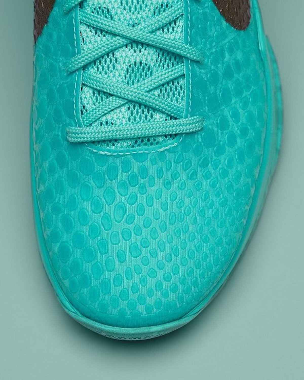 Brunson’s “Statue of Liberty” Kobe 6 Protro comes dressed in Hyper Turquoise, mirroring the green verdigris patina formed on the statue’s copper surface from oxidation over the years. Metallic Copper accents are also found on the shoe—specifically on the Swooshes, heel counters, and Sheath logos on the tongues—representing how the statue looked when it first arrived in America in 1885.