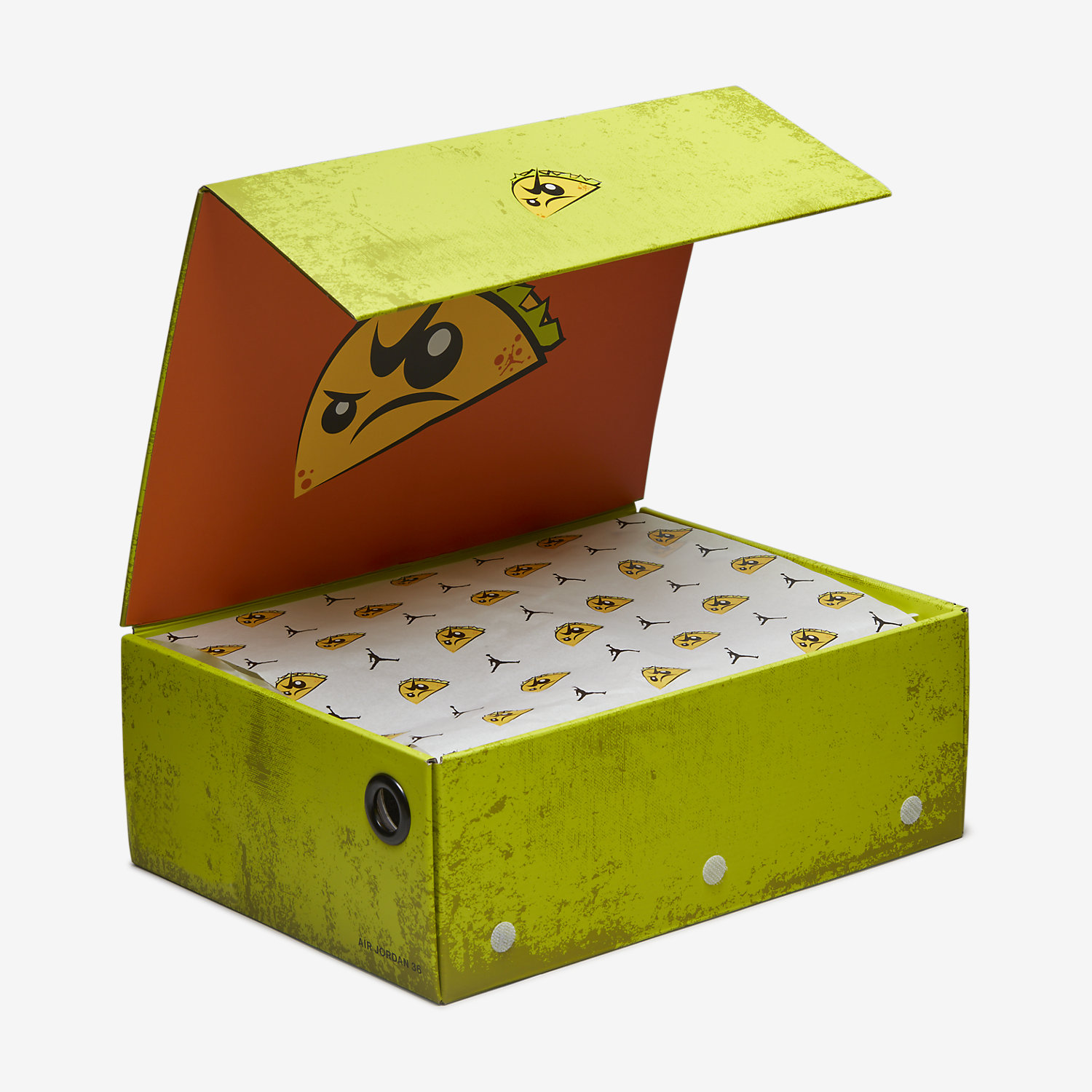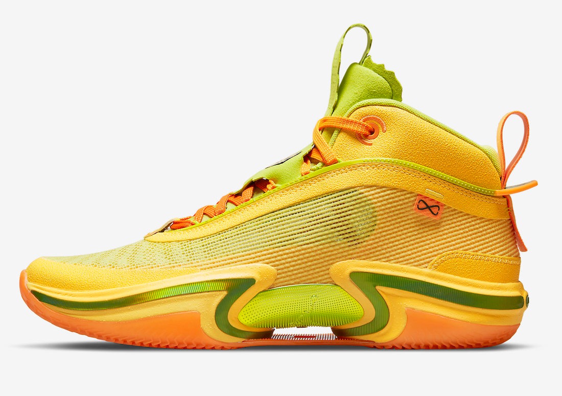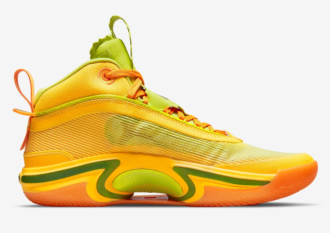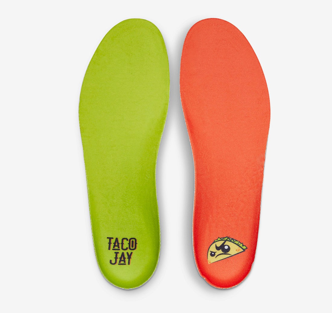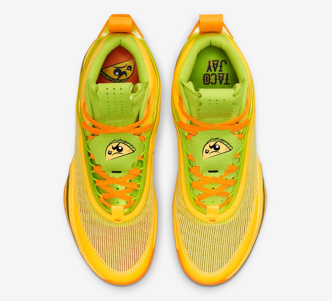 This pack features two of the same silhouettes included in Rui Hachimura’s “Black Samurai” Pack that released earlier this year. This time, the Air Jordan 36 takes on a taco-inspired color scheme of Citron Pulse, Atomic Green, and Cone. Each color represents the ingredients needed to make a taco, including the taco shell, lettuce, and cheese. The silhouette is also embellished with a custom taco graphic on the tongues and insoles. The heel pull tab also features “TACO” on the left and “JAY” on the right.