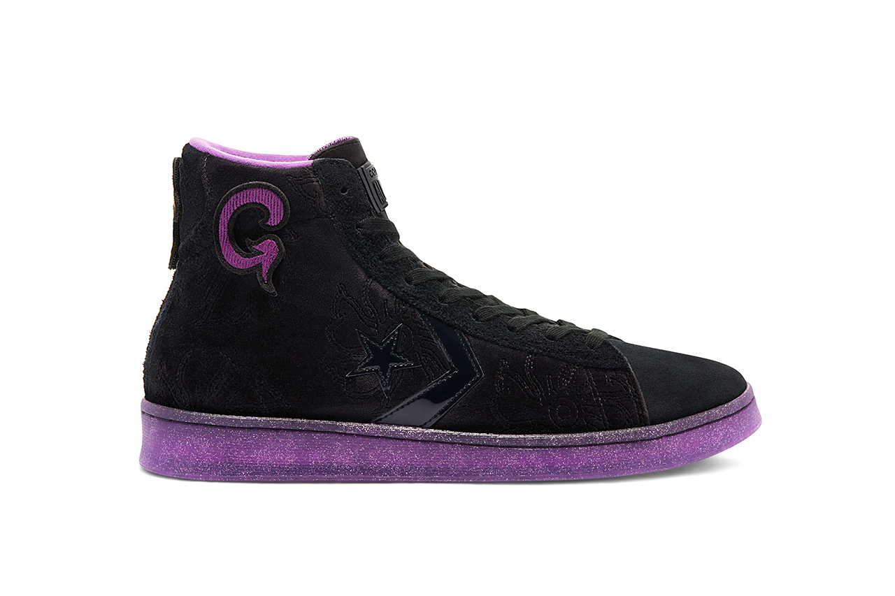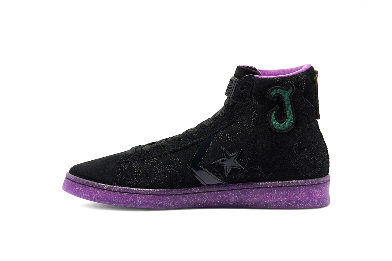 Along with the previously-previewed Chuck 70, the collection also includes a Pro Leather dressed in smooth black suede with purple used for the sockliner and glittery sole unit, inspired by the aesthetic of ’70s nightclubs. Additional ’70s inspiration comes in the form of floral patterns embossed across the upper. The shoe also comes with interchangeable J-F-G corduroy patches.