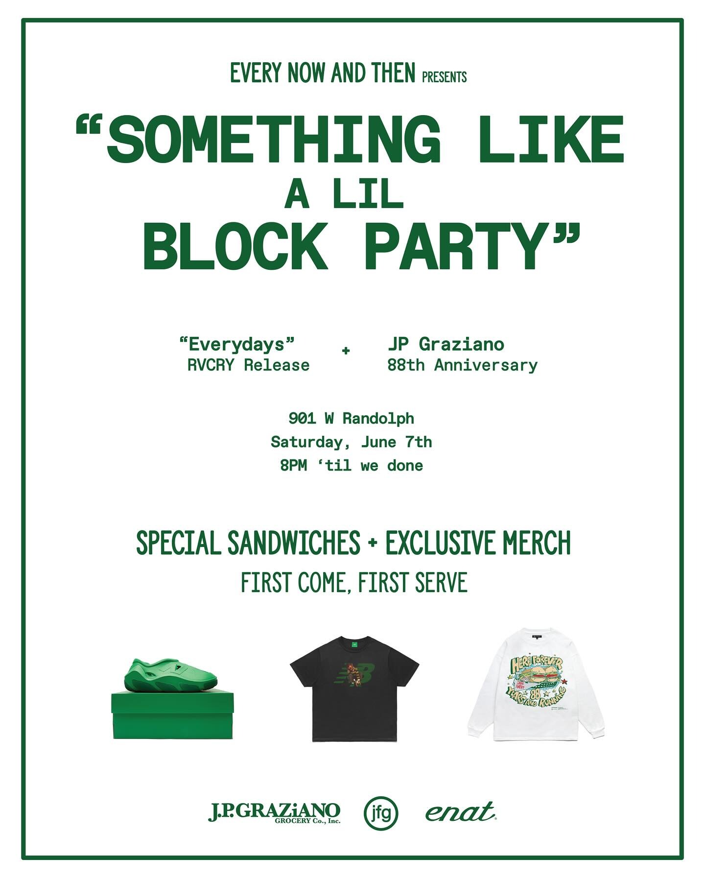 Update (06/06/25): The Every Now & Then block party is in partnership with iconic Italian deli J.P. Graziano in celebration of its 88th anniversary. Attendees can purchase a pair of “Everydays,” exclusive merch, and special sandwiches at the event. Leftover RCVRYs and tees will be available Monday, June 9th at noon CT on the Every Now & Then website.