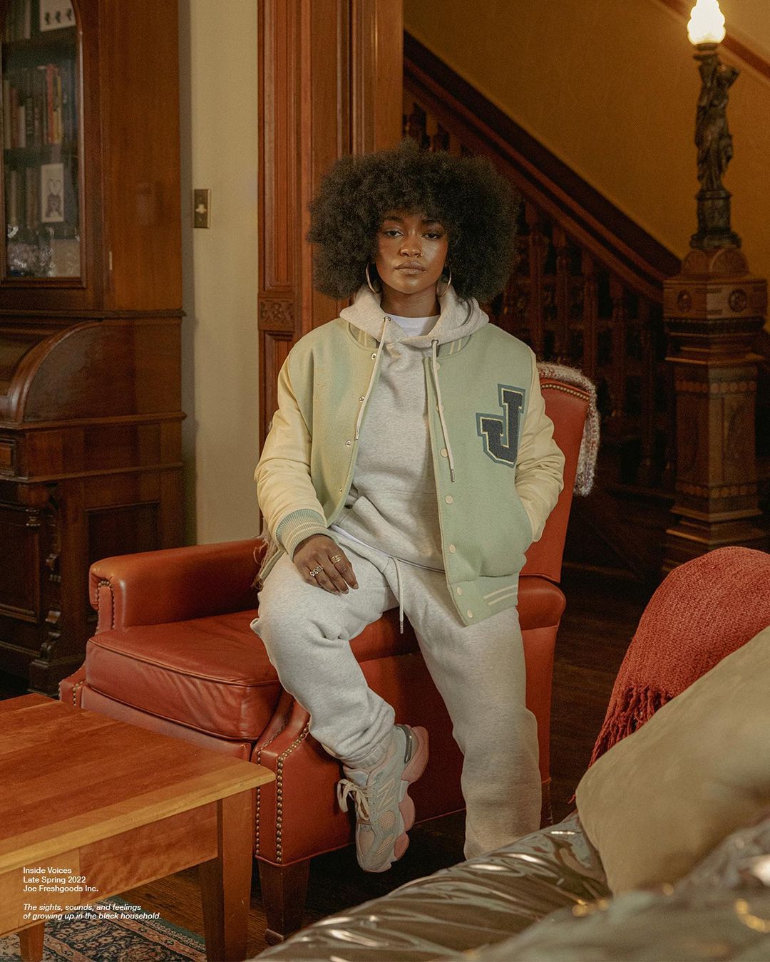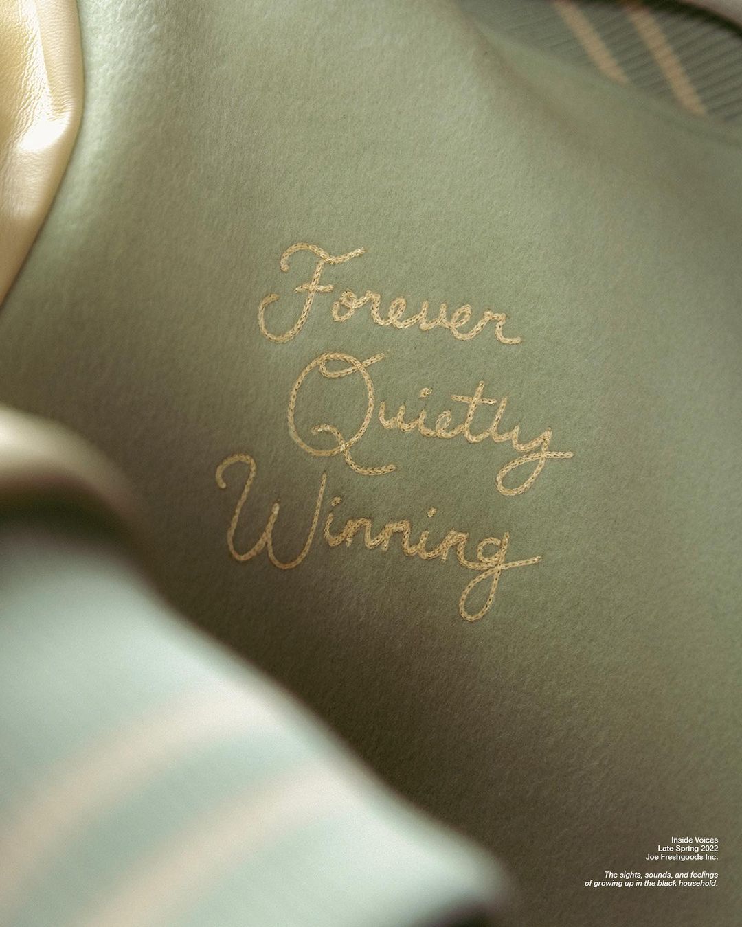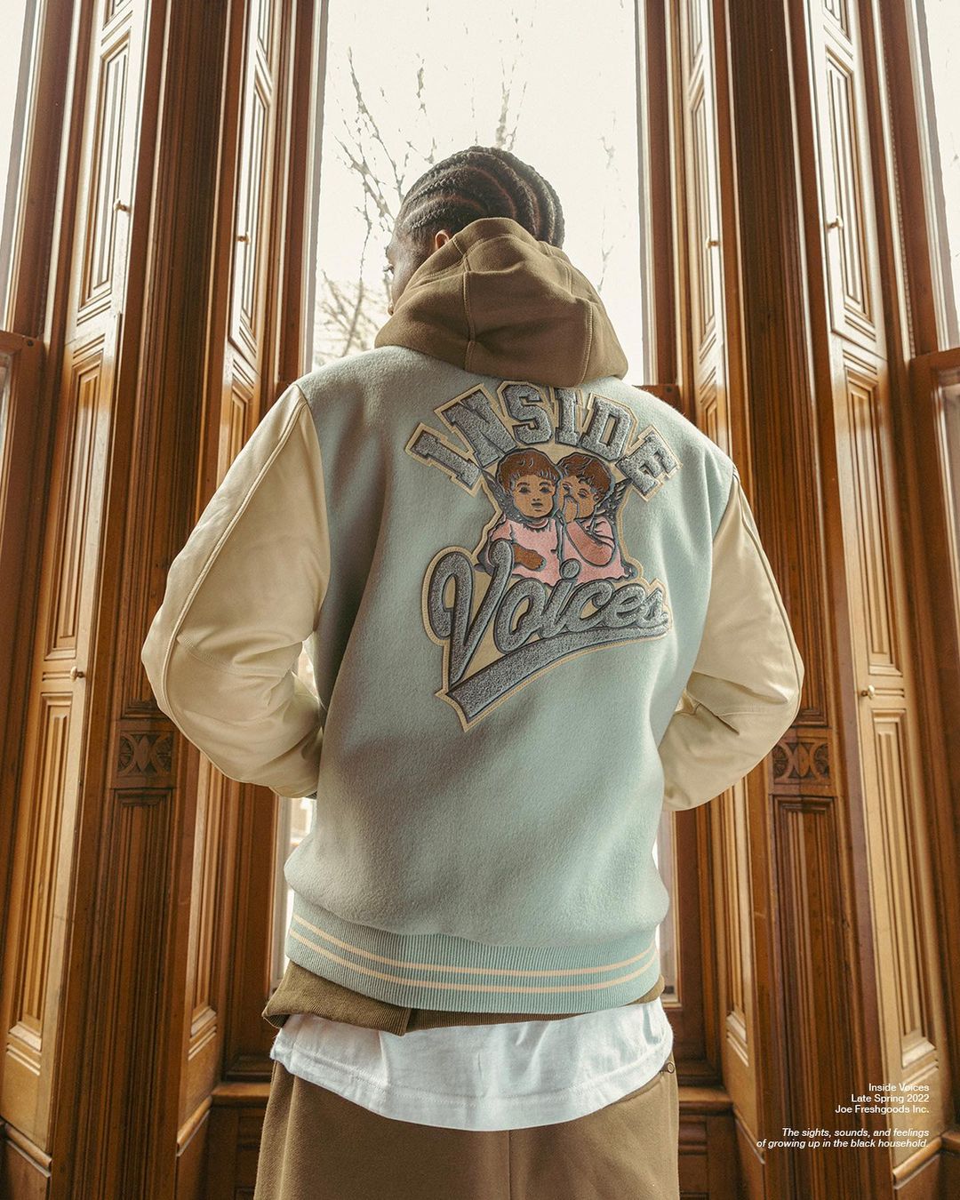 Inspiration for the “Inside Voices” collection was pulled from “the sights, sounds, and feelings of growing up in the Black household.” Highlighting the collection is the varsity jacket offered in pastel blue and green colorways. Subtle “Forever Quietly Winning” messaging appears on the right chest, while a varsity “J” appears on the left. On the back is a large chenille “Inside Voices” patch with two Black cherubs, one whispering into the other’s ear.