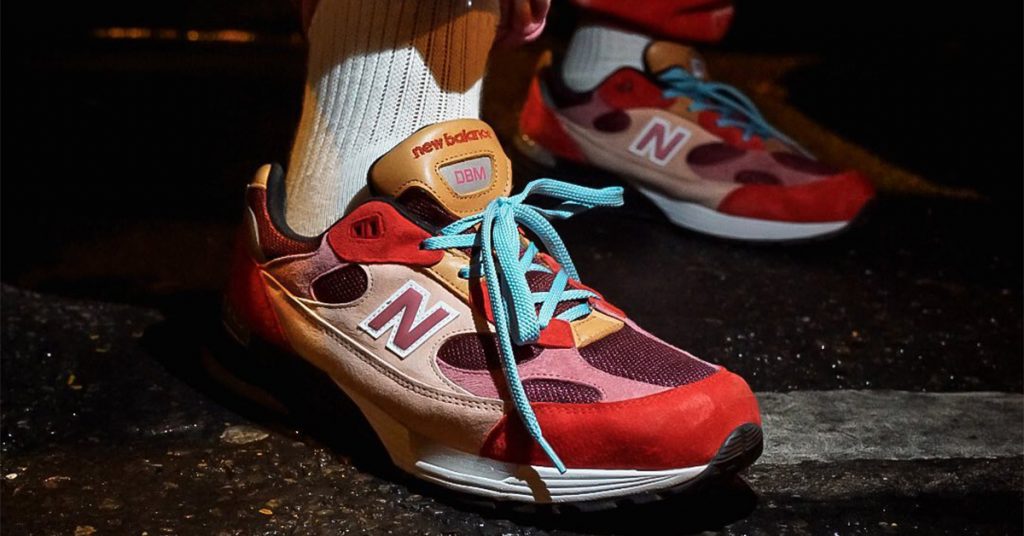 Update: Here’s a clear look at the Don’t Be Mad New Balance 992. The mixed material upper sports various shade of pinks and reds, contrasted by a tan leather tongue and light blue laces.