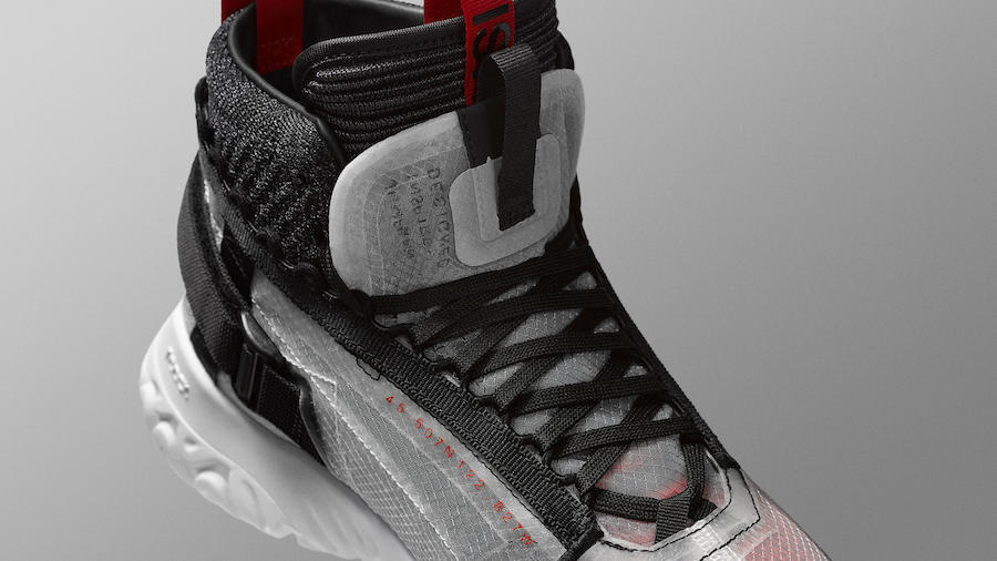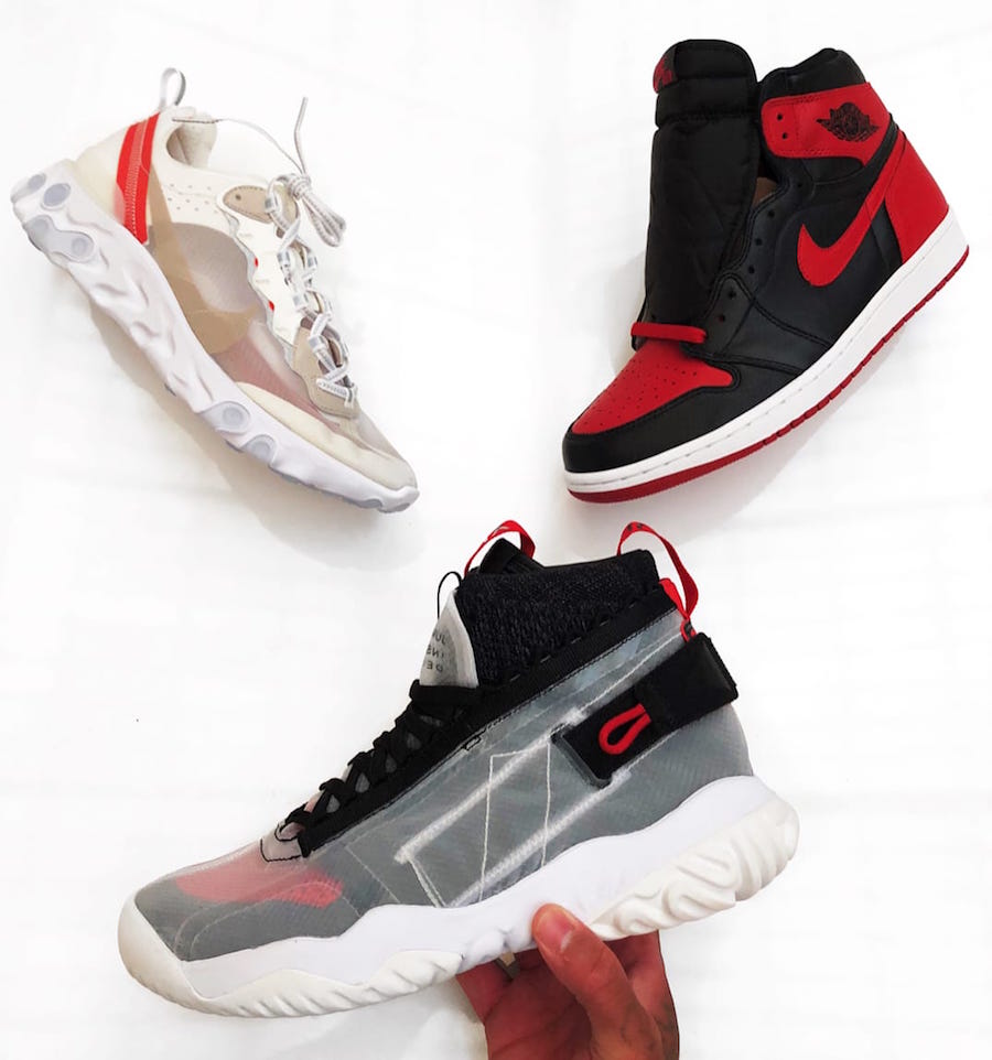 Jordan Brand’s Frank Cooker originally took it to his instagram to unveil a React Element 87 and Air Jordan 1 hybrid and stating, “Don’t over think it, just sit back and let the streets REACT.” By combining the elements of an AJ1 Flyknit model with the translucent covering and a full-length React midsole, this hybrid model is just a preview of what’s to come from Swoosh. Now we can see the full extent of this model showcasing its translucent features, hints of the AJ1 “Bred” as well as functional design aspects like the heel strap and React midsole.