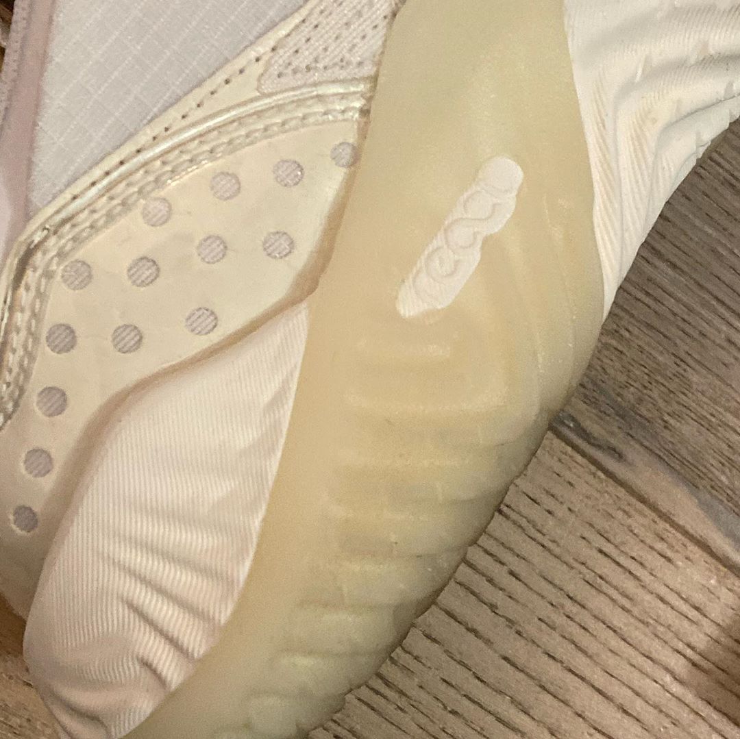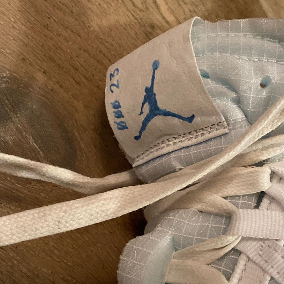 The shoe comes in a white, cream, and light blue color scheme and features a ripstop material upper and Nike React cushioning in the midsole. The numbers “000 23” appear throughout the shoe, including on the tongue next to a hand-drawn Jumpman logo.