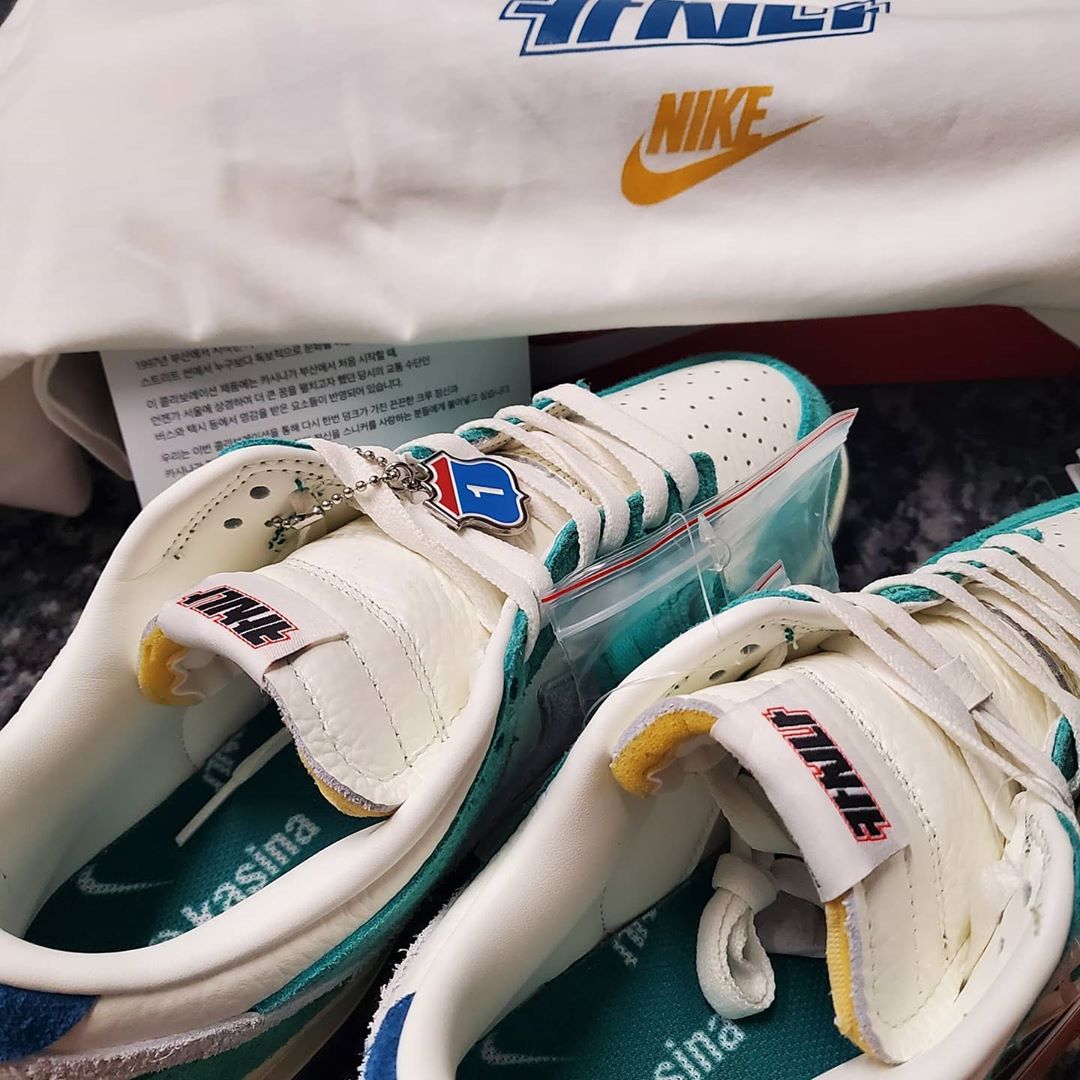 Update (09/03/20): Here’s our best look yet at the “Neptune Green” colorway of the Kasina x Nike Dunk Low. Both colorways are inspired by the buses and taxis that served as the main transportation from Busan, Kasina’s hometown, to Seoul, where Kasina eventually opened several locations. Photos via lee_si_eon/IG.