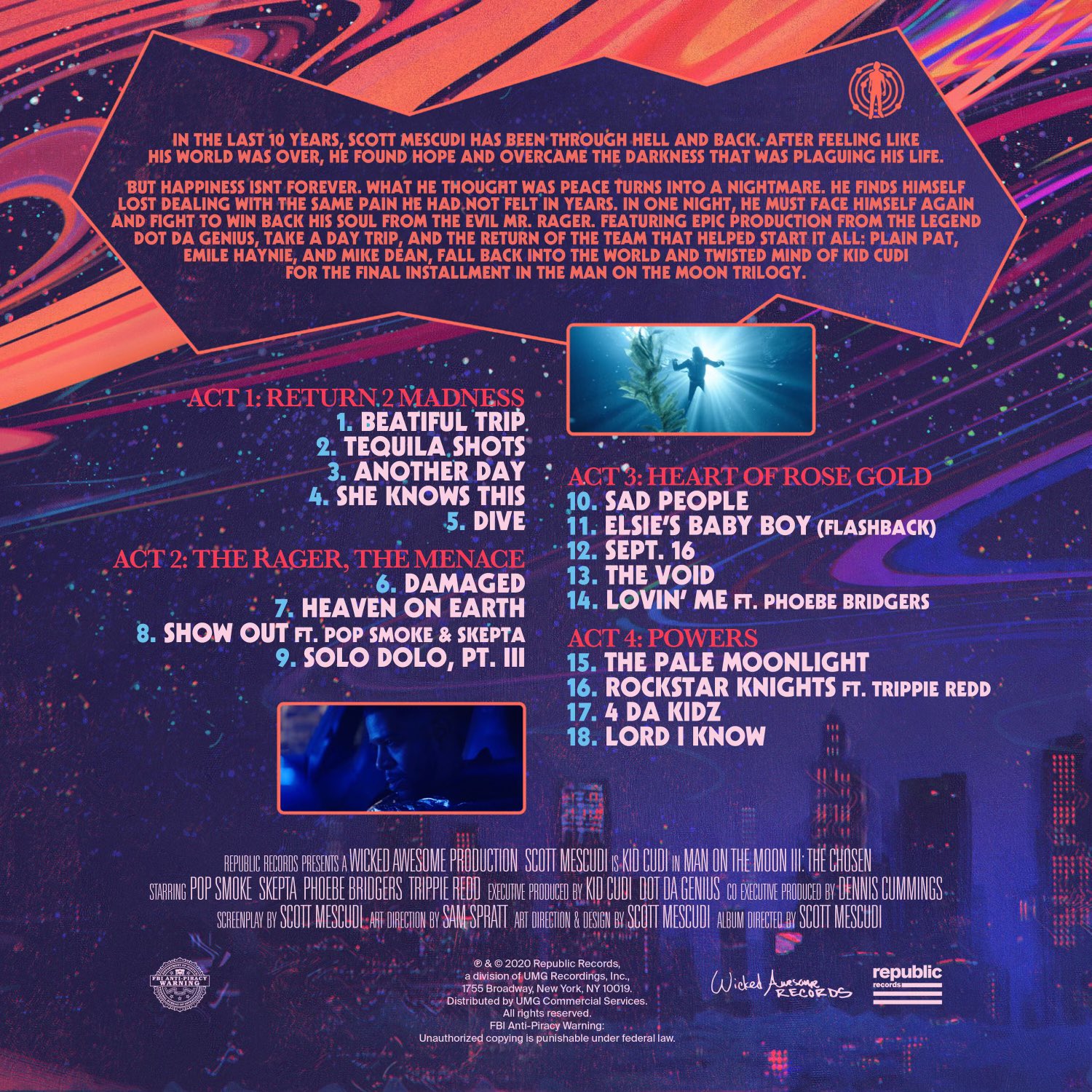 But happiness isn’t forever. What he thought was peace turns into a nightmare. He finds himself lost dealing with the same pain he had not felt in years. In one night, he must face himself again and fight back to win his soul from the evil Mr. Rager. Returning Epic Production from the Legend Dot Da Genius, Take a Day Trip, and the return of the team that helped start it all; Plain Pat, Emile Haynie, and Mike Dean, fall back into the world and twisted mind of Kid Cudi for the final installment in the Man on the Moon trilogy.”