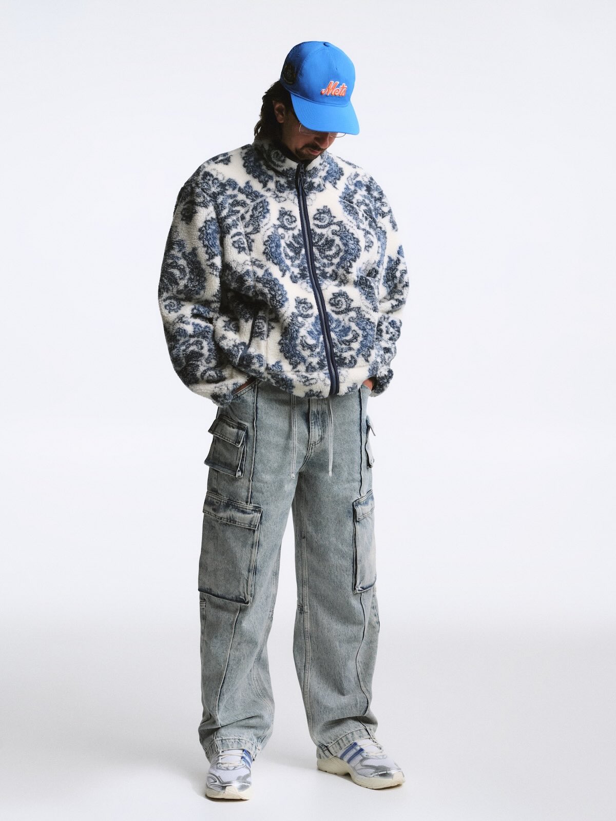 The apparel lineup features elevated silhouettes with an array of themes, including paisley, tapestry, patchwork, floral, moto, and Western Americana. Fabrics range from sherpa, velour, and lambskin suede to tricot blends, offered in this season’s Kith Palette: Stadium, Nocturnal, Sandrift, Muslin, Moss, and Magma. Pieces in collaboration with the New York Knicks, New York Yankees, and adidas also graced the runway.