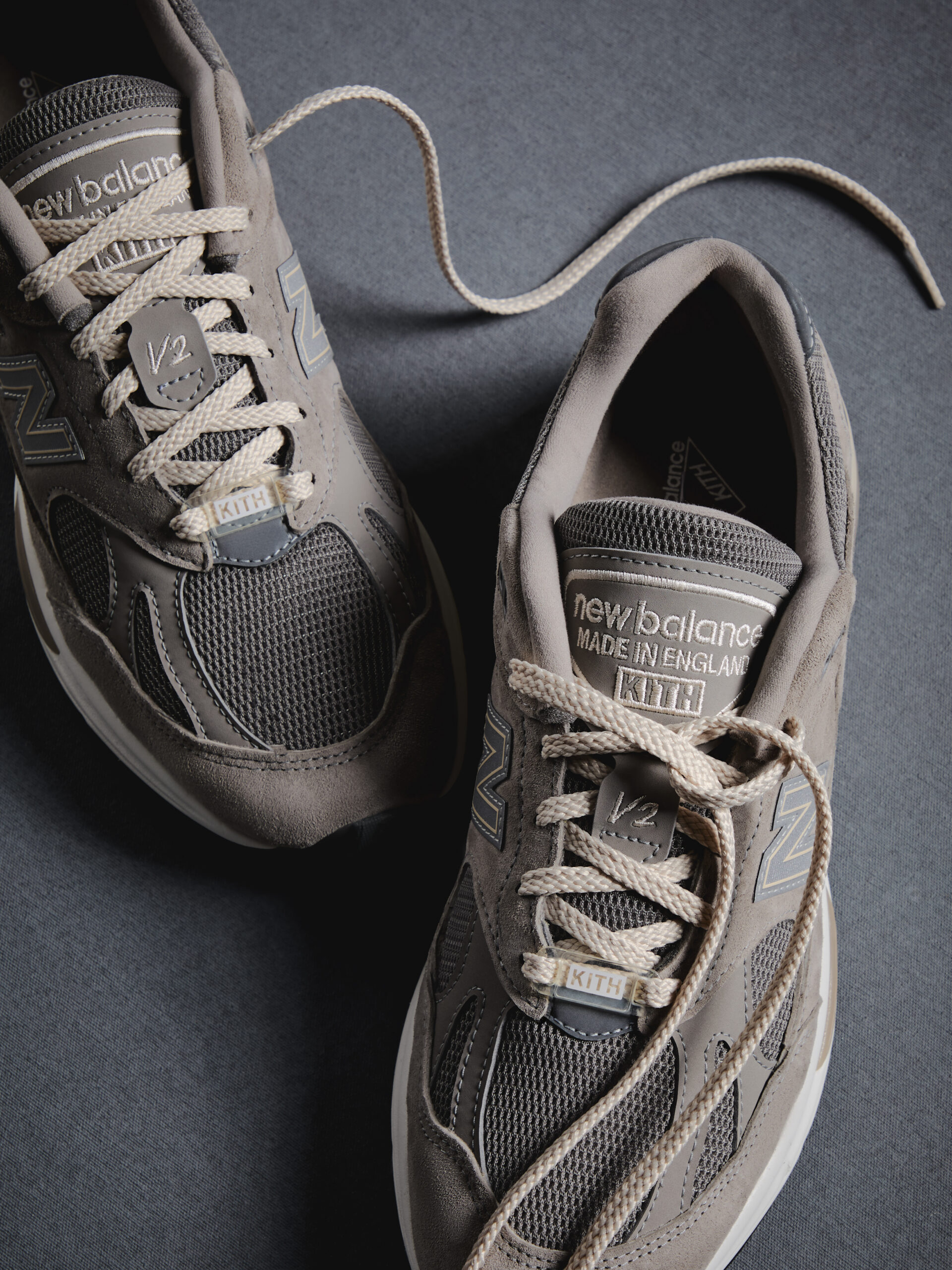 Both pairs are built the way you’d expect anything carrying the Made in UK tag to be, with pigskin suede that actually holds up, mesh underlays, and reflective hits in places right where they count. A “Made in England” embroidery on the tongue of each model drives one point home, nodding to Flimby, New Balance’s England-based factory that’s been running since 1982. Flat woven laces come standard, but extra lace options are tucked inside the box for those who like to switch things up. Kith’s fingerprints are all over the details: custom branding on the heel, tongue, and footbed on the 991v1, while the 991v2 carries those same details on the lateral ankle, tongue, and footbed.