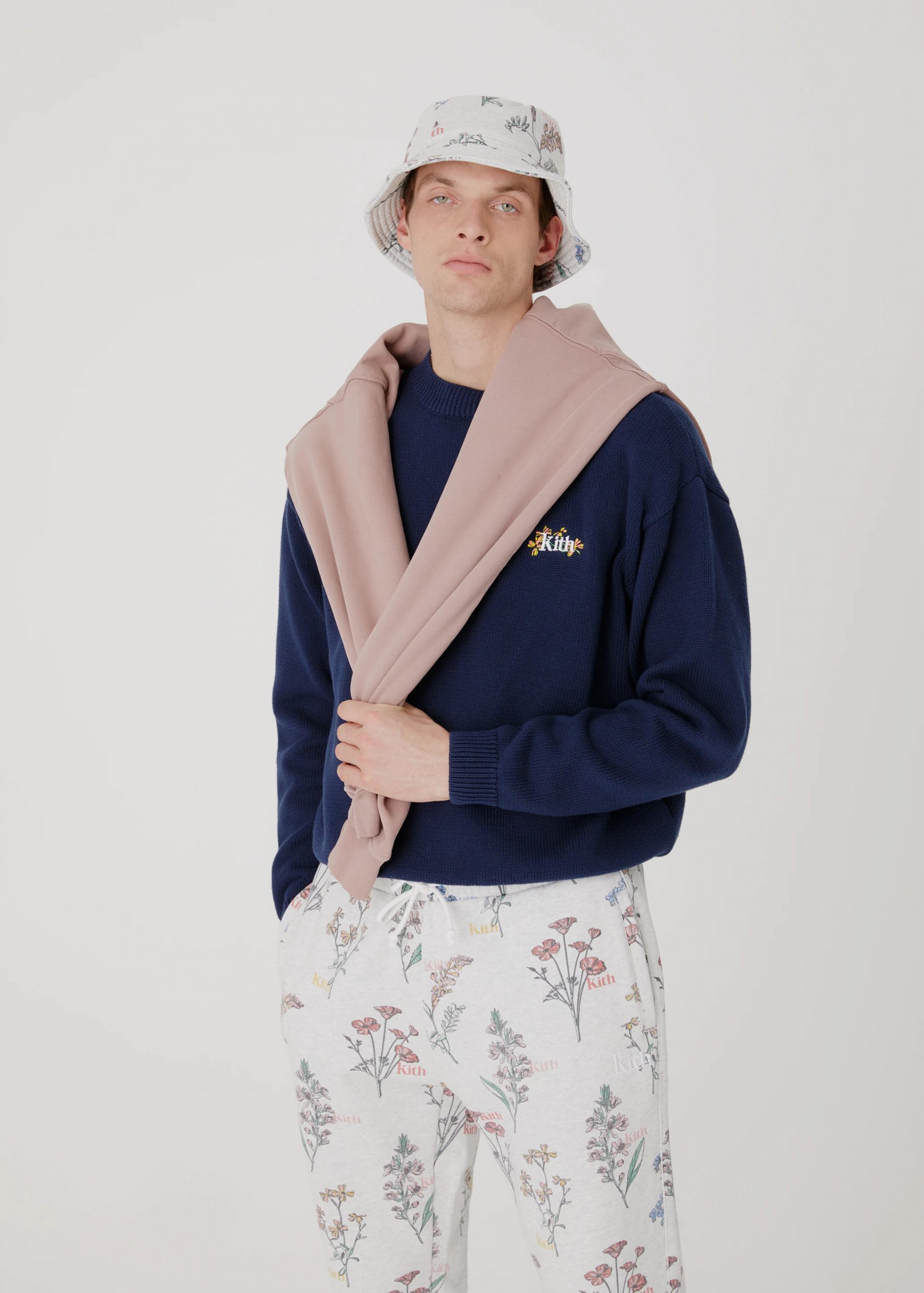 The collection notably focuses on elevated silhouettes and materials with bold designs. Key prints include Moroccan stripe and Bandana paisley, both featured in matching jackets, hats, and tote bags. Floral embroidery takes center stage on denim jackets, jeans, and knitwear. Kith also prepares for the season with lightweight jackets, springtime knitwear, and tracksuits.