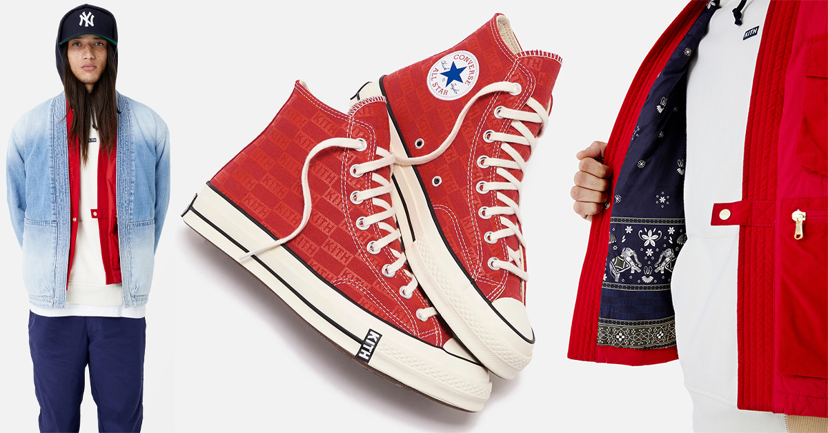 In footwear, KITH teams up with Converse to create a new offering of the 1970 High-Top Chuck Taylors. This season sees the debut of a Red colorway, which features KITH’s all-over monogram pattern covering its canvas upper and an off-white vulcanized sole. KITH will also re-introduce the classic Parchment and Black colorways.
