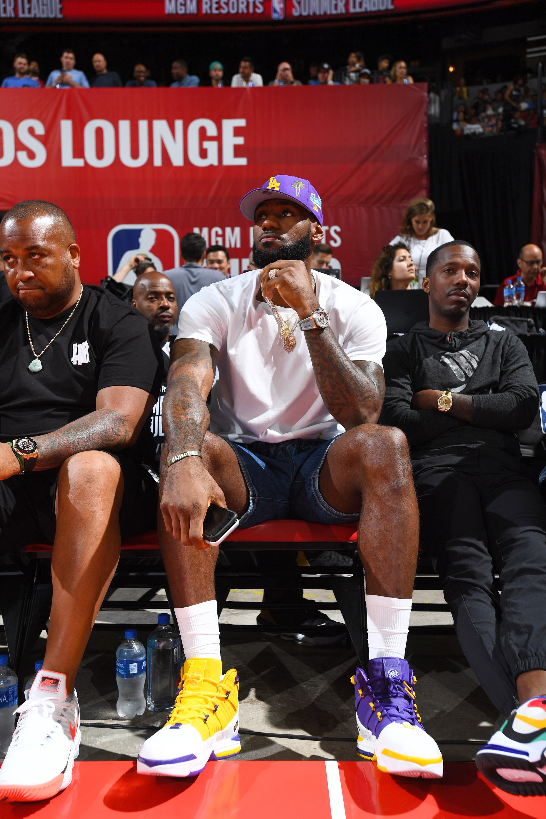 Injuries limited LBJ to 55 games played in the 2018-19 season, but he’s had a full off season to chill, rehabilitate, and get right for nightly on-court domination once the NBA season kicks off in October. This weekend we saw LeBron court-side in Las Vegas at the NBA Summer League and he’s looking healthy; but more importantly, he snapped necks with some dummy kicks. James broke out a pair of mismatch Nike Zoom LeBron 3 Retros with perfect color blocking.