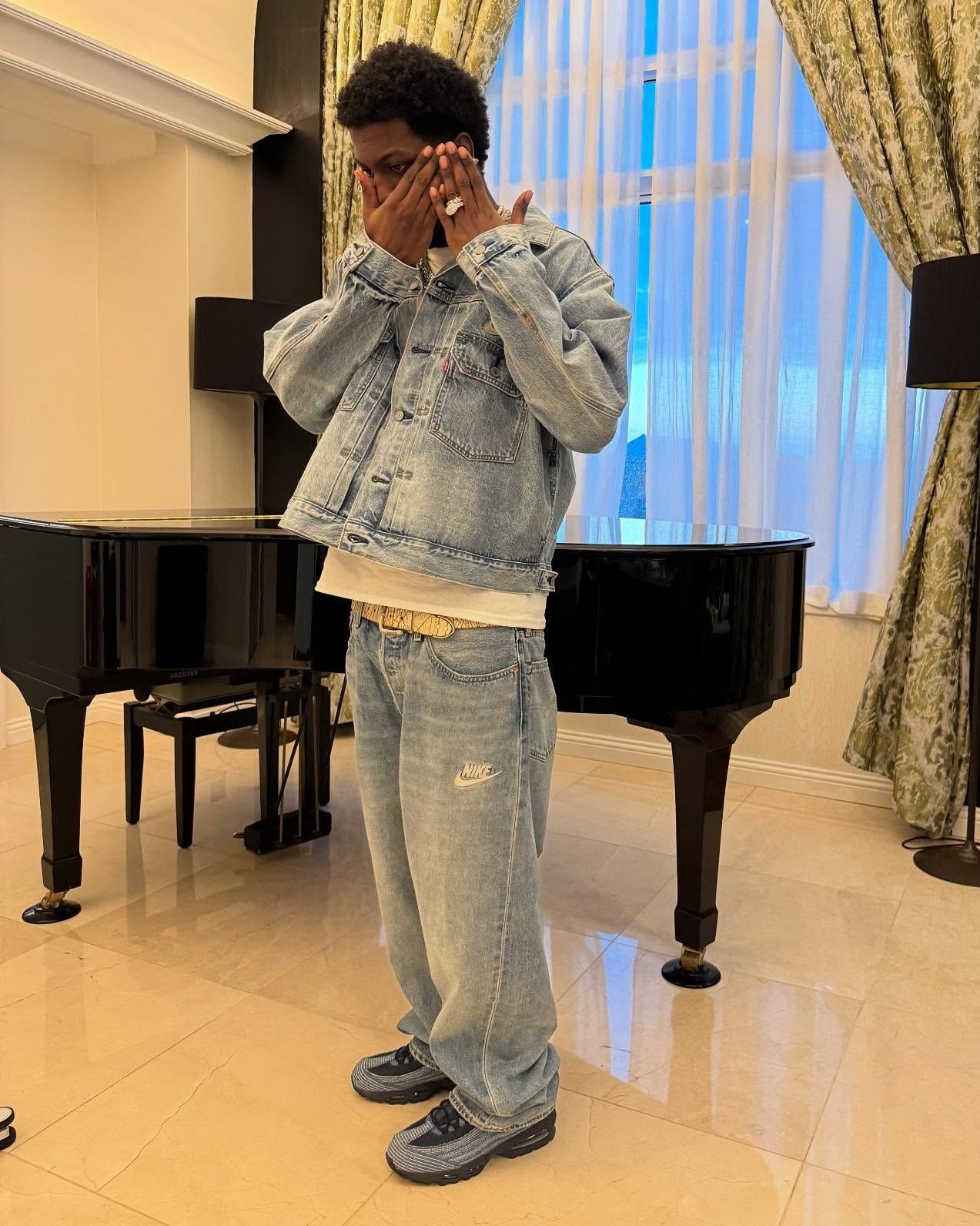 Yachty has also shared a first look at the Levi’s x Nike apparel releasing alongside the Air Max 95s. The offering includes a light wash denim jacket and matching jeans.