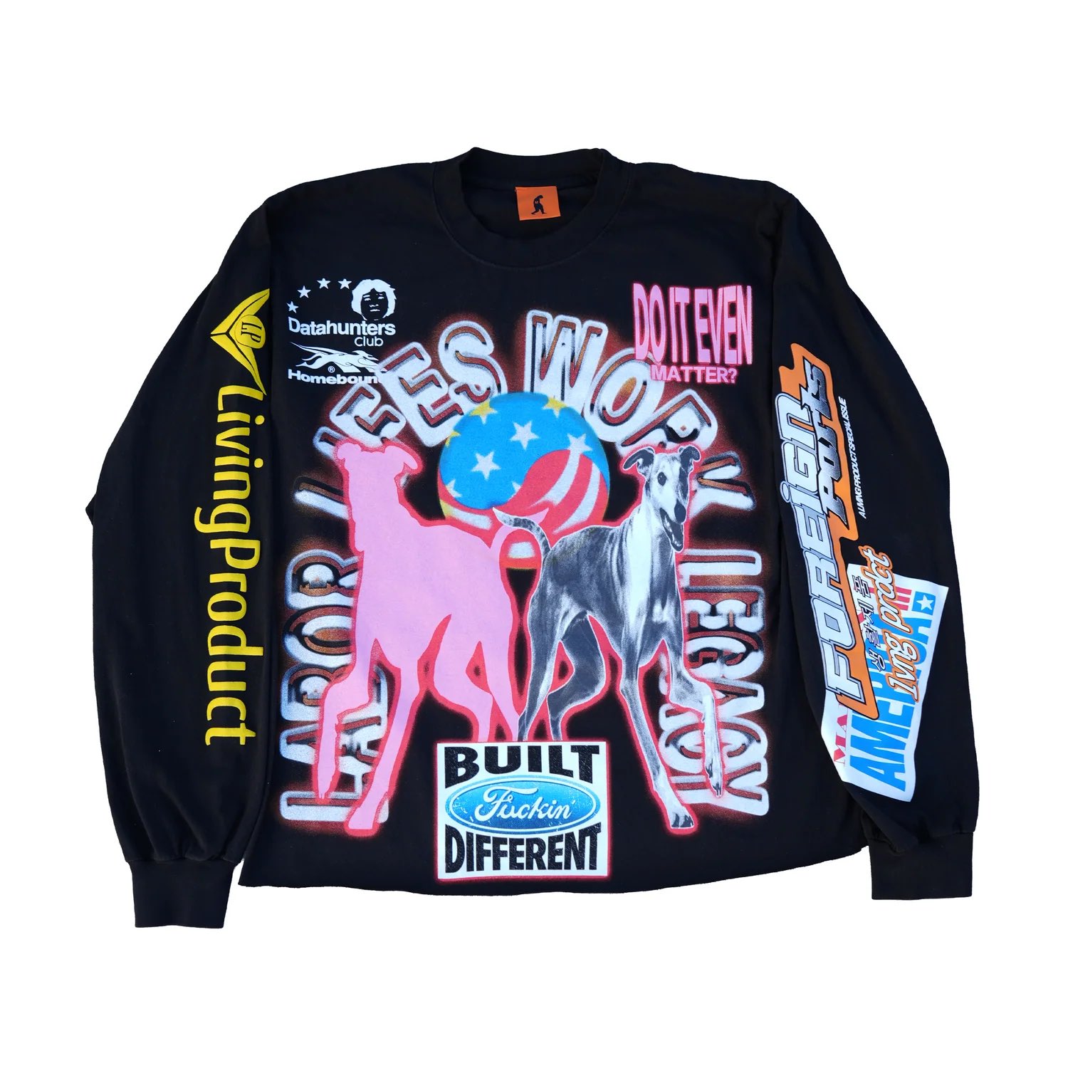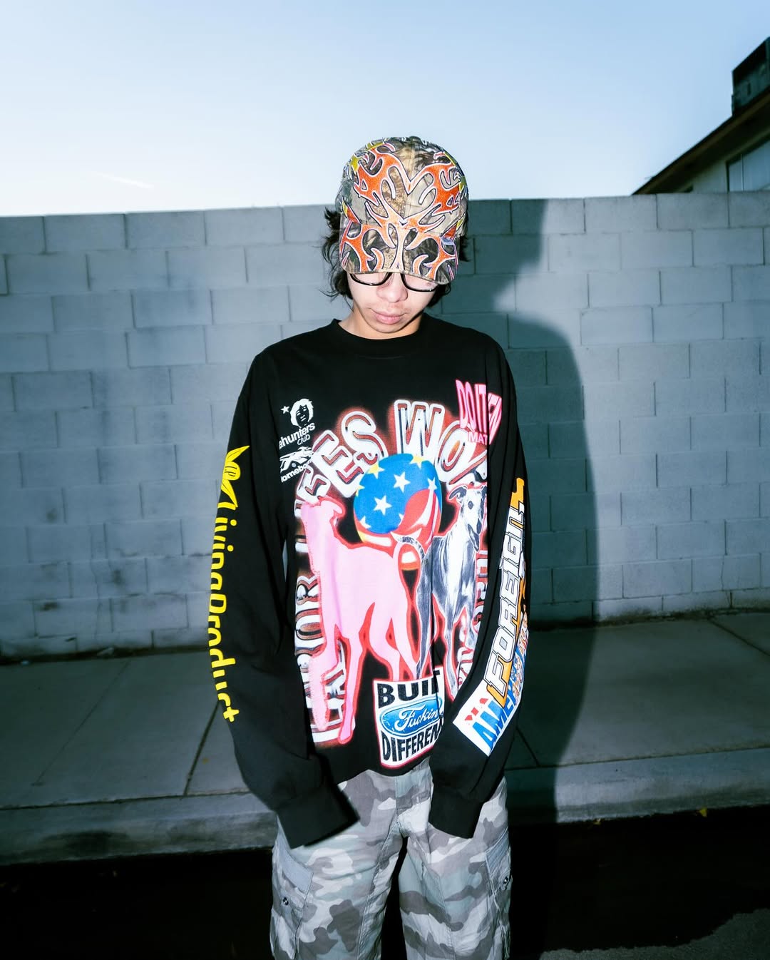 A standout piece is the American Muscle Long Sleeve, adorned with an eccentric mix of graphics, including a dog on the chest (“cuz you gotta have that dog in you”), a Ford-inspired parody logo, and the words Labor, Life’s Work, and Legacy. The Smile Or Die Tee is a nod to Young Jeezy’s iconic Snowman t-shirt, while the Metaverse Tee humorously comments on finding digital love with “Somebody in the Metaverse loves me” across the chest. The brand’s signature Man vs. Nature Hats also return in Productivity Pink, Blue Collar Blue, Orange, Silver, Green, and Purple.