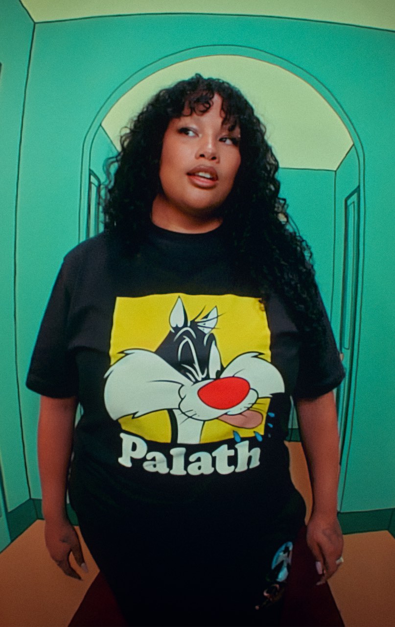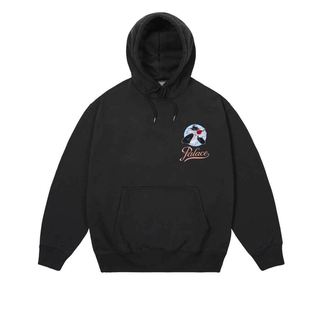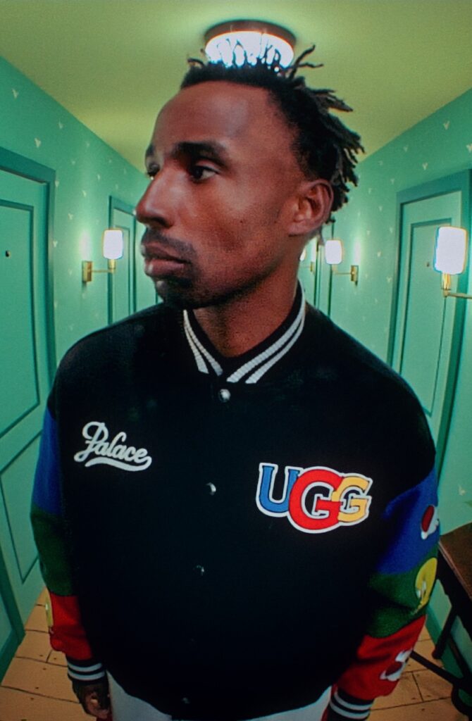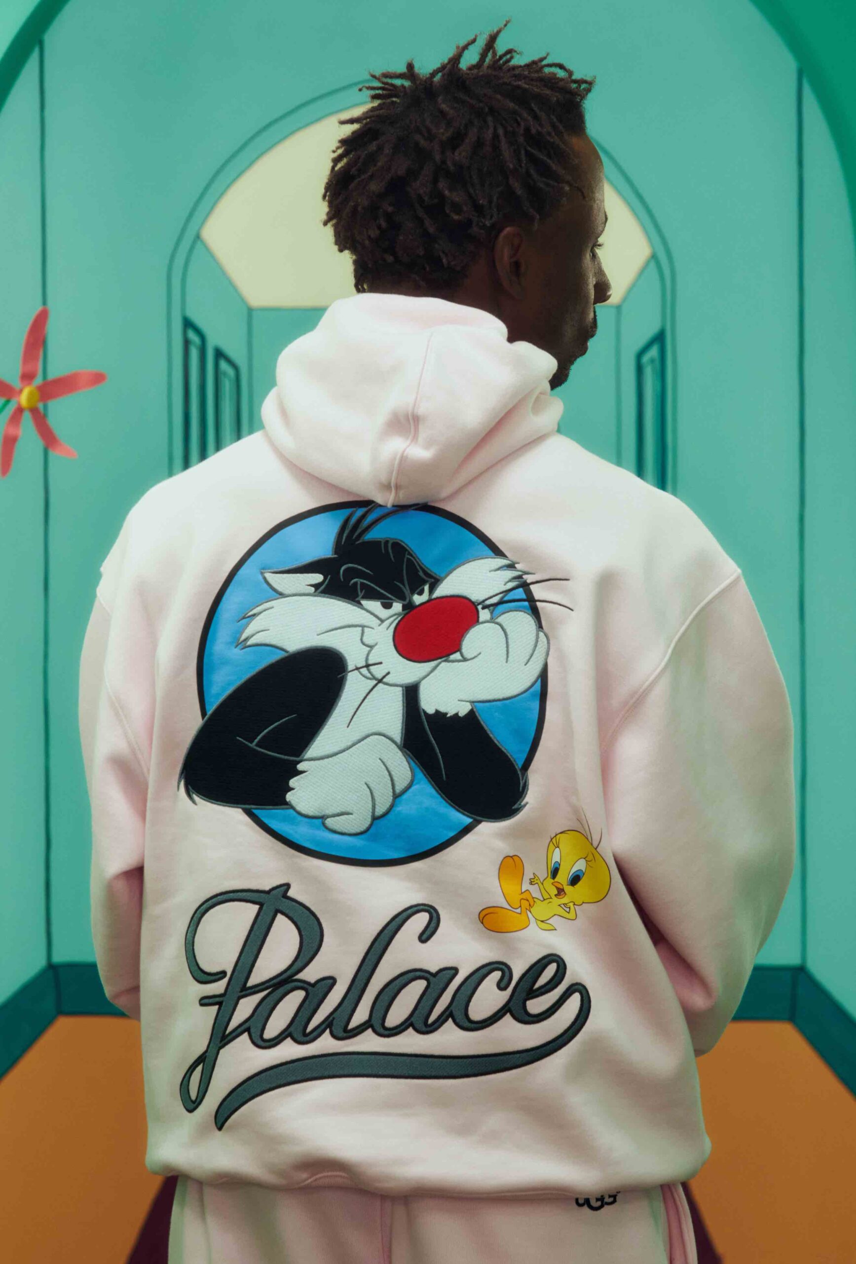 The accompanying campaign, directed by Palace collaborator Adam Toddhunter, stars Palace skateboarder and artist Alexandrino Ferreira Da Silva, British singer and DJ Shygirl, and Sylvester. The artists and animated character find themselves in a fictional hotel with doorways to nowhere, reminiscent of classic film tropes and drawing inspiration from ’90s music videos, where quick cuts and visual effects are used to create a surreal, disorienting atmosphere.