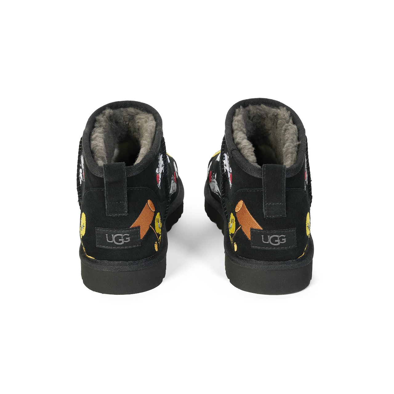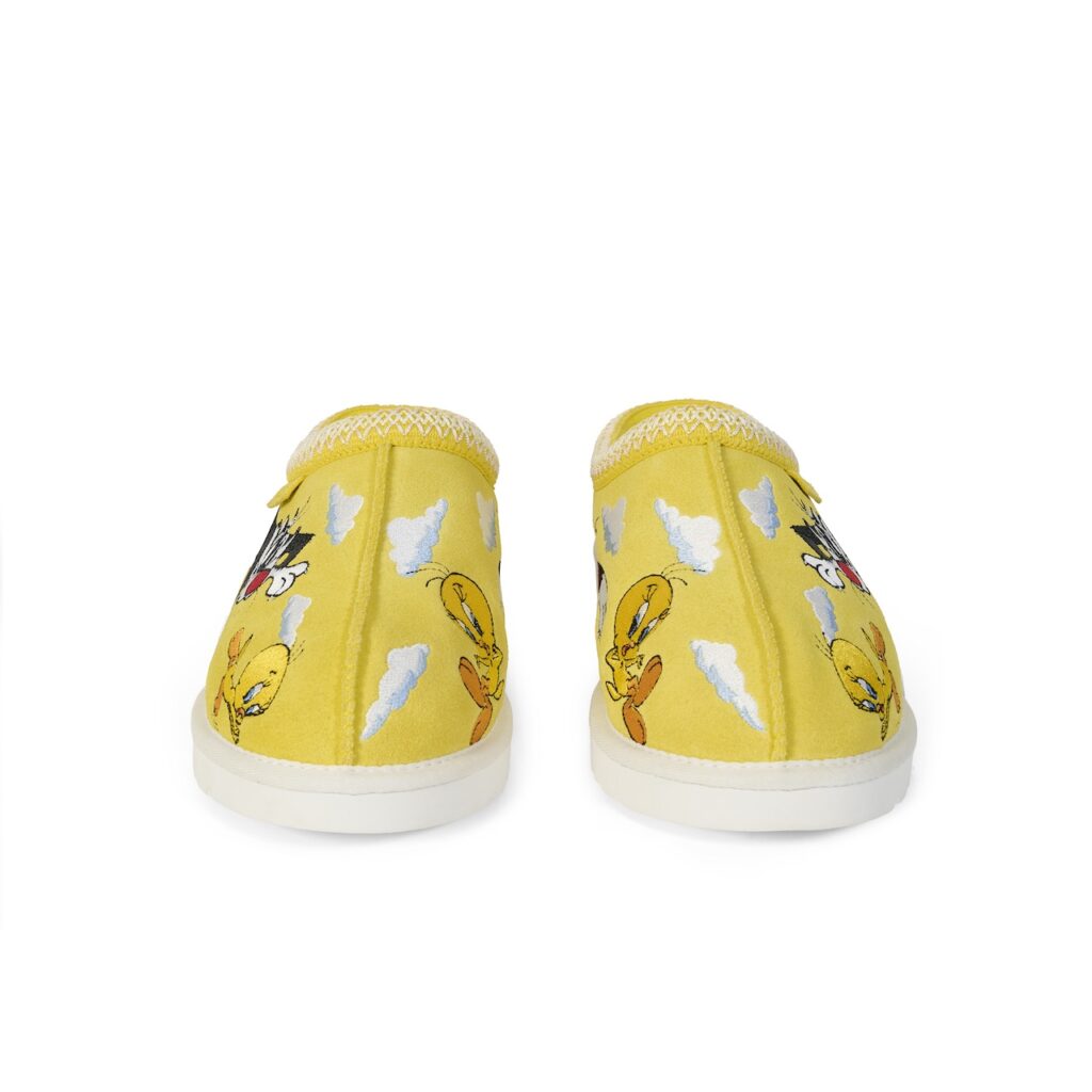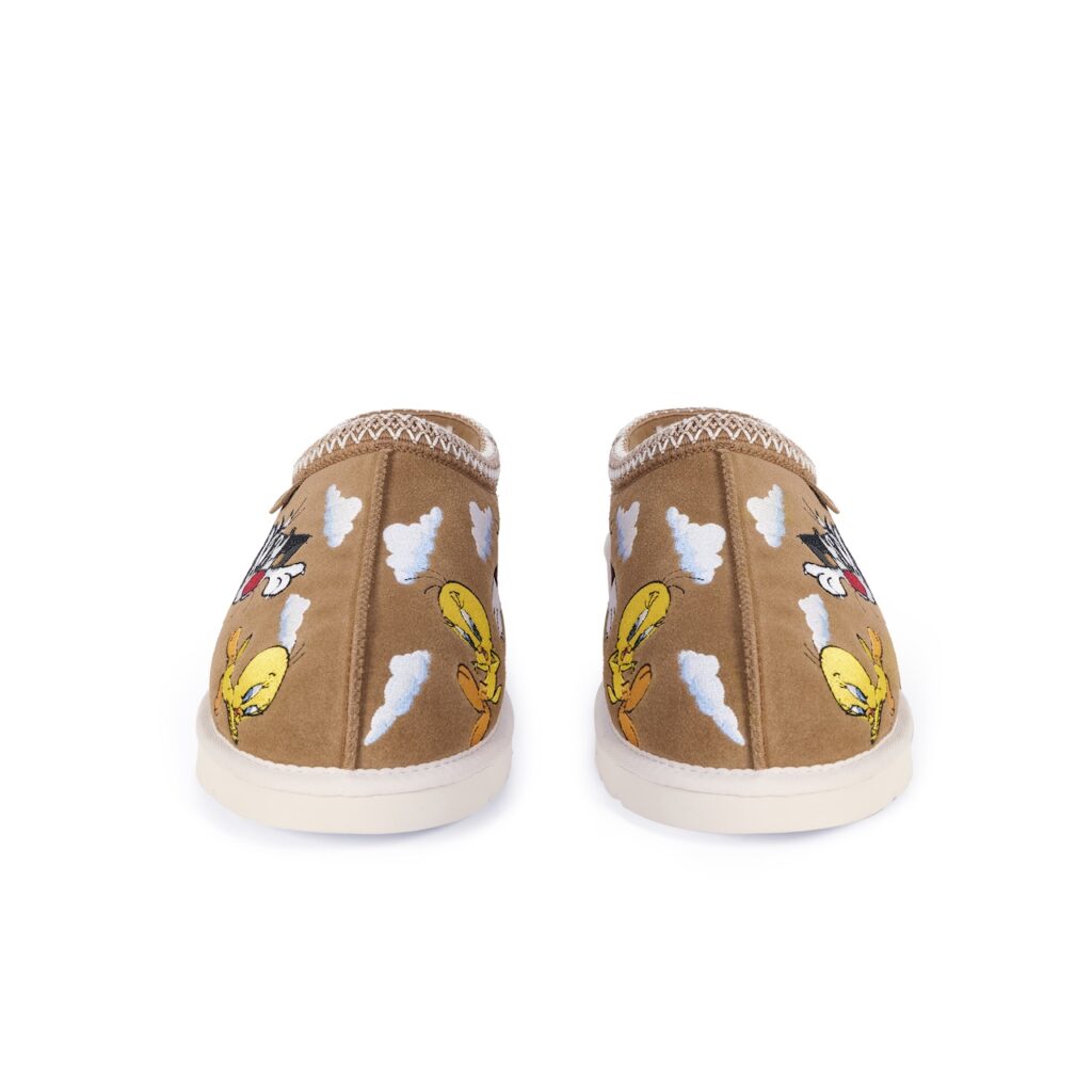 The collection features the Classic Tasman Slipper and Classic Ultra Mini Boot in Chestnut, Yellow, and Black colorways, embellished with multi-layer embroidery of classic Looney Tunes characters Tweety Bird and Sylvester the Cat. Alongside the footwear is a collaborative apparel offering that includes a “Palath” wool varsity jacket, graphic tees, hoodies, and sweatpants in multiple colorways.