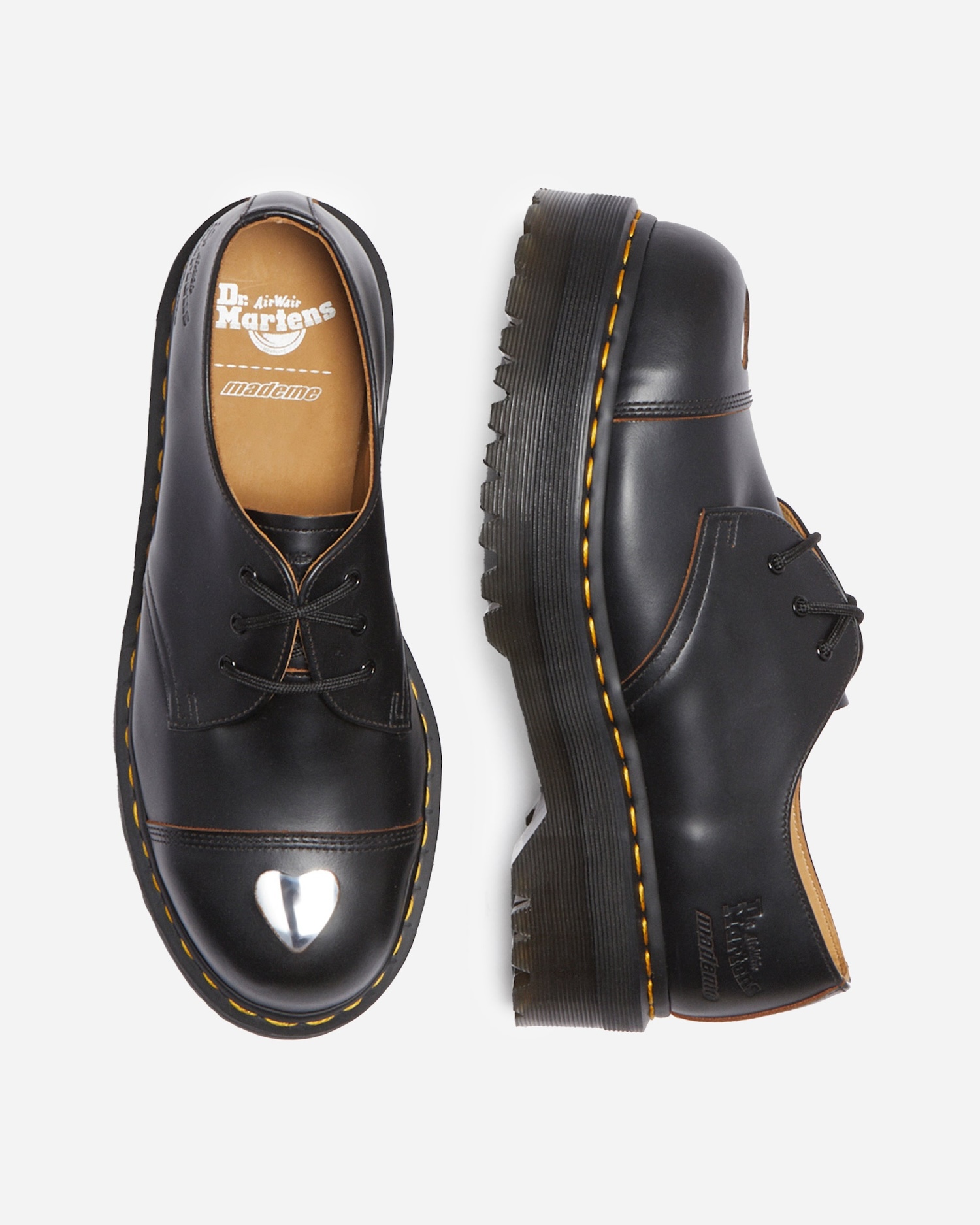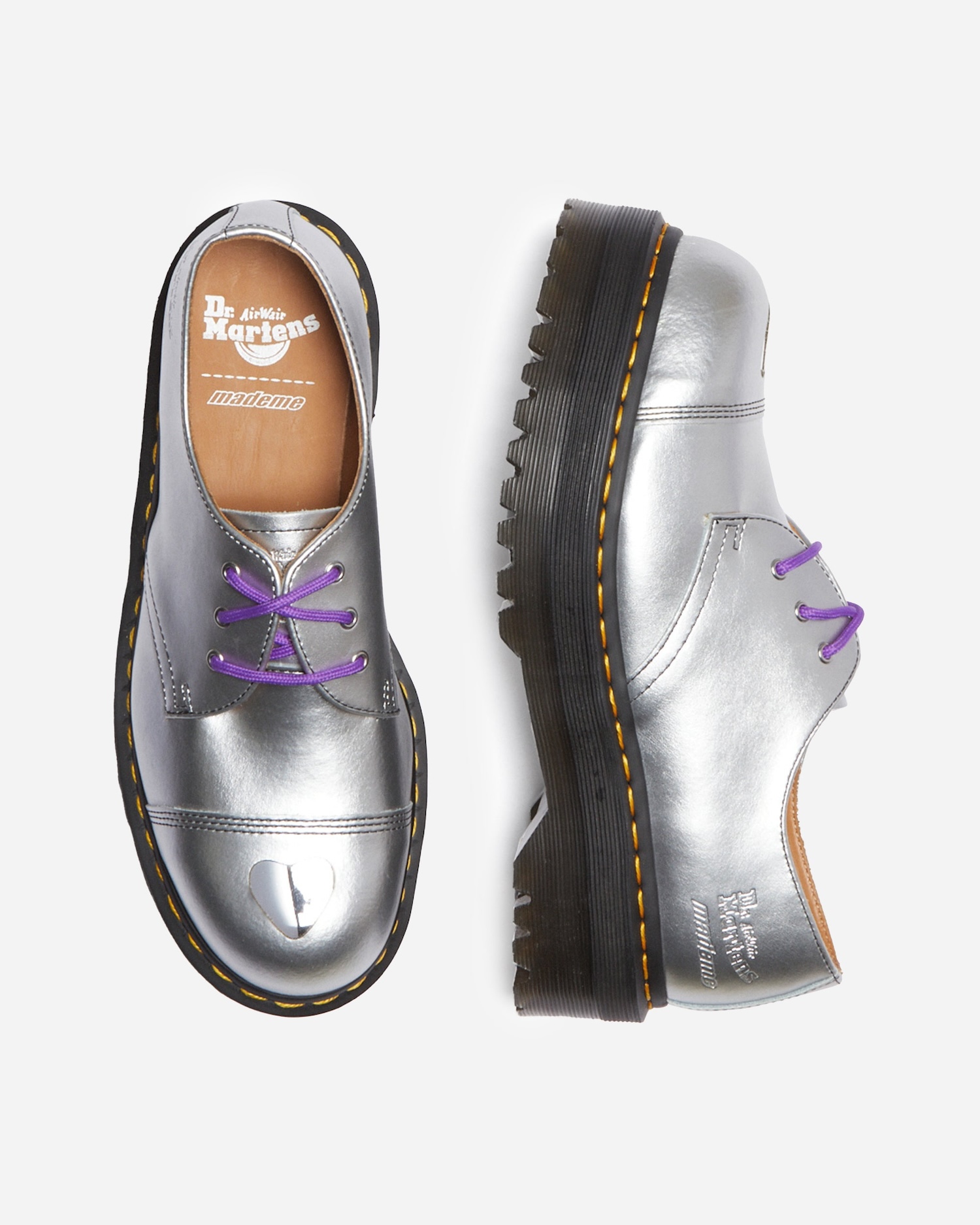 The MadeMe x Dr. Martens collaboration puts a soft twist on a workwear staple, the steel toe. Their rework of the classic 1461 3-eye silhouette features a platform Quad sole and a heart-shaped cutout on the toe to reveal the steel underneath. The shoe comes in two colorways, black and silver, and debossed dual-branding is found on the heel.