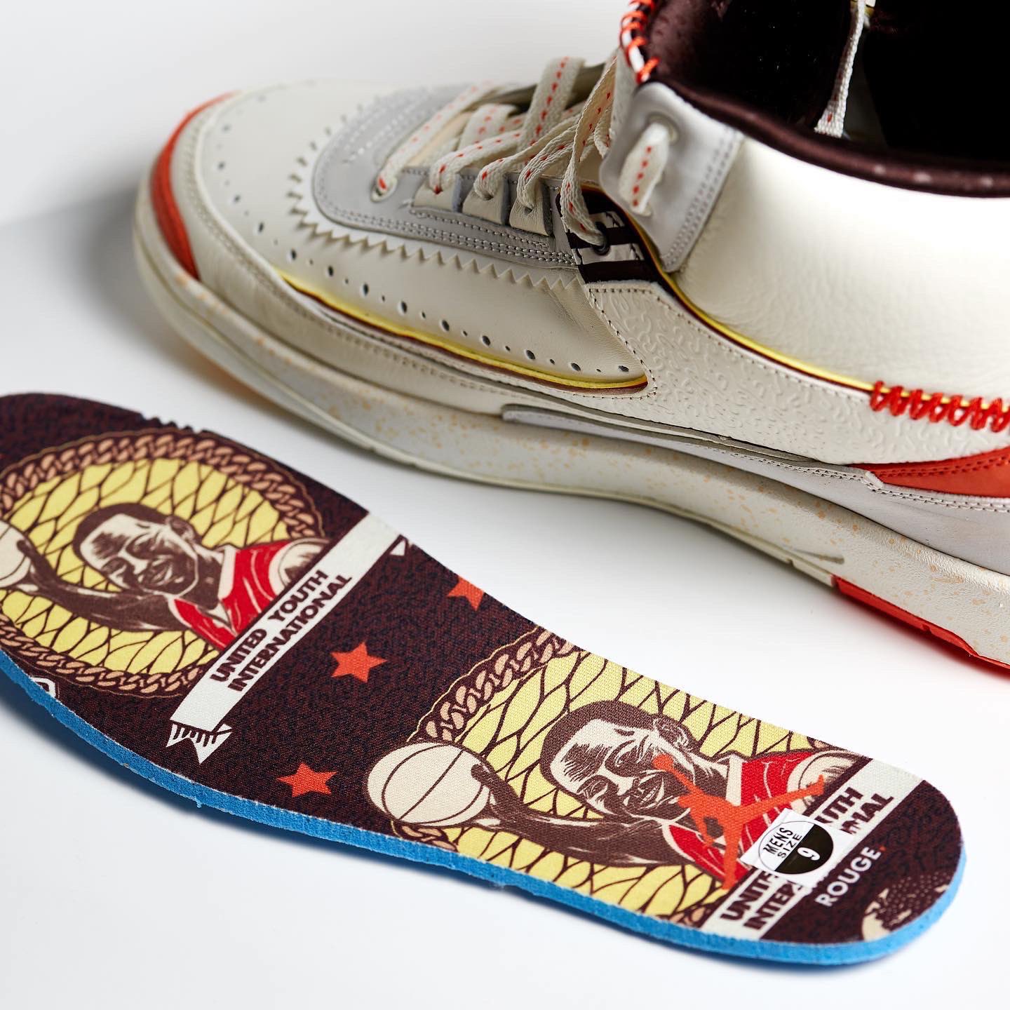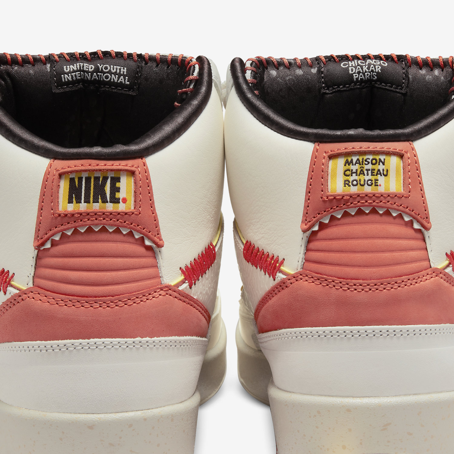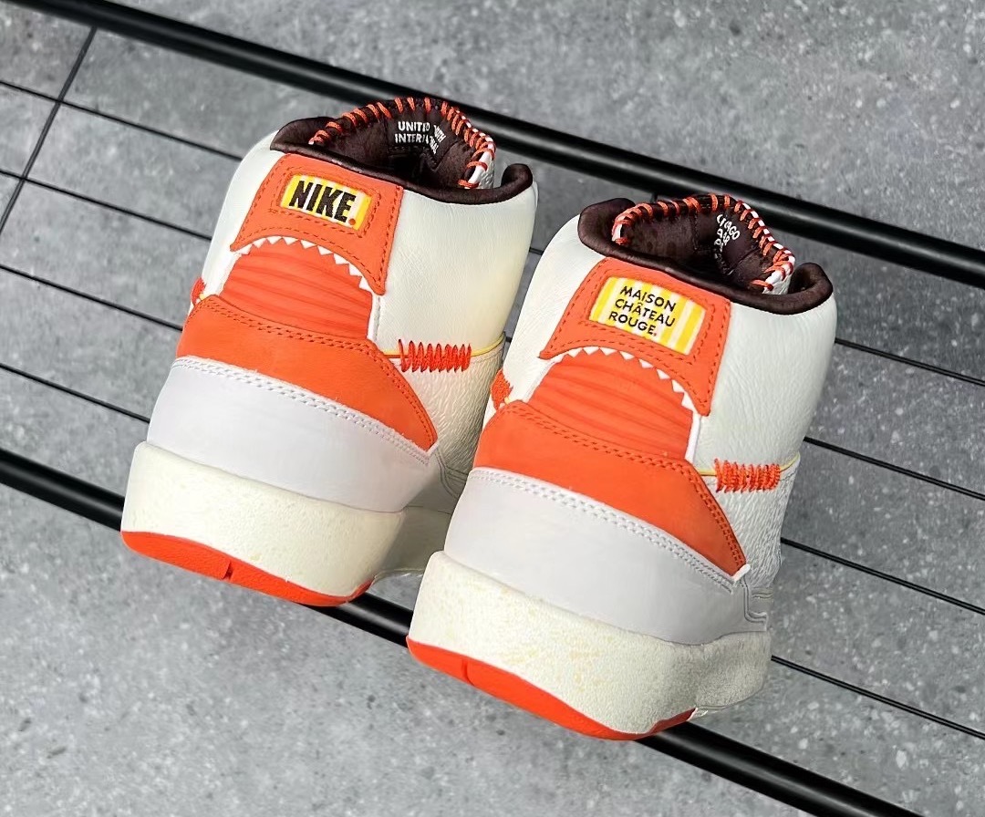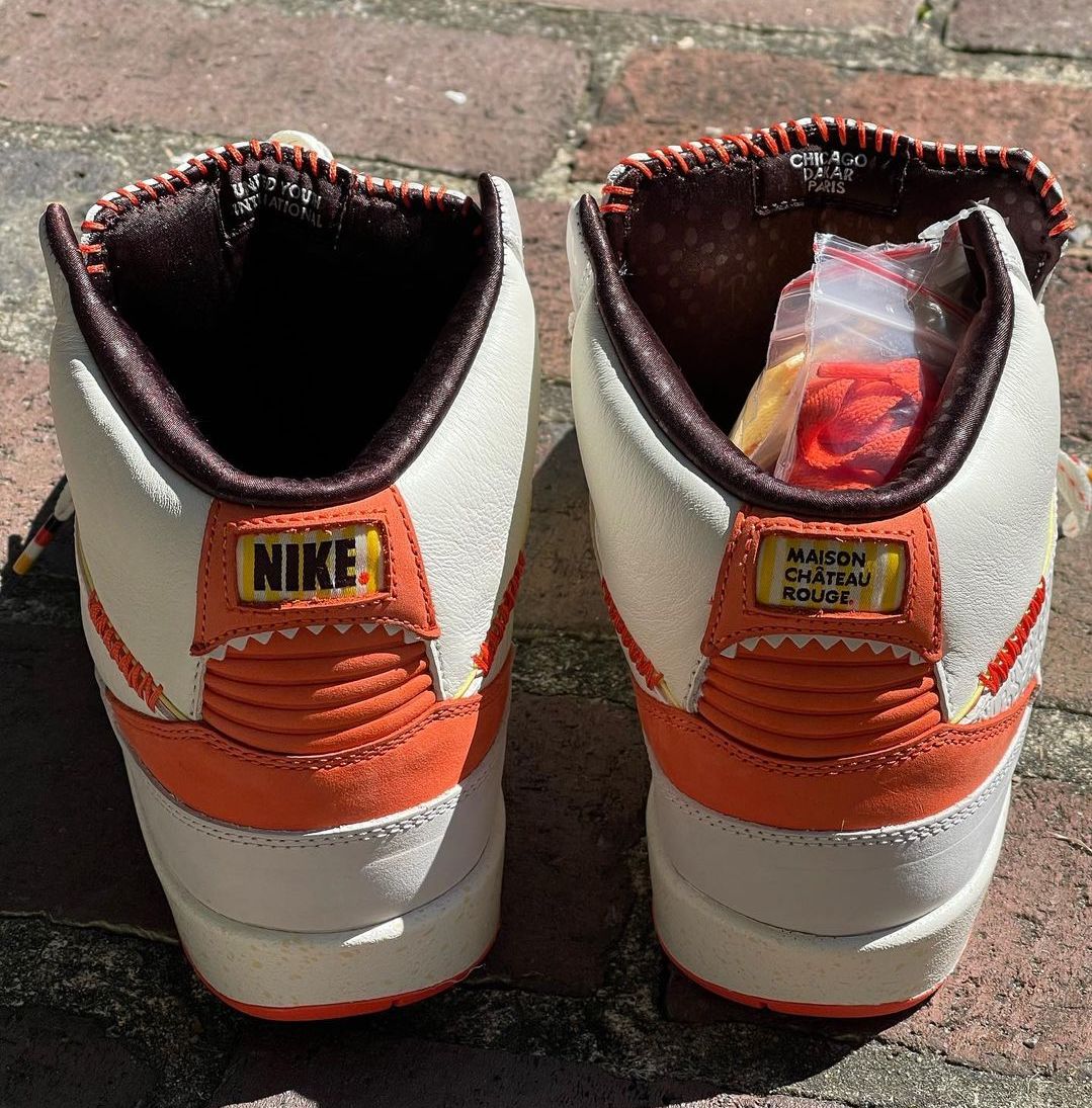 The brand’s Air Jordan 2 collab comes dressed primarily in a white and orange color scheme. Features include a debossed African-inspired design on the tongue and side panels, as well as hand-stitched detailing on the lip of the tongue. These features were also found on the brand’s first Jordan collab, the “Fearless” Air Jordan 1 Mid SE. Yellow accents are found on the Wings logo on the tongue and the Nike and Maison Château Rouge branded windows on the heels. Some hidden details include “United Youth International” and “Chicago Paris Dakar” on the inner tongue tags and Michael Jordan graphics on the insoles.