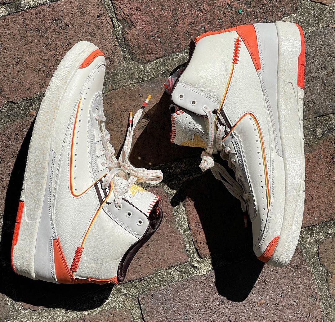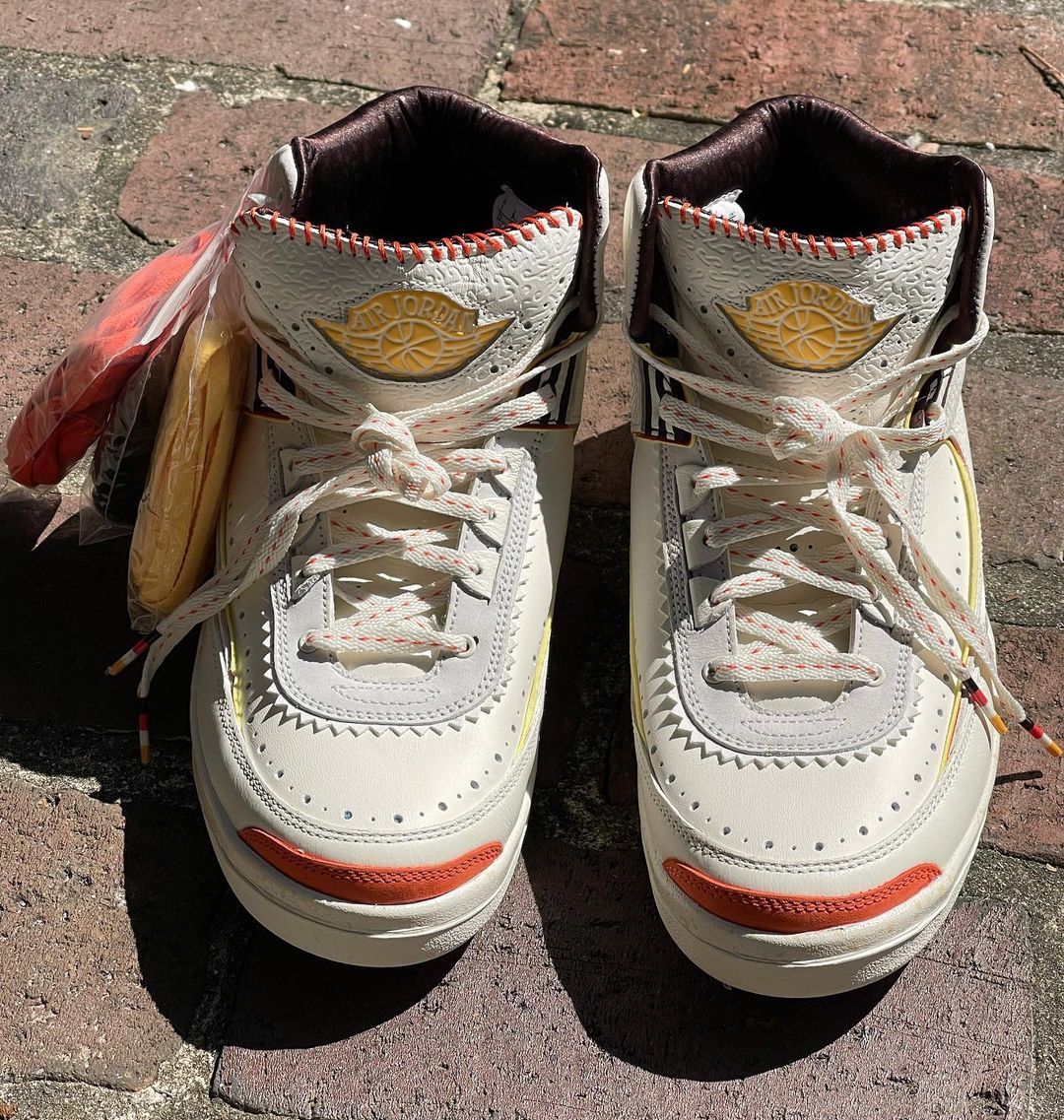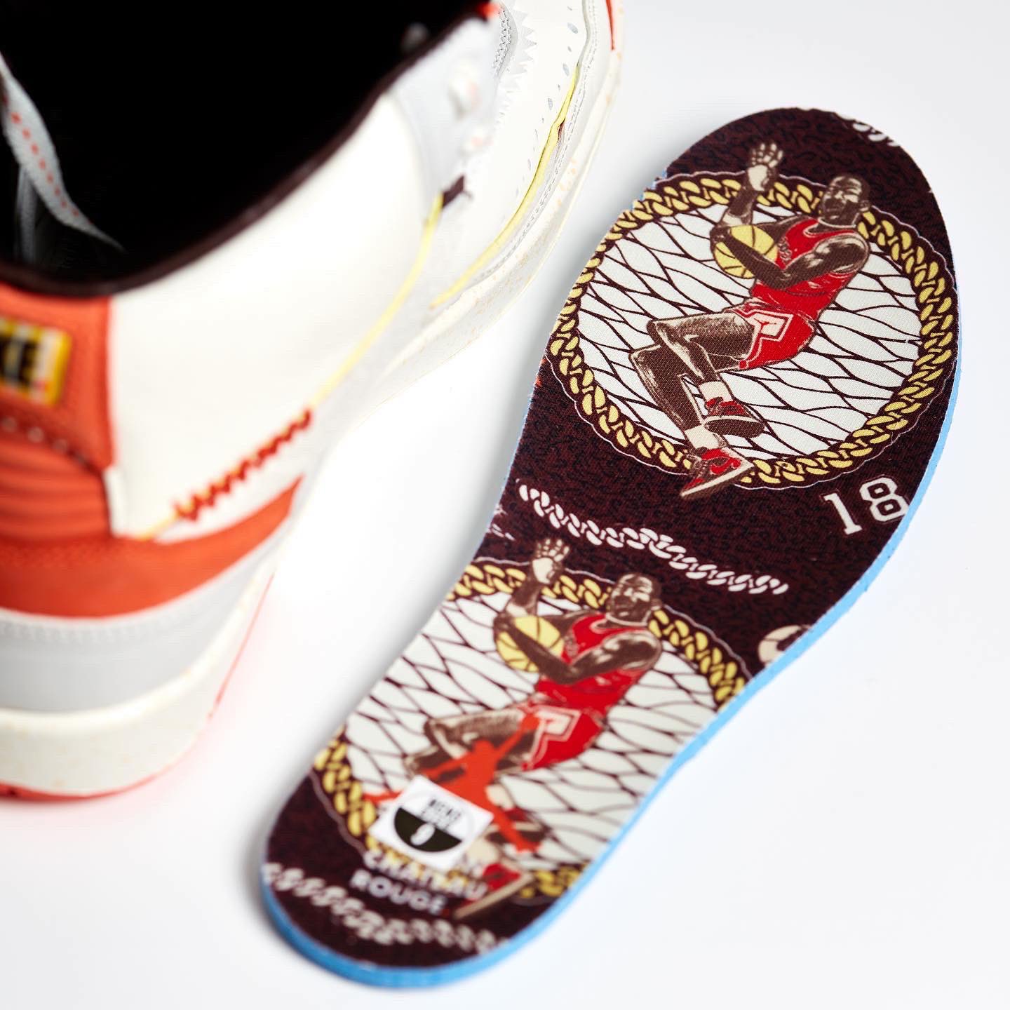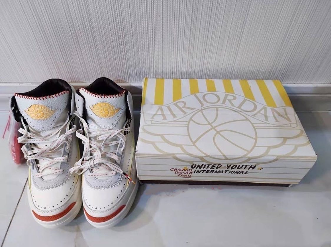 The brand’s Air Jordan 2 collab comes dressed primarily in a white and orange color scheme. Features include a debossed African-inspired design on the tongue and side panels, as well as hand-stitched detailing on the lip of the tongue. These features were also found on the brand’s first Jordan collab, the “Fearless” Air Jordan 1 Mid SE. Yellow accents are found on the Wings logo on the tongue and the Nike and Maison Château Rouge branded windows on the heels. Some hidden details include “United Youth International” and “Chicago Paris Dakar” on the inner tongue tags and Michael Jordan graphics on the insoles.