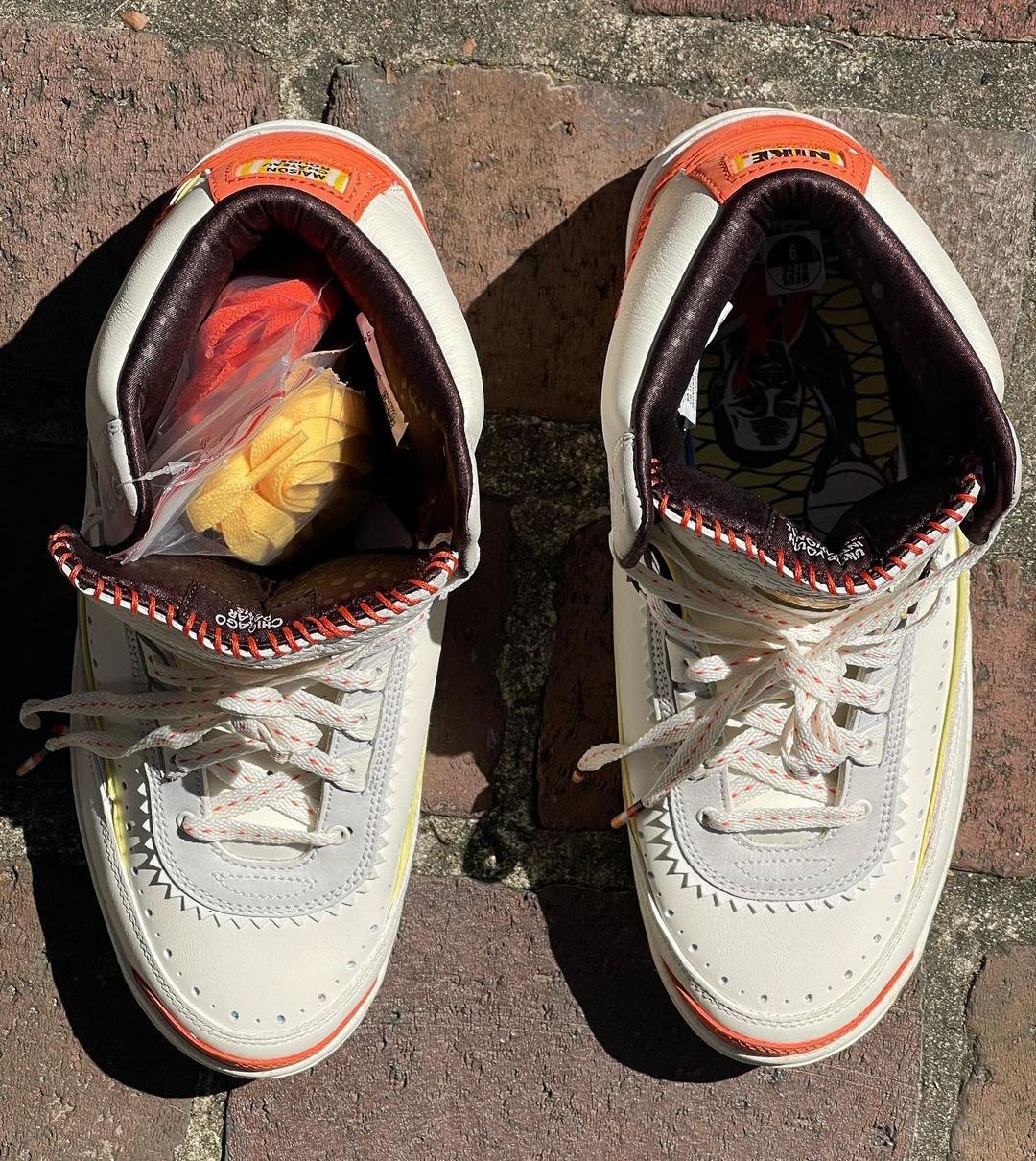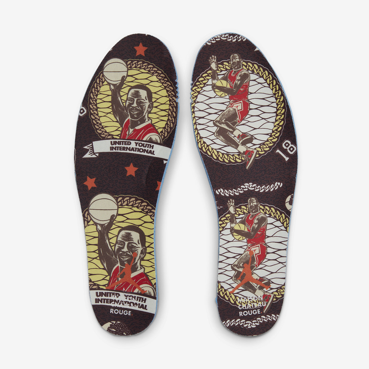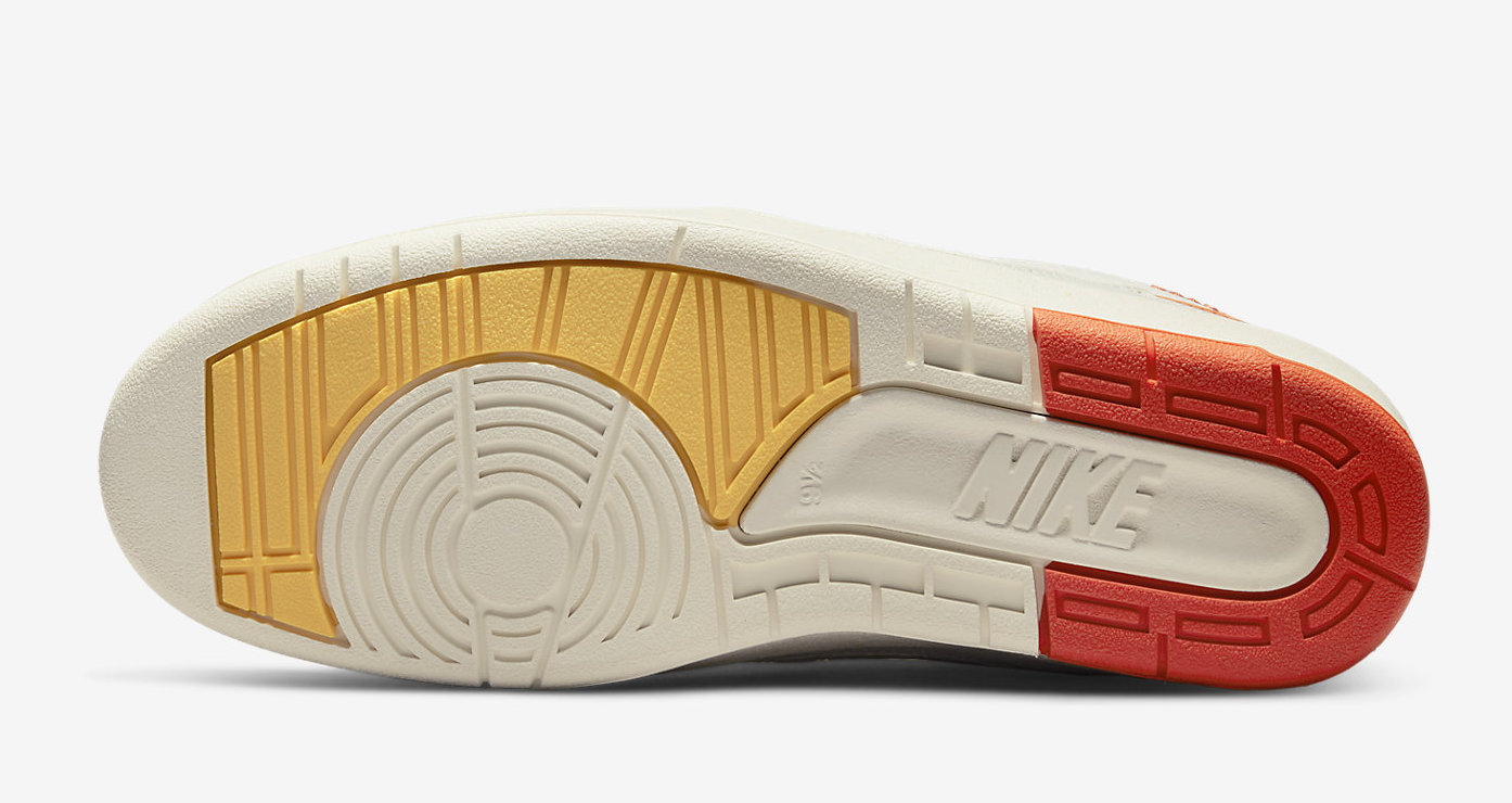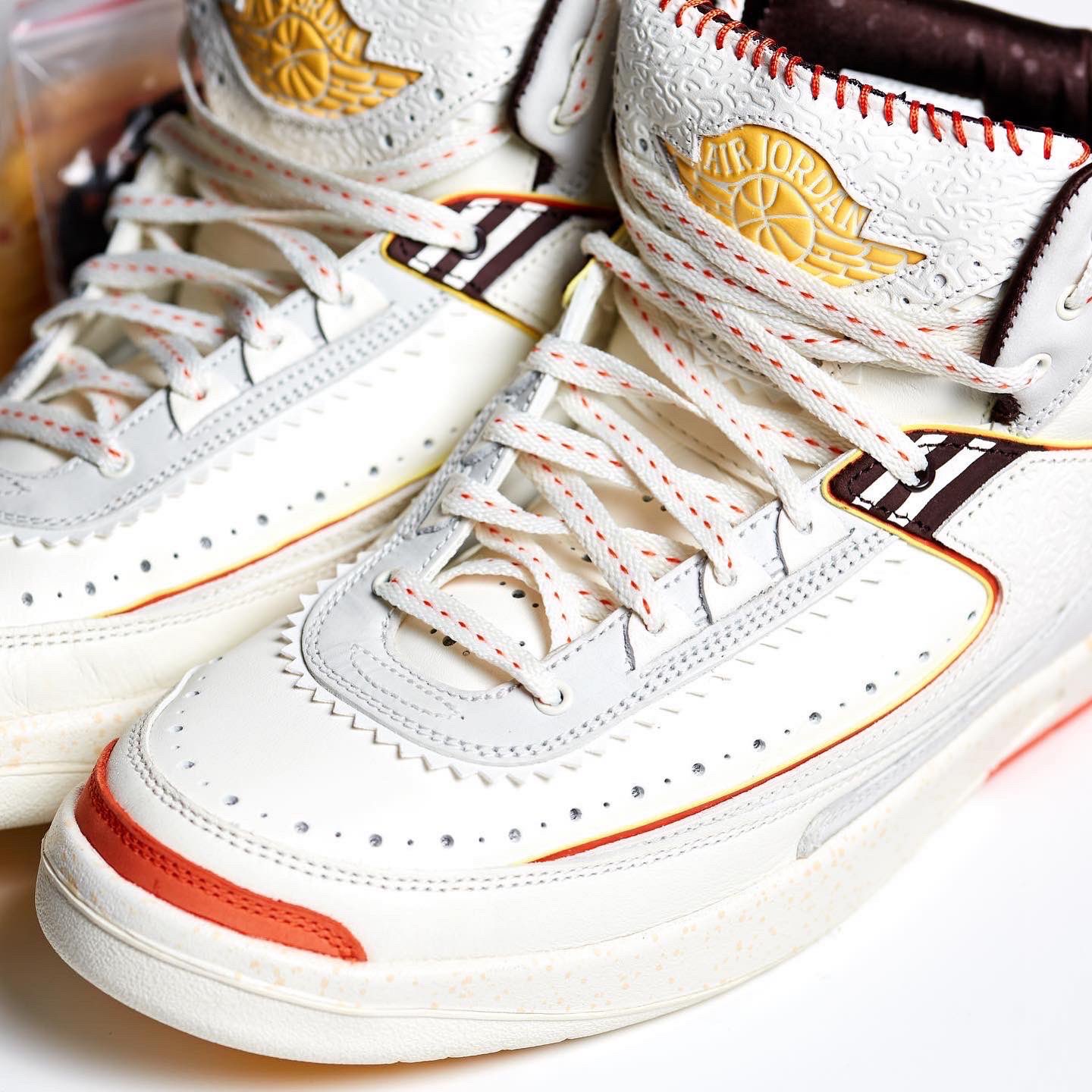 The brand’s Air Jordan 2 collab comes dressed primarily in a white and orange color scheme. Features include a debossed African-inspired design on the tongue and side panels, as well as hand-stitched detailing on the lip of the tongue. These features were also found on the brand’s first Jordan collab, the “Fearless” Air Jordan 1 Mid SE. Yellow accents are found on the Wings logo on the tongue and the Nike and Maison Château Rouge branded windows on the heels. Some hidden details include “United Youth International” and “Chicago Paris Dakar” on the inner tongue tags and Michael Jordan graphics on the insoles.