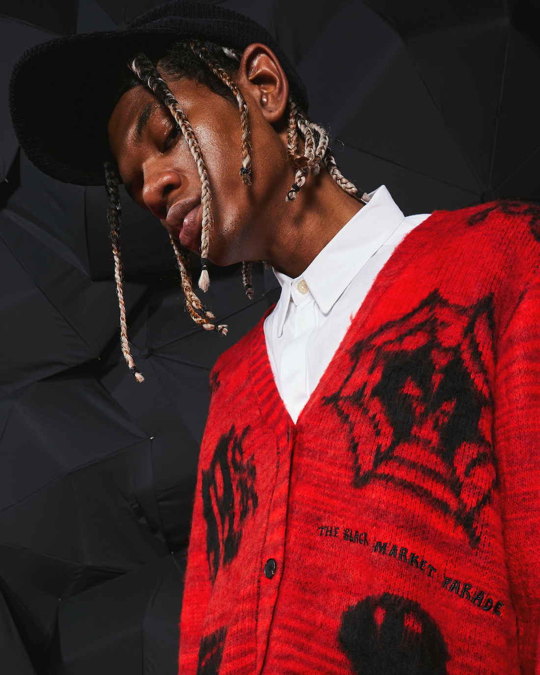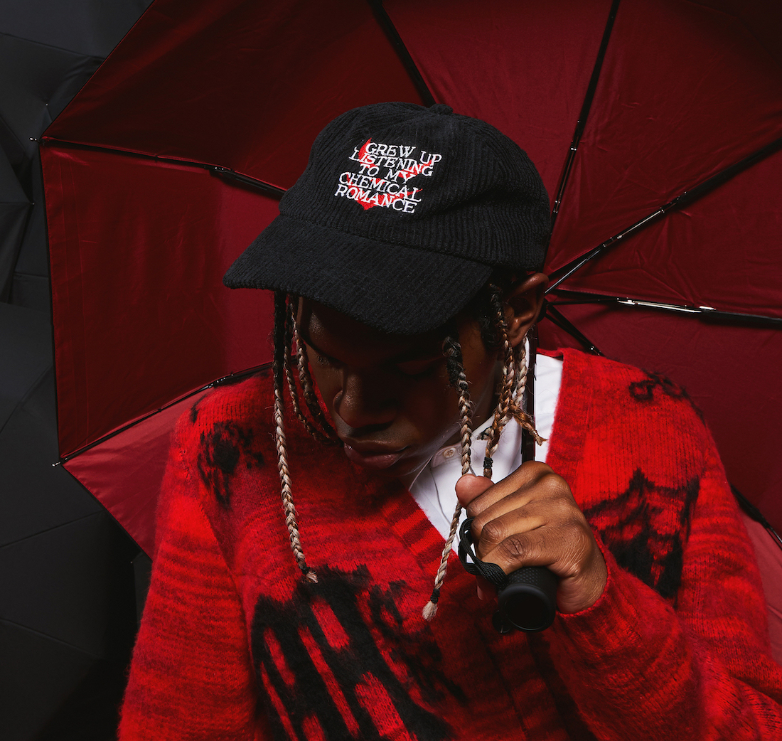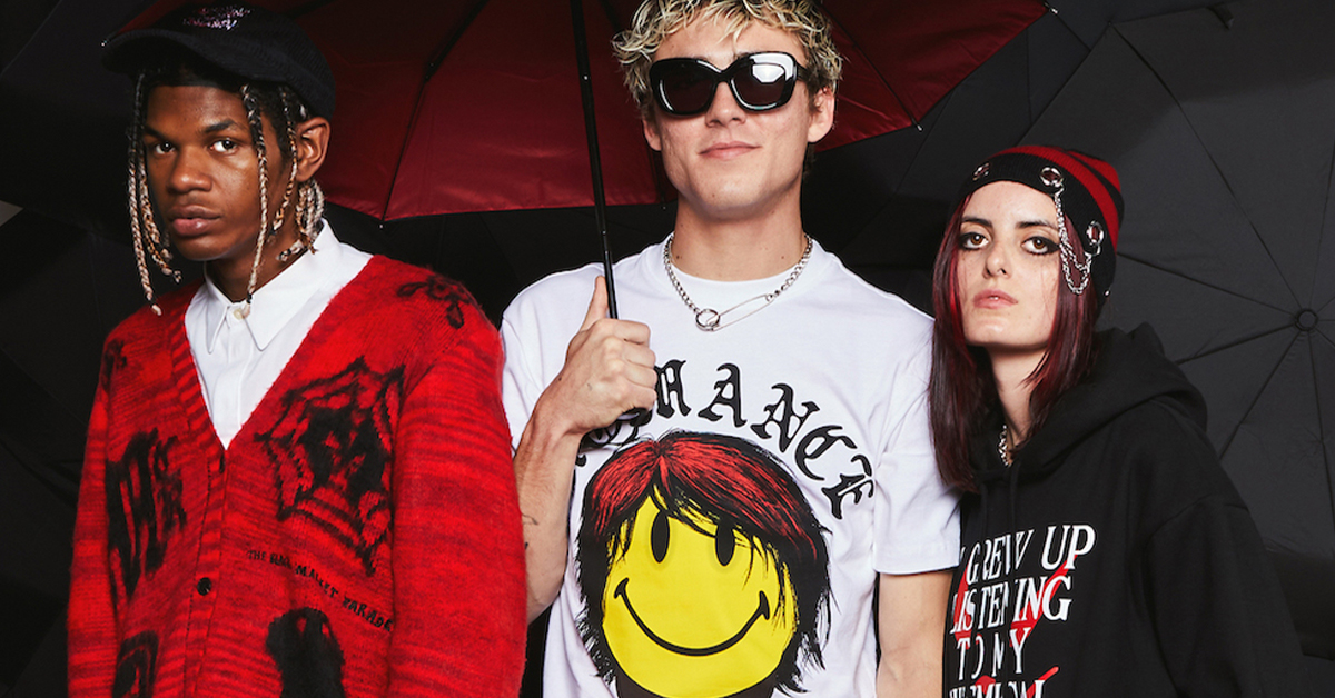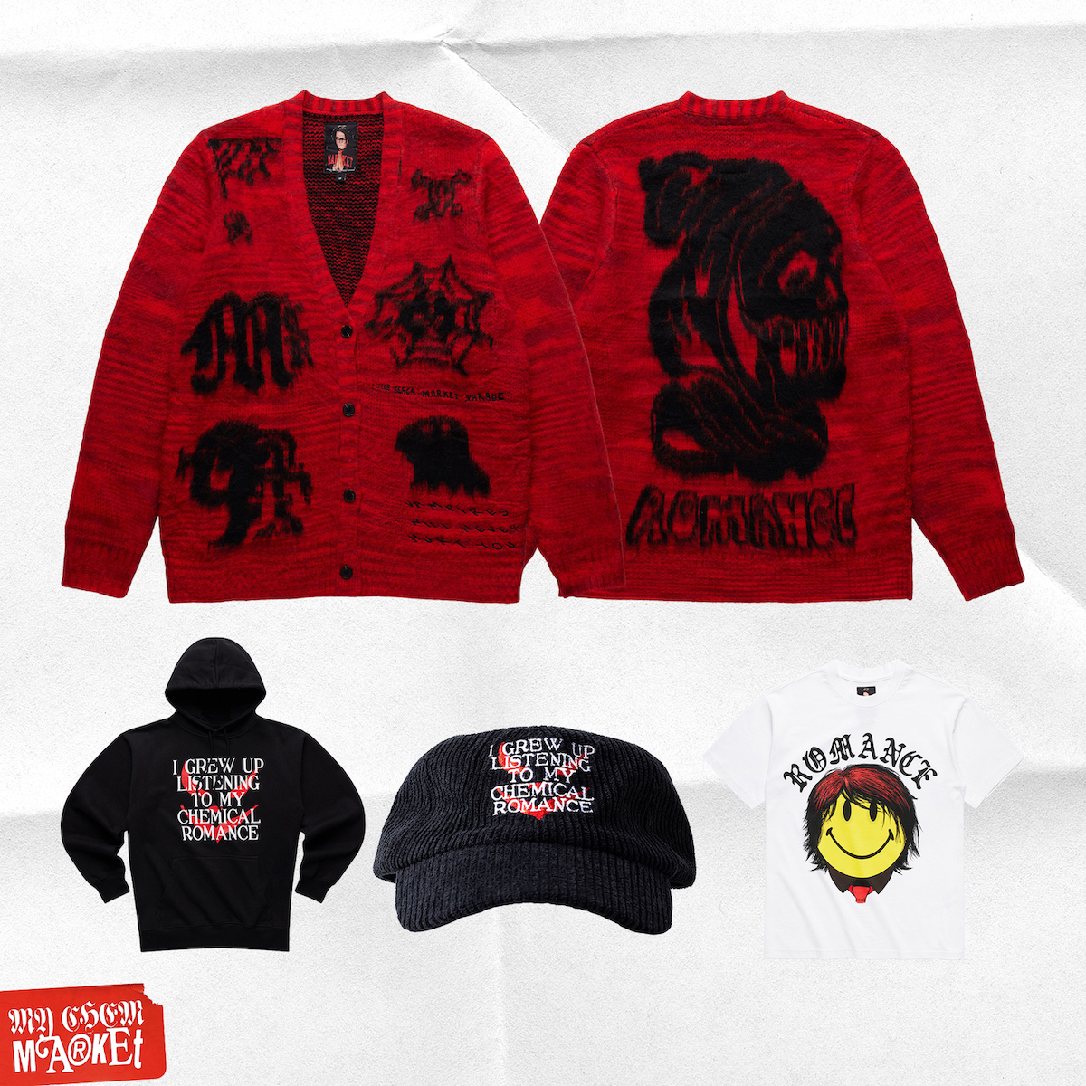The cult LA-based streetwear brand pays homage to MCR’s influential tracks “Vampires Will Never Hurt You” and “The Black Parade” with the embroidered brushed cardigan, the hero piece from the capsule. MARKET also offers a graphic tee that highlights MARKET’s longtime partner SMILEY, adorning the yellow smiley face with Gerard Way-like red hair and red tie. Rounding out the capsule is an “I Grew Up Listening to My Chemical Romance” hoodie and embroidered corduroy hat.
