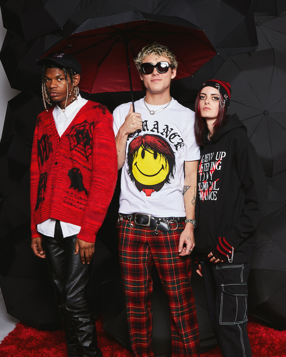 “I grew up in the middle of nowhere and My Chemical Romance was the first group that showed me I didn’t need to be like everyone else around me,” says Malachi Shockley, Director of Merchandising at MARKET. “As a teenager, I wanted to rebel, I wanted to do things differently, and MCR was a beacon of light showing me the way. From the lyrics to their outfits, they showed me that I could be different and still build a community of like minded people around me. I wasn’t alone with these guys in my headphones. We wanted to share that same energy and spirit through this collection – reminding people that they can change their perspectives and honor their full creative selves.”