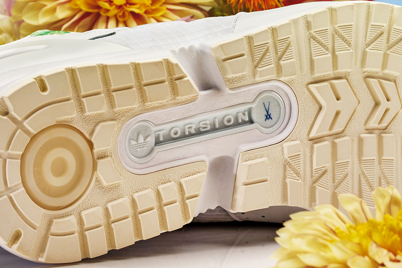 Inspired by a traditional handcrafted porcelain floral vase, the Meissen x adidas ZX 10000 features a premium white leather upper decorated with floral print. Semi-translucent material is used for the eyes-stays and Three Stripes. To offer a clean look, branding usually found on the tongue and lace stay has been removed, with a small Meissen emblem found on the outsole’s Torsion tooling.