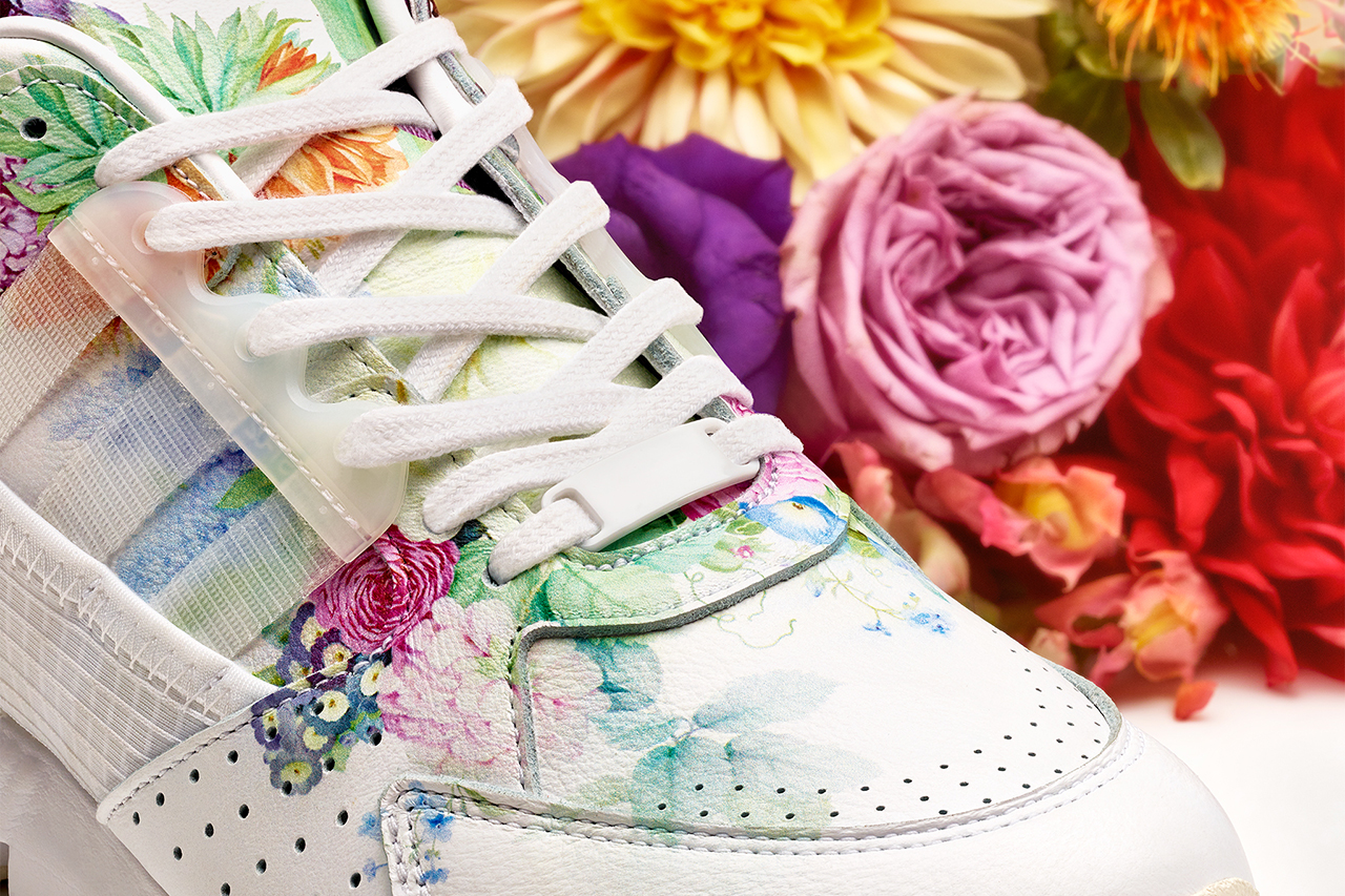 Inspired by a traditional handcrafted porcelain floral vase, the Meissen x adidas ZX 10000 features a premium white leather upper decorated with floral print. Semi-translucent material is used for the eyes-stays and Three Stripes. To offer a clean look, branding usually found on the tongue and lace stay has been removed, with a small Meissen emblem found on the outsole’s Torsion tooling.