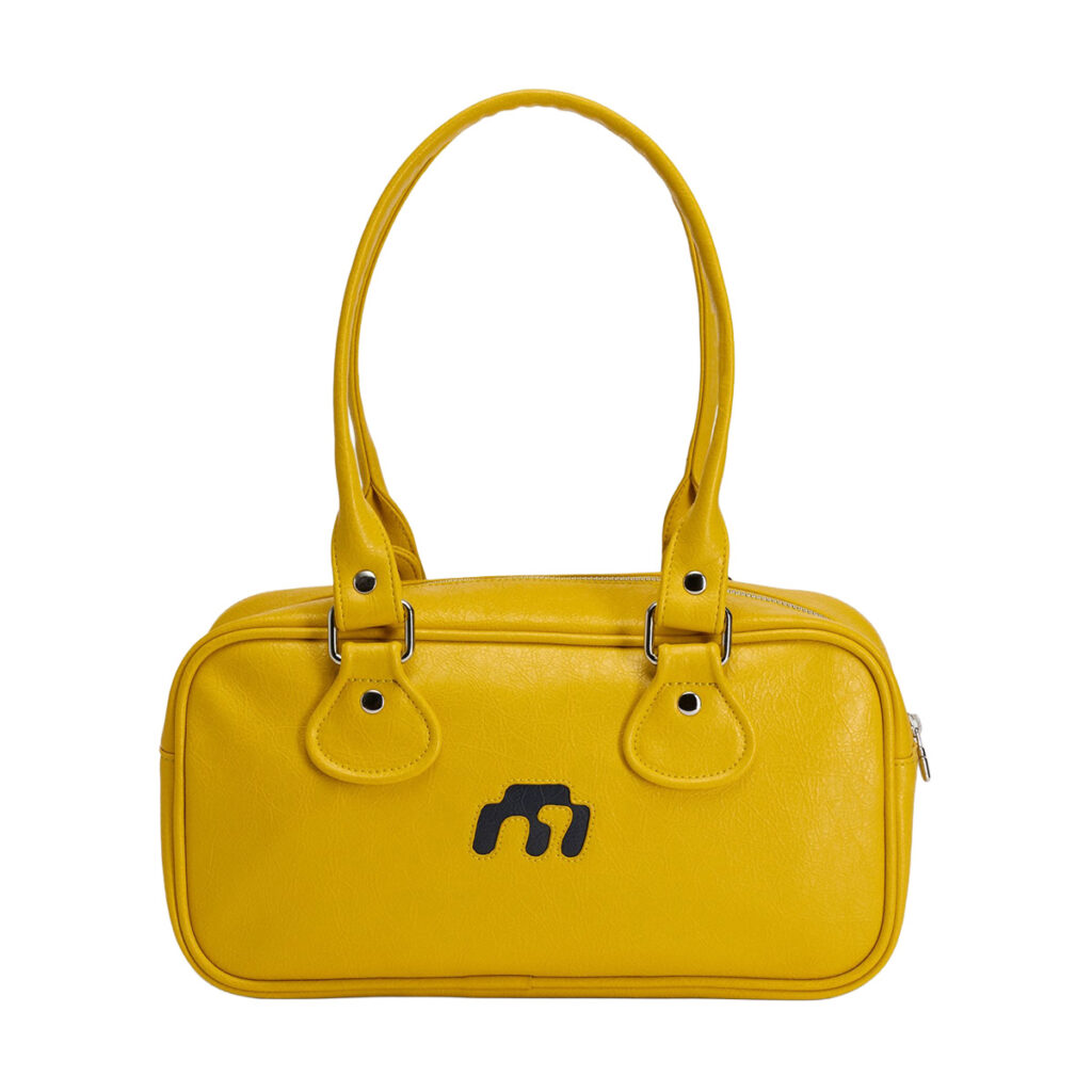 Inspired by automotive culture, apparel pieces include a black slim fit jacket with an asymmetric two way zipper, a black dress with navy padded sleeves, and a three-piece matching navy and yellow set comprised of a corset style track jacket, track pants, and a base layer top. The lineup is completed by a yellow shoulder bag with contrasting navy branded details.