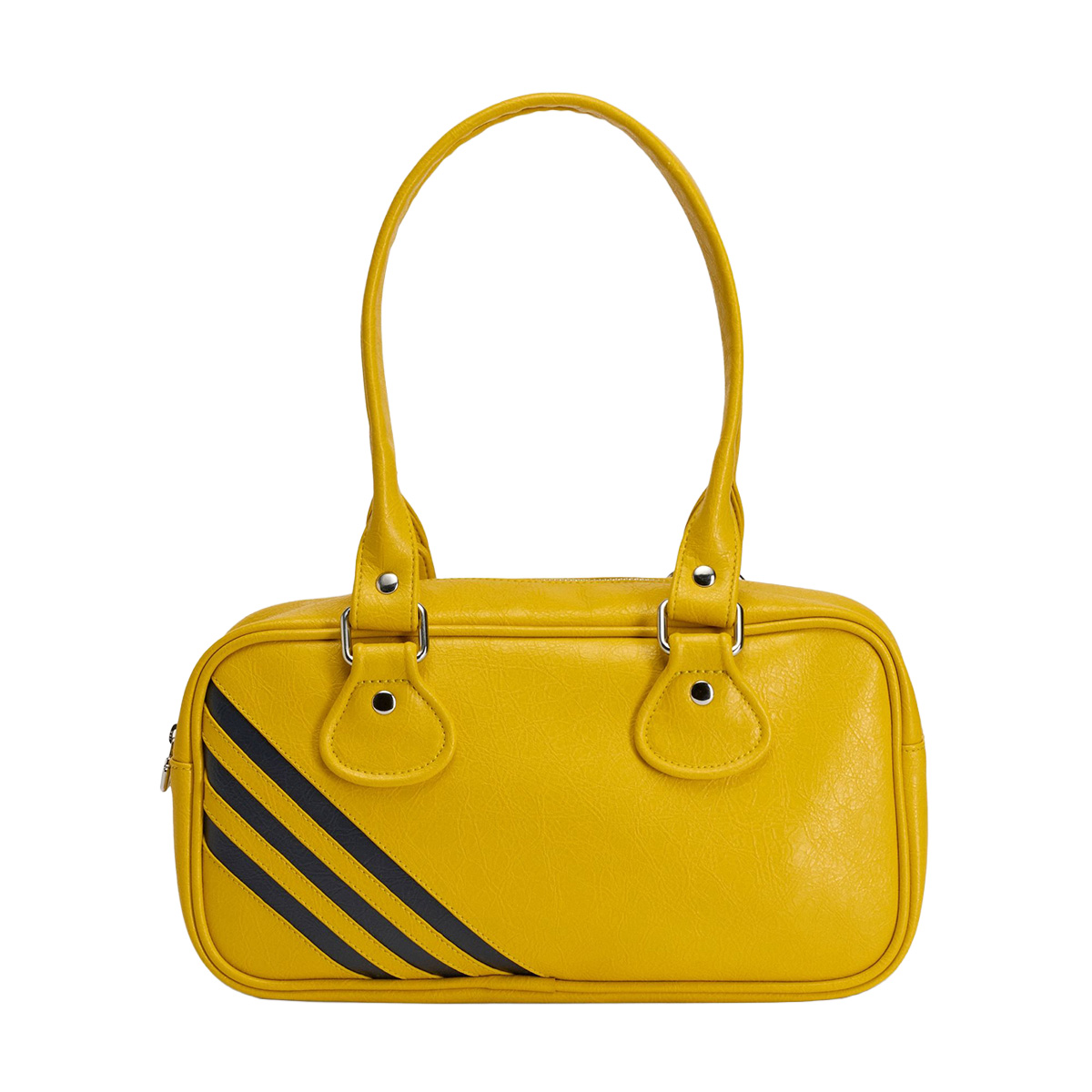 Inspired by automotive culture, apparel pieces include a black slim fit jacket with an asymmetric two way zipper, a black dress with navy padded sleeves, and a three-piece matching navy and yellow set comprised of a corset style track jacket, track pants, and a base layer top. The lineup is completed by a yellow shoulder bag with contrasting navy branded details.