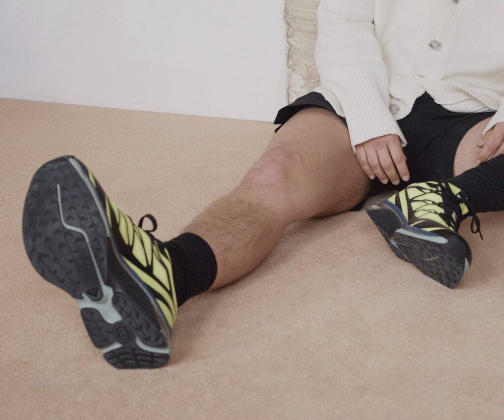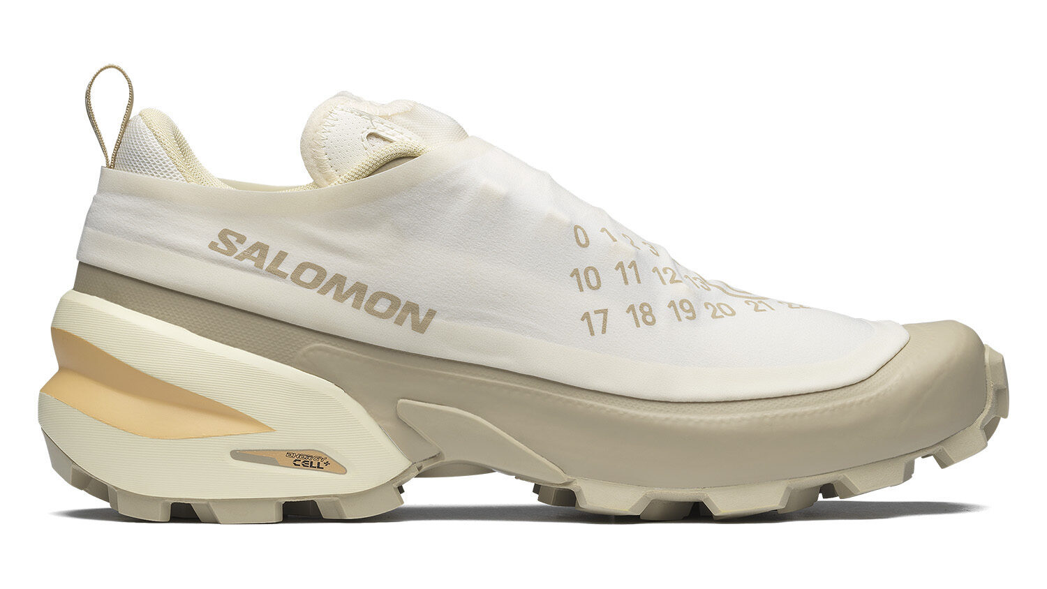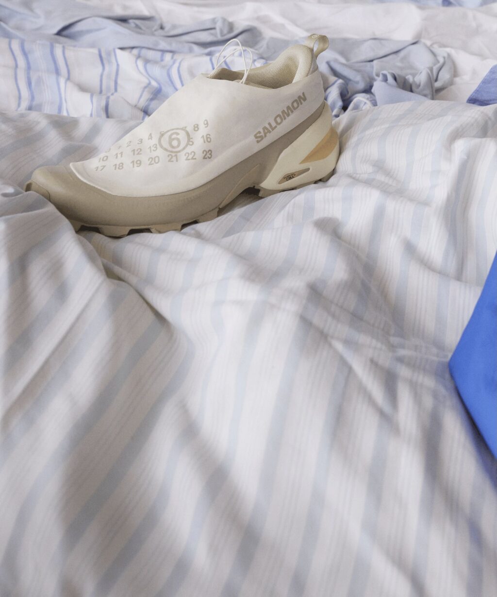 Making its debut in this season’s collection is the Cross Dust, a new trail silhouette originating from the Salomon’s performance “Cross” family, built upon the popular Speedcross sole. Offered in triple black and in a sandy beige, the MM6 Cross Dust explores the common ground between high fashion and rugged performance. It comes equipped with a stitched gaiter across the upper to protect the shoe from dust and debris, featuring intentional wrinkles and folds that nod to Maison Margiela’s celebration of imperfection, while also referencing MM6’s signature dust bag design.
