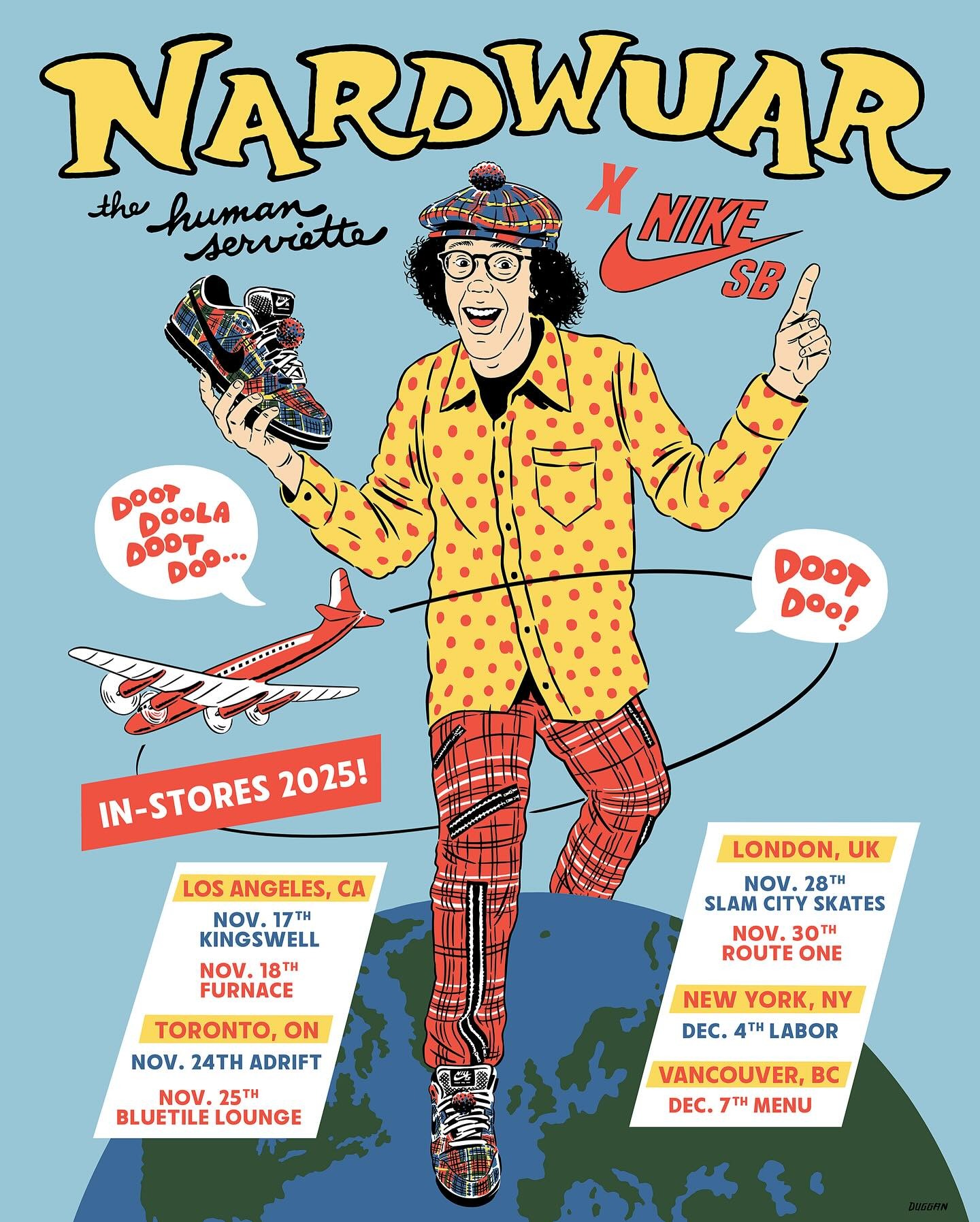 Update (11/10/25): Nardwuar announces his Nike SB Dunk Low collab will release December 6th at skate shops and December 9th on SNKRS. He will also be making in-store appearances at skate shops in Los Angeles, Toronto, London, New York City and Vancouver ahead of the global release. Check out the flier below for dates: