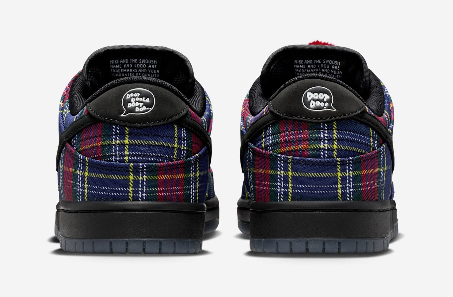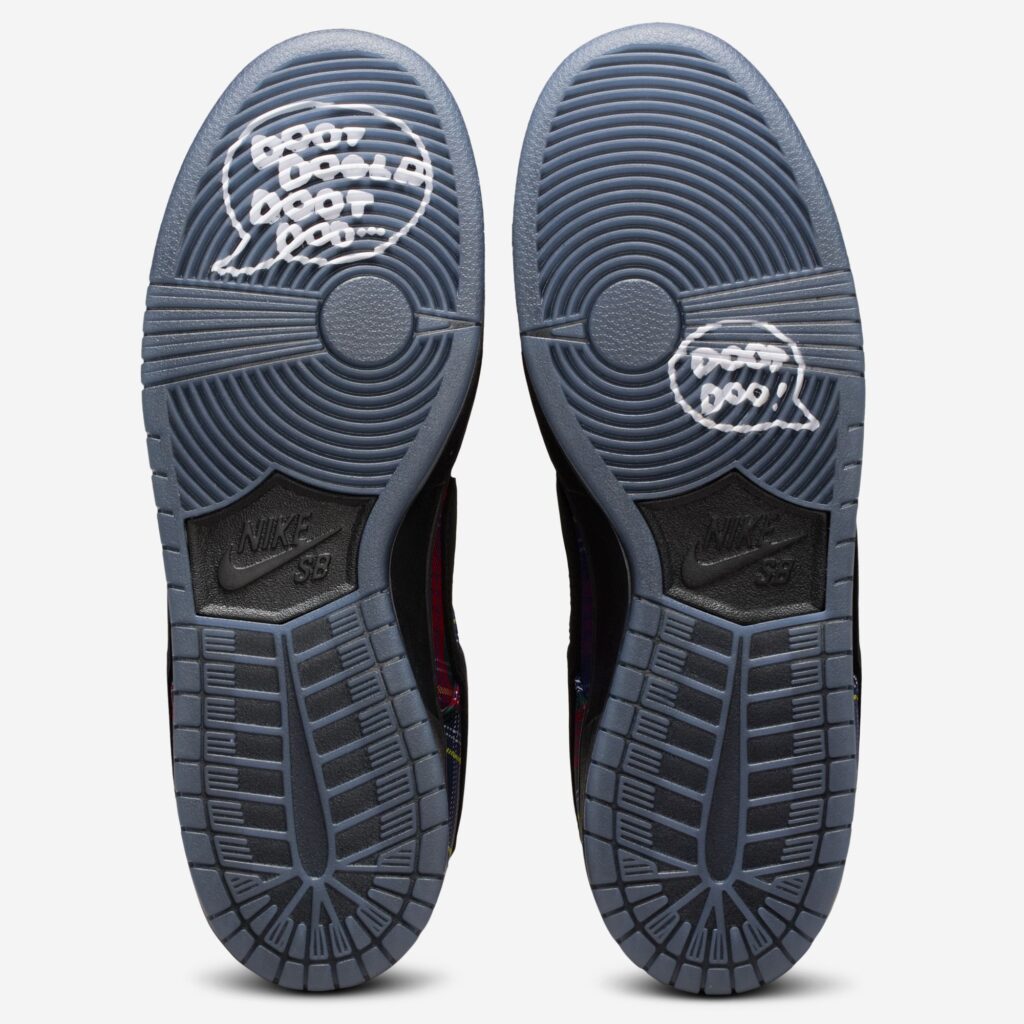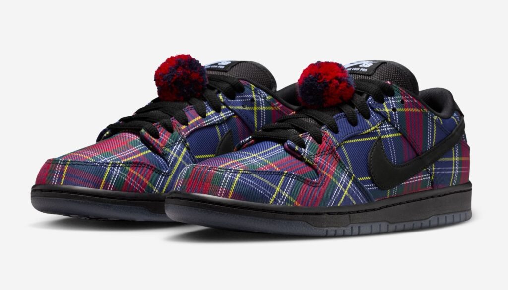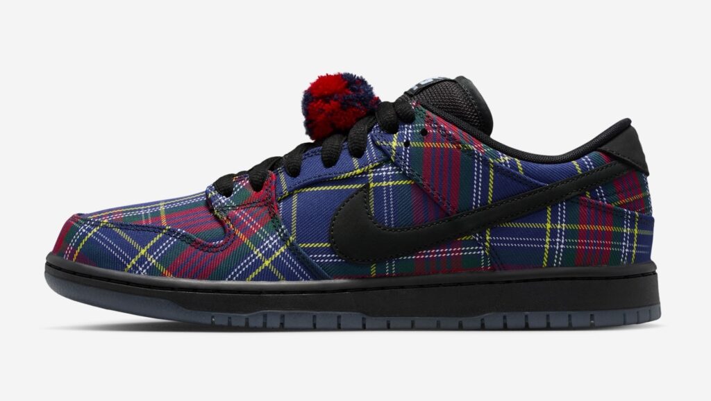 Nardwuar’s SB Dunk Low is covered in tartan print, like many pieces in Nardwuar’s wardrobe, including his signature tam o’ shanter cap and Nike Air Max Plus sneakers. Other details on the shoe include a black Swoosh and midsole, a pom-pom lace attachment and four extra lace options, Nardwuar’s face printed on the insole, and his signature “Doot doola doot doo” sign-off on the heels and outsoles.