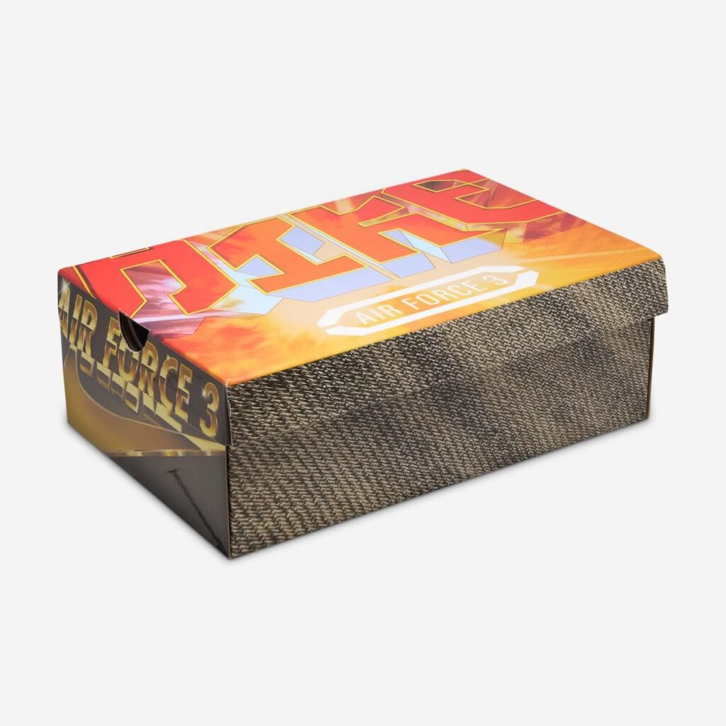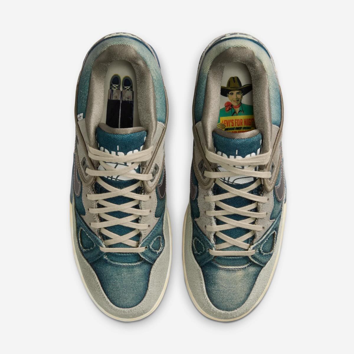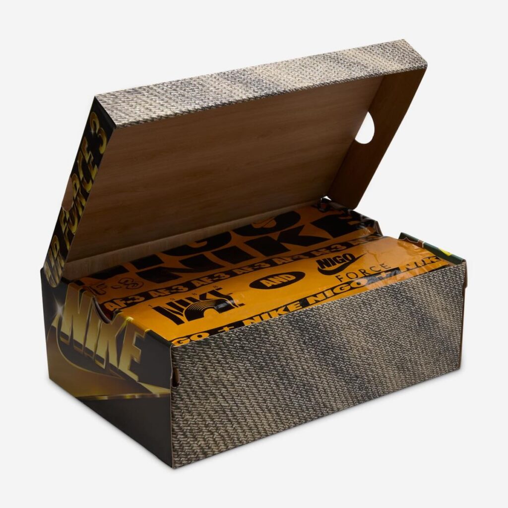 This triple collab marks the fourth drop in the NIGO x Nike Air Force 3 series, each telling a different story tied to NIGO’s roots and design DNA. The first drop, “Escape Force,” drew inspiration from NIGO’s childhood and the tokusatsu TV shows like Super Sentai he would watch growing up. The second drop, “Ape Force,” featured hairy “Baroque Brown” and “Beige” colorways paying homage to The Planet of the Apes, the main source of inspiration for A BATHING APE. Drop 3 included two blinged-out colorways inspired by NIGO’s love of old-school hip-hop. With this fourth drop, NIGO showcases his love for vintage Levi’s, which he previously explored with his own Levi’s denim collaboration in 2021. All of these themes come together on the NIGO x Nike Air Force 3 box, with each side covered in graphics representing a different drop.