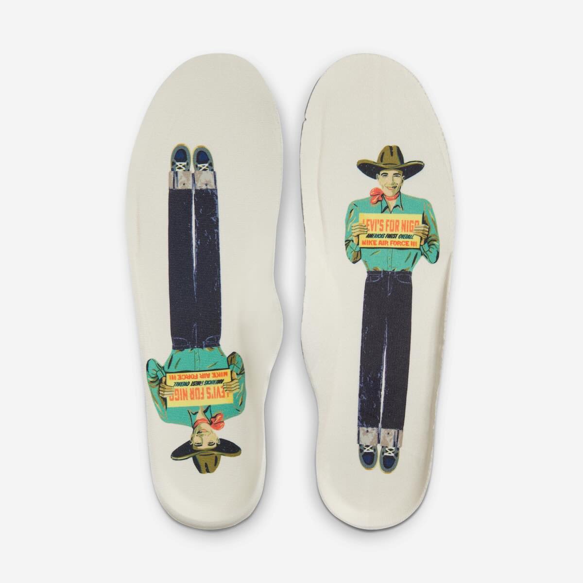 Both sneakers come equipped with metallic lace dubraes etched with “Force” branding, co-branded Levi’s tags stitched to the side panels, and graphic insoles featuring artwork from vintage Levi’s ads for a dose of Americana. On the heels, sneakerheads will spot a split-brand design: “Nike Air” on one side and “NIGO Force” on the other (“OGIN Force” on pairs released in China and other regions). There’s also speculation about a third “Bamboo” colorway (HQ0261-200), though photos and details have yet to be revealed.