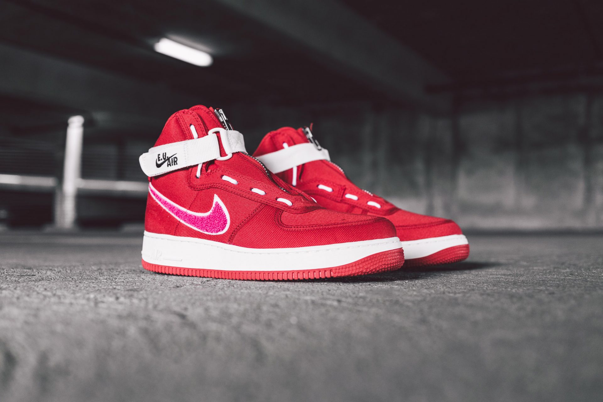 The Nike x EU partnership has birthed a beautiful pair of AF1s dressed in a red canvas upper with a contrasting pink carpet Swoosh and white accents. The real dope feature of the Nike x EU AF1 is the removable zippered lace cover – you could throw that bad boy on and rock no laces if you wanted to. Check out some detailed images below and let us know if you copped this morning. Retail is $160, peace!