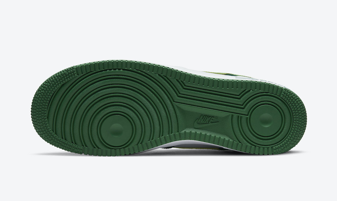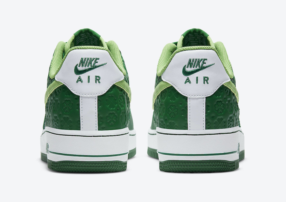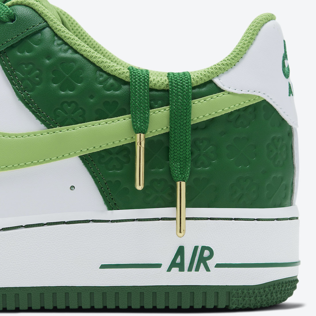 The Air Force 1 comes in full leather with a similar double green colorblocking. Dark green covers the majority of the shoe and with the rear heel area imprinted with the same four-leaf clover pattern. Light green toe box, Swooshes, and sockliner contrast the gold accents on the lace aglets, dubraes, and insole logos.